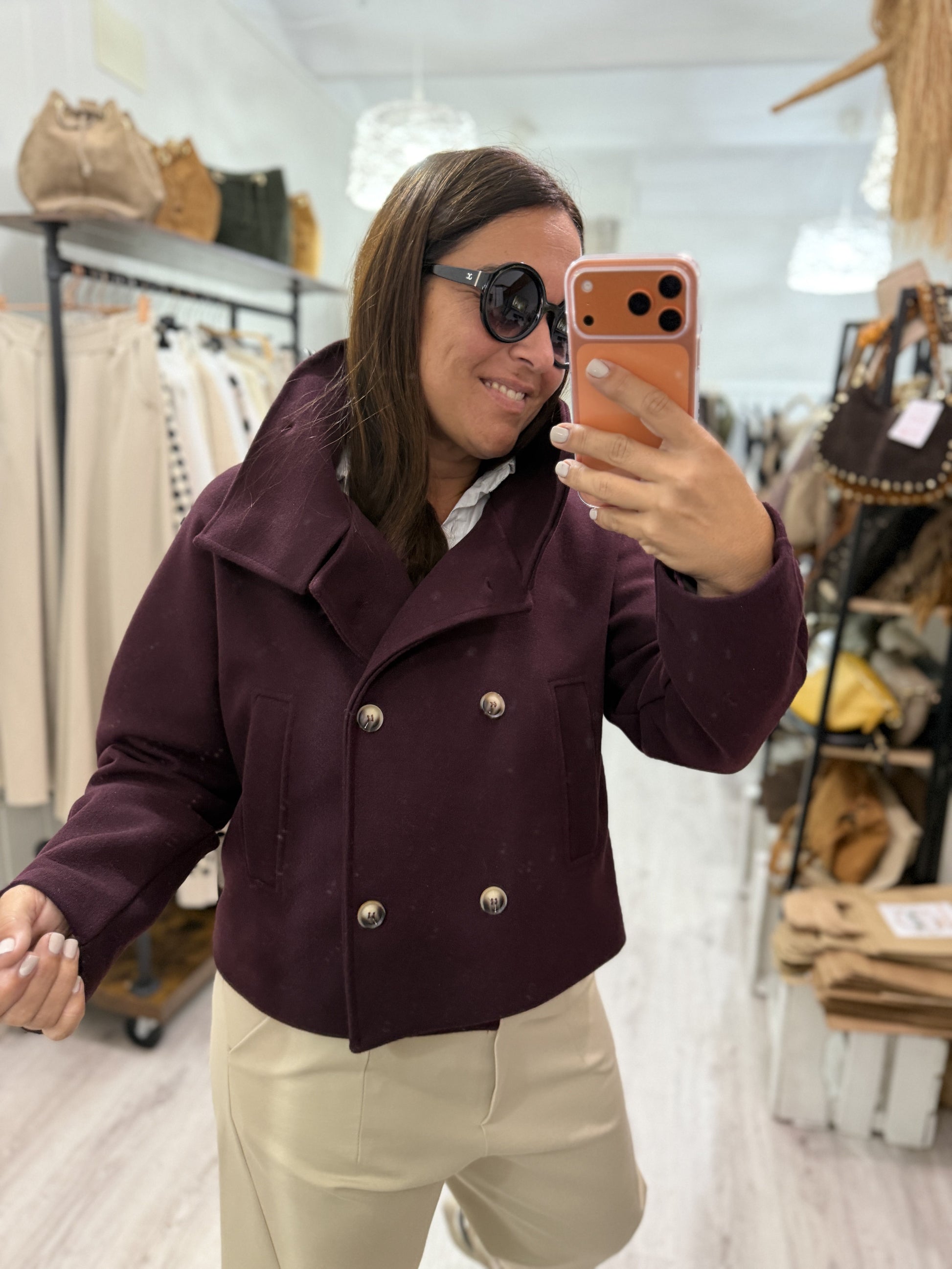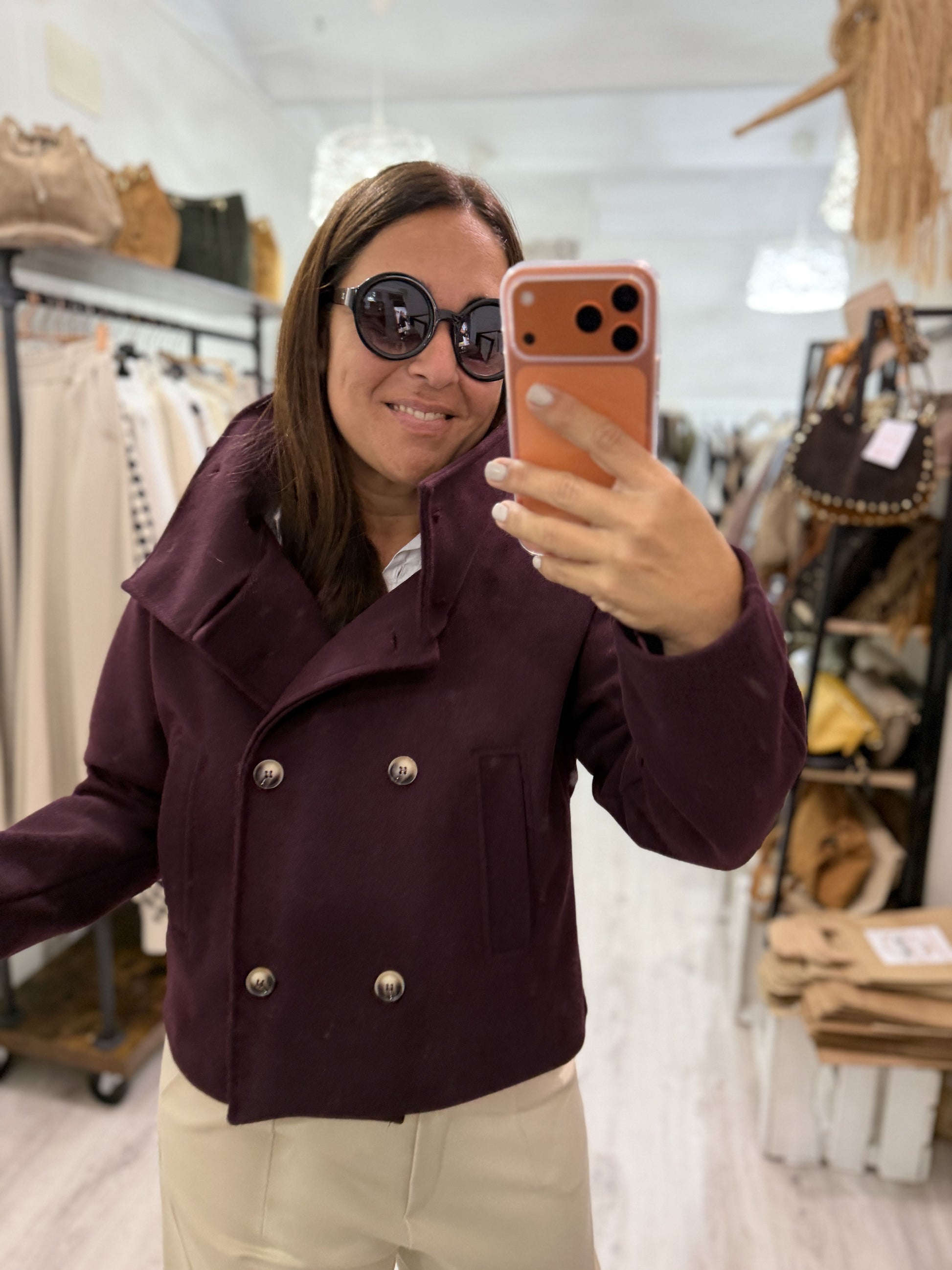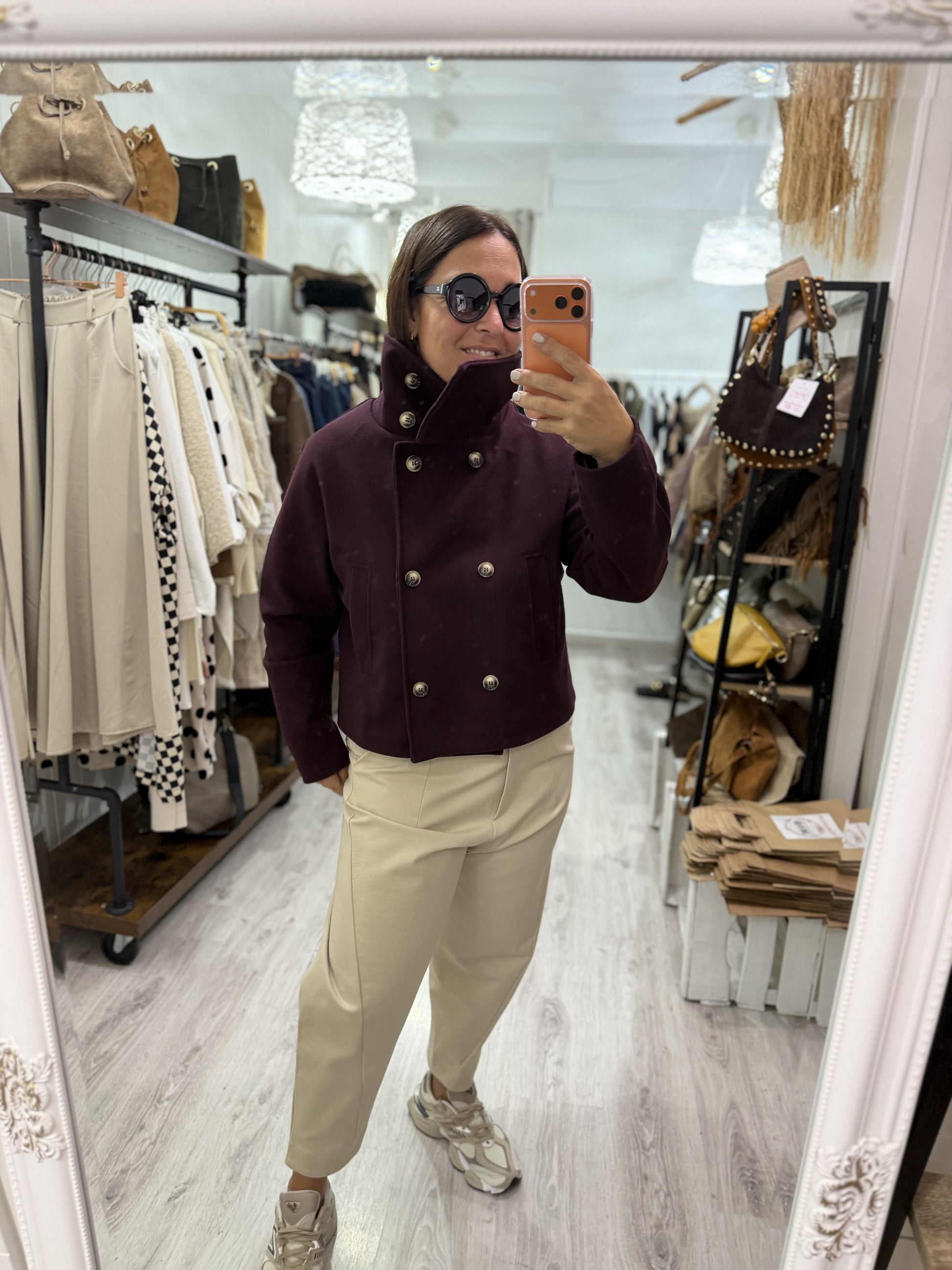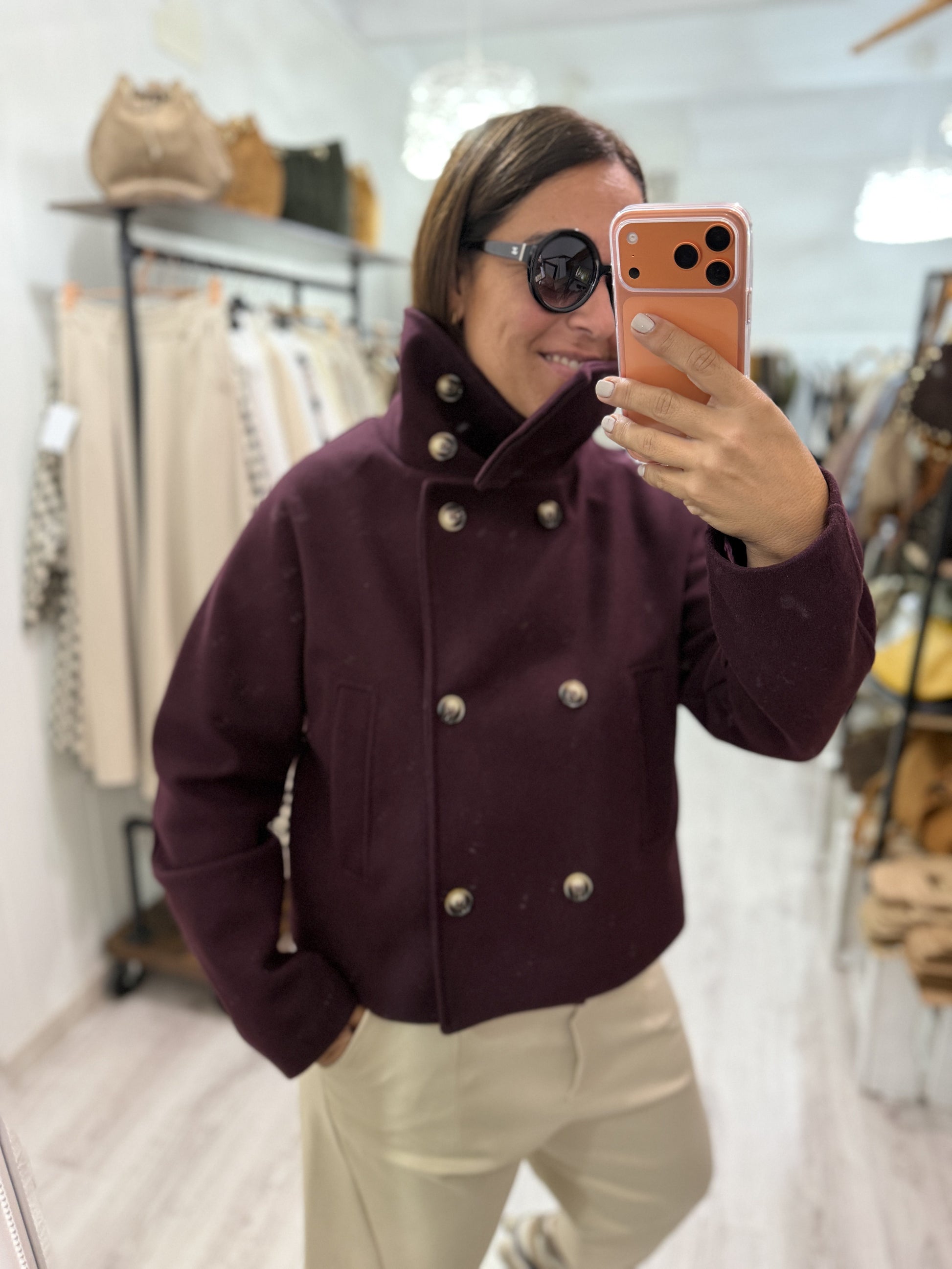 De paño, con cuello chimenea, manga larga y bolsillos.