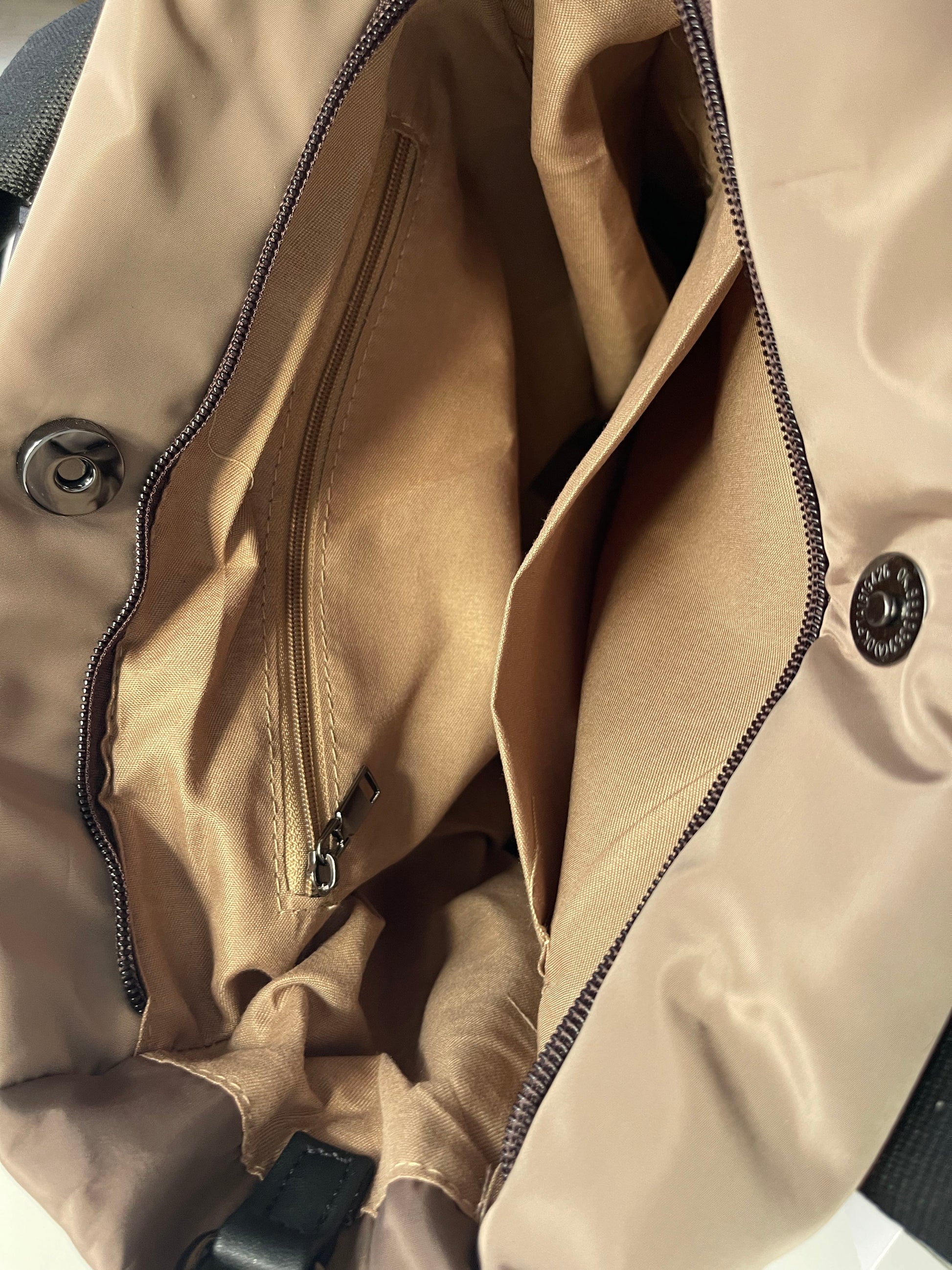 Con multitud de compartimentos cerrados con cremallera, y compartimentos interiores con cremallera y bolsillos.