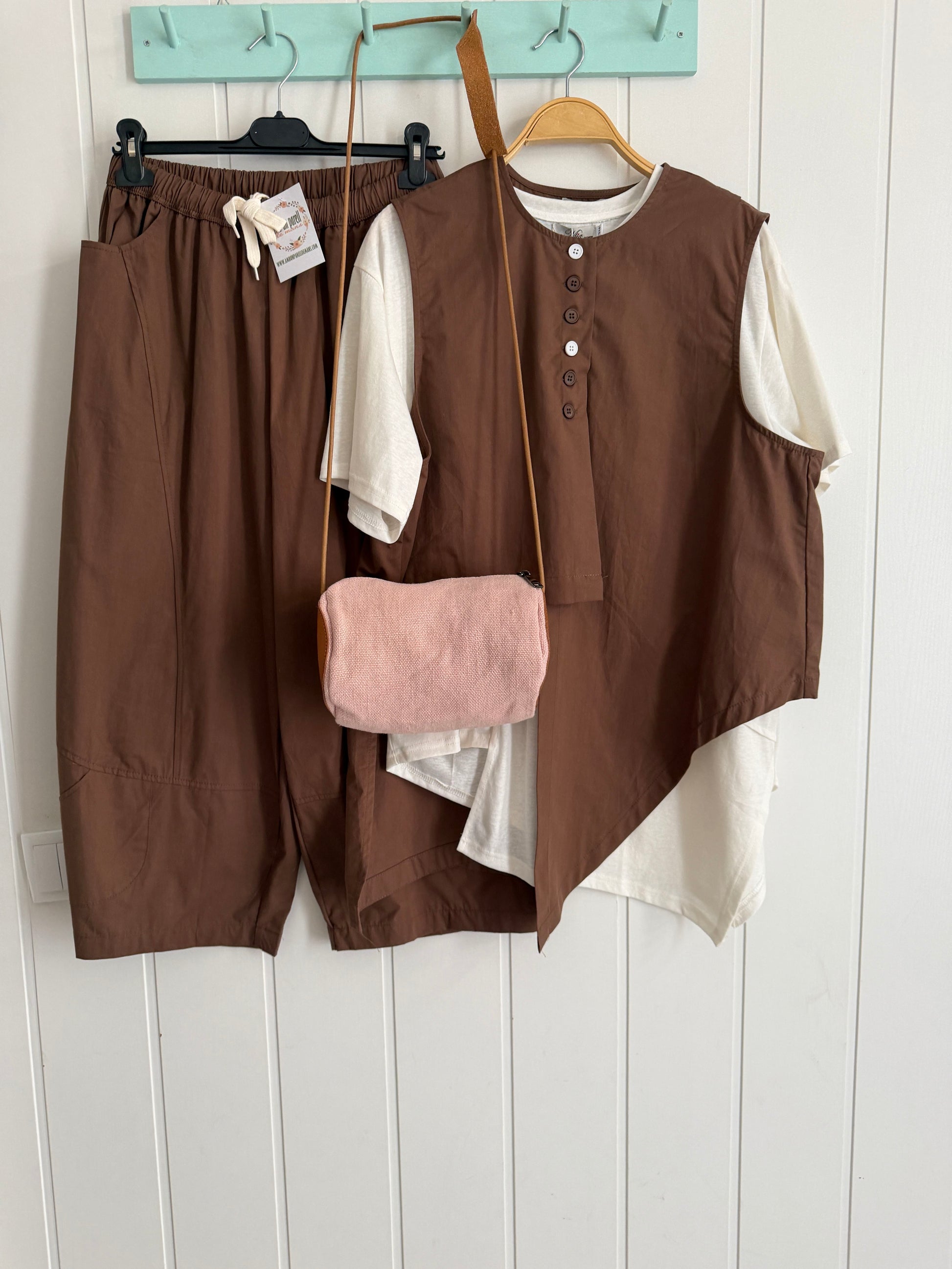 Bolso en lino de algodón y con laterales cilíndricos de piel.