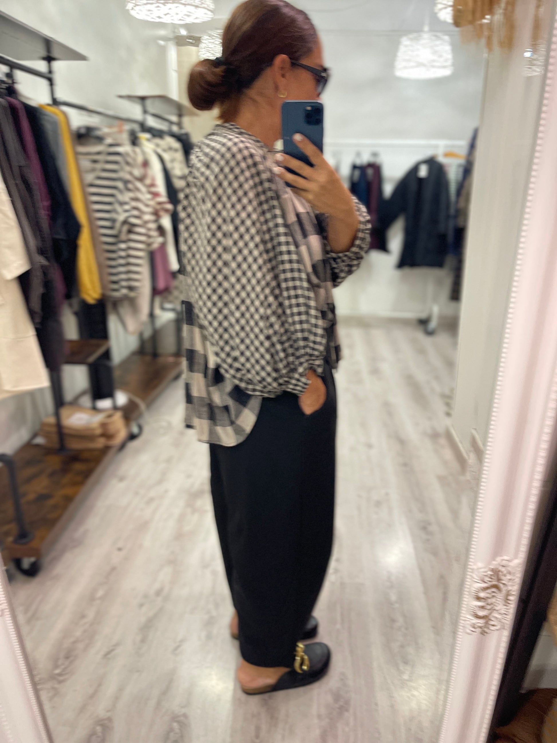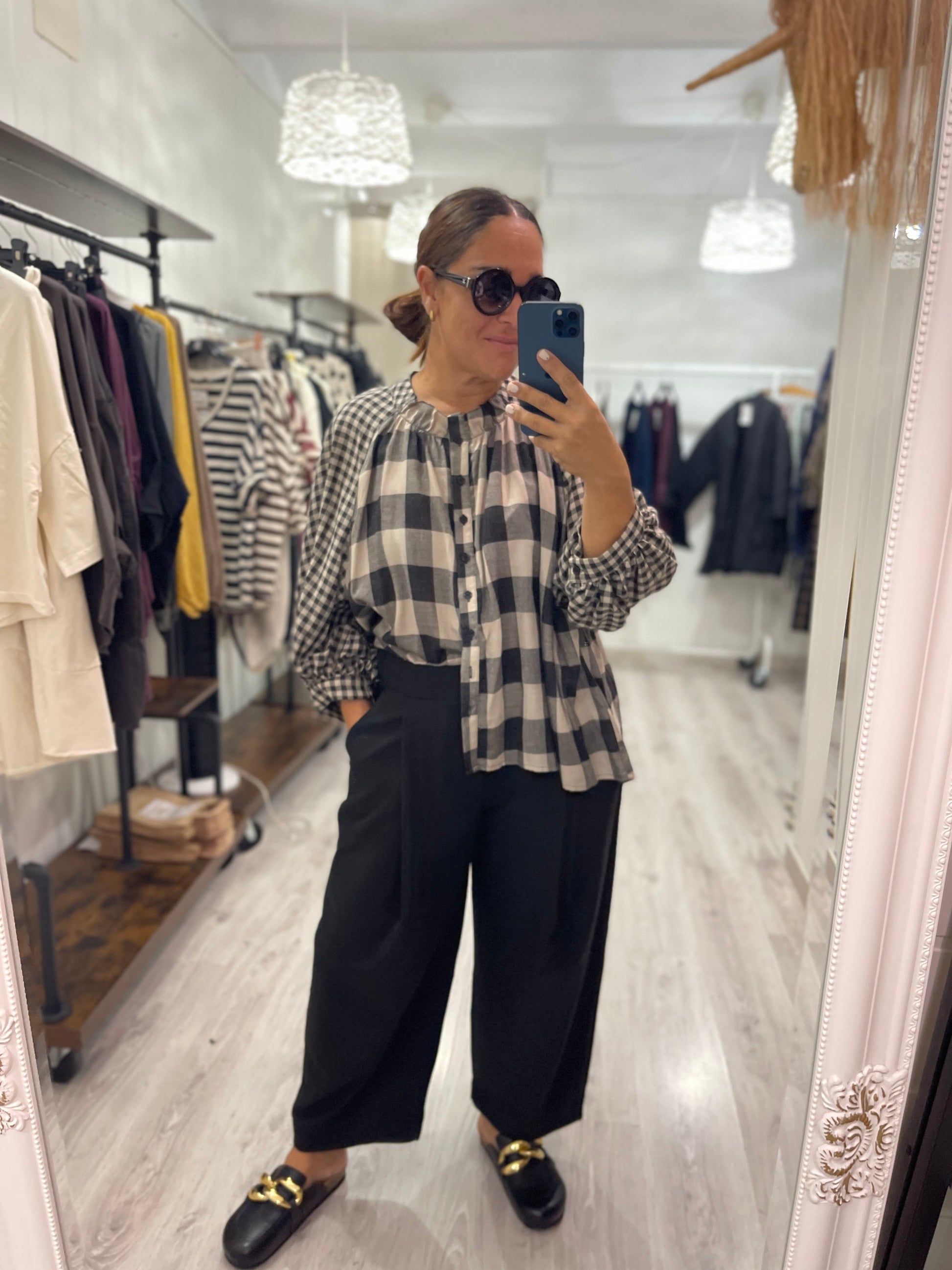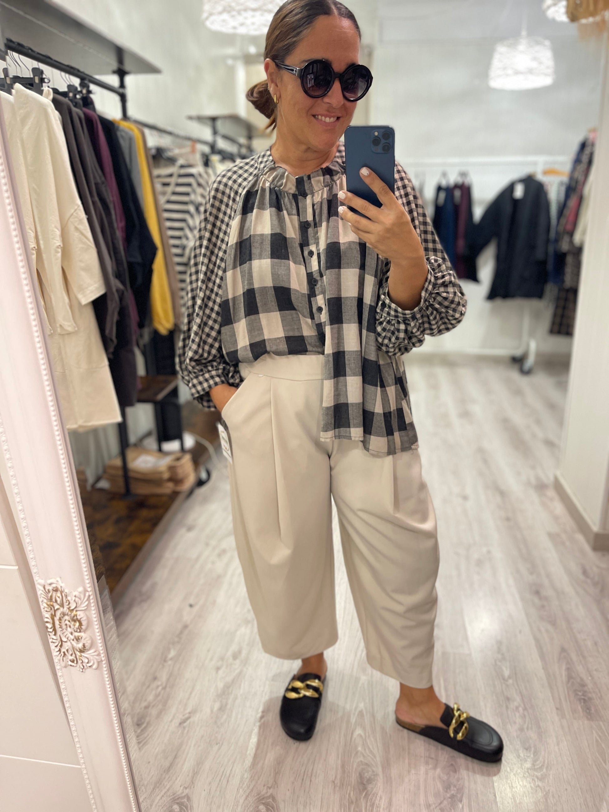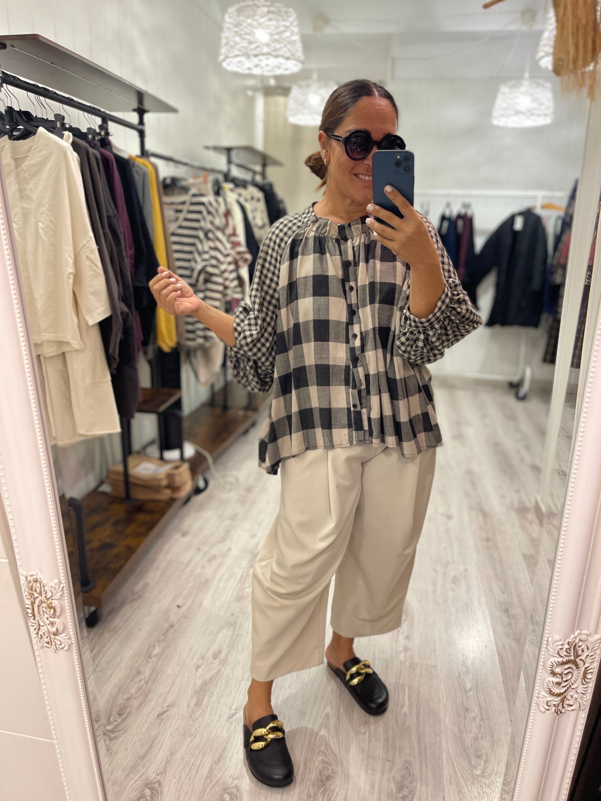 Evasée, ligeramente oversize, combina 2 tipos de cuadros en mangas y cuerpo.