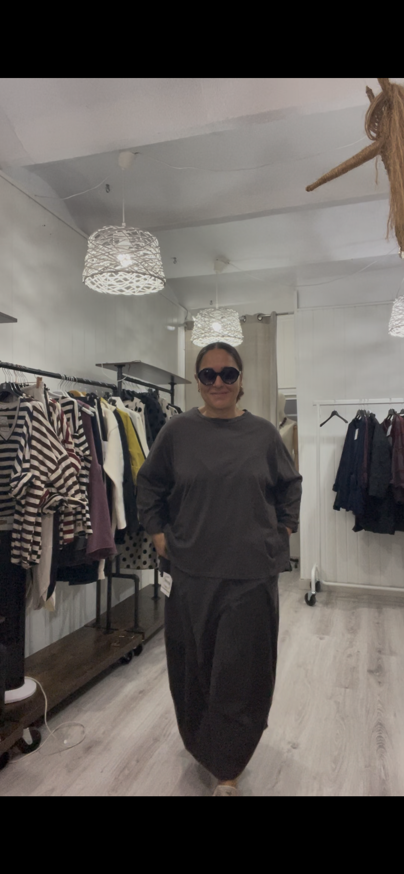 Cuello redondo, manga larga, corte oversize, con parte trasera combinada en micropana y rematada con volante.