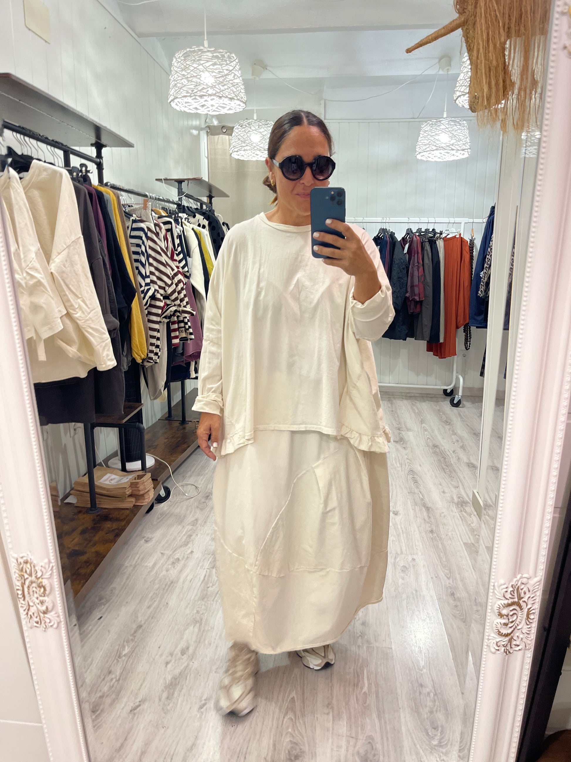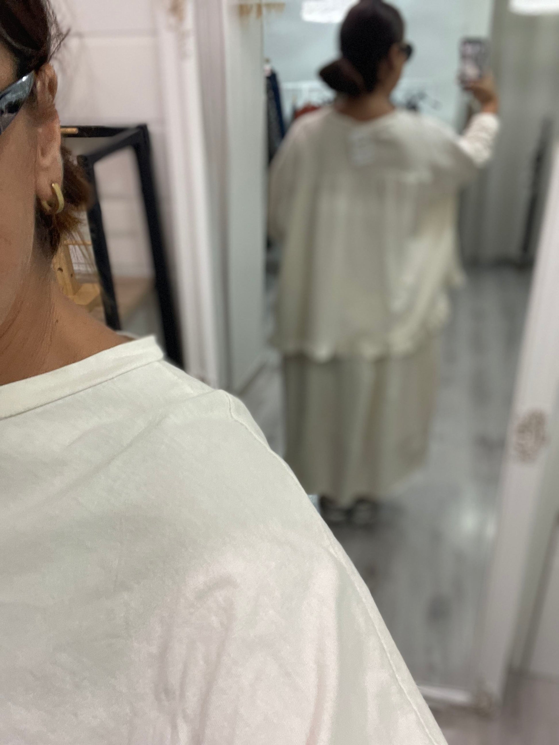 Cuello redondo, manga larga, corte oversize, con parte trasera combinada en micropana y rematada con volante.
