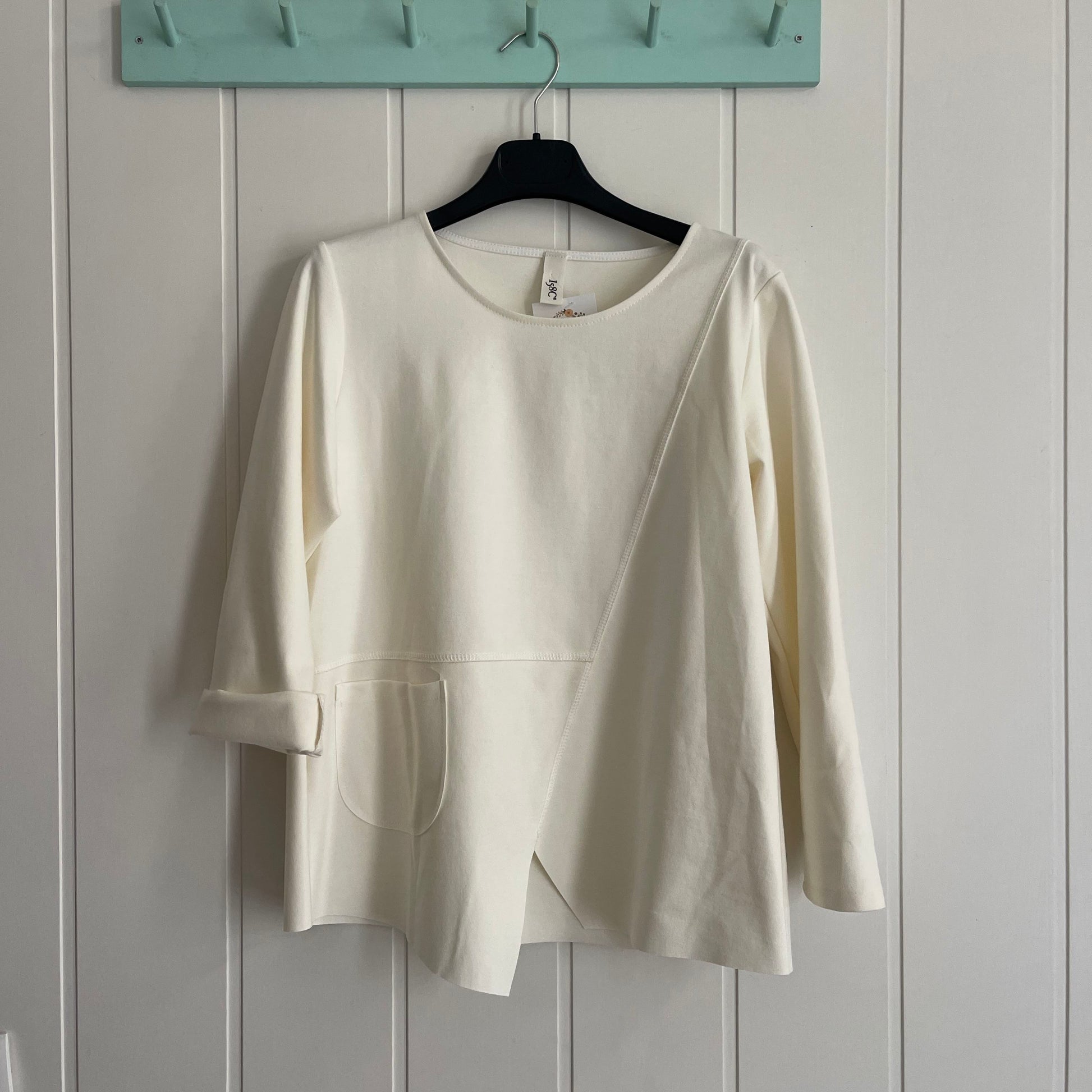 Tejido en punto roma, con cuello redondo, manga semilarga, bajo con pico cortado y con un bolsillo.