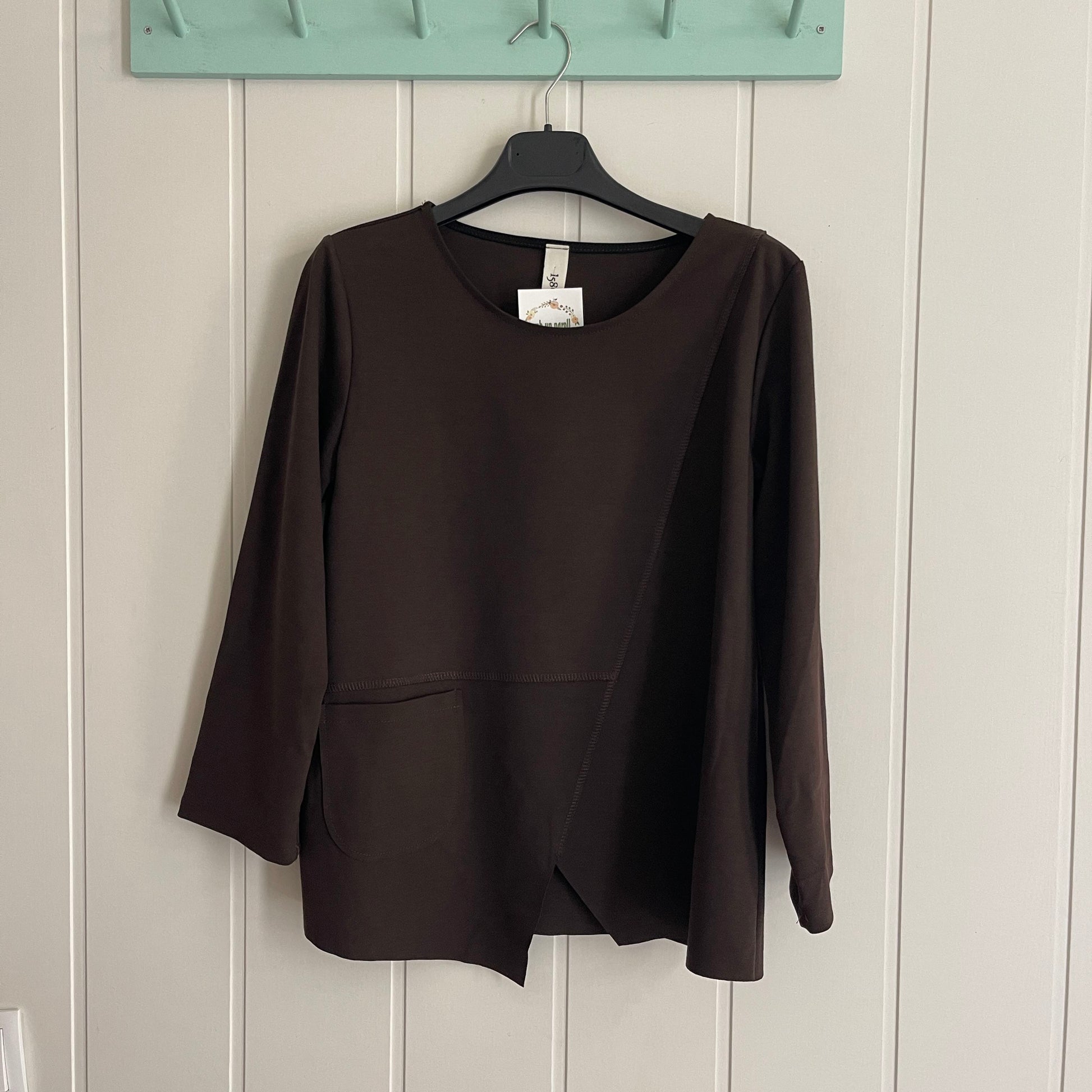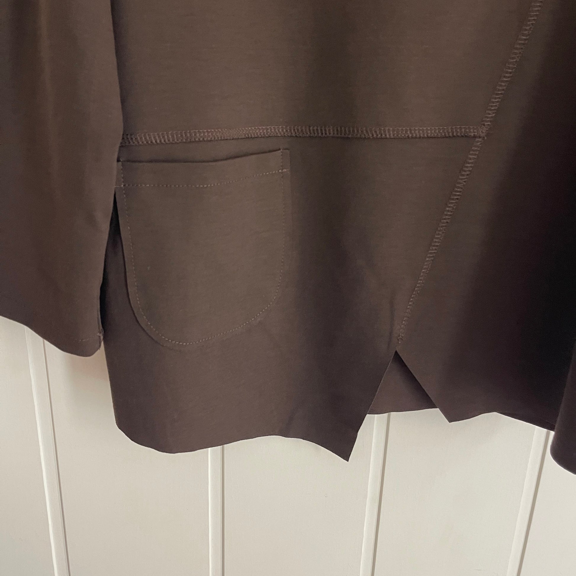 Tejido en punto roma, con cuello redondo, manga semilarga, bajo con pico cortado y con un bolsillo.