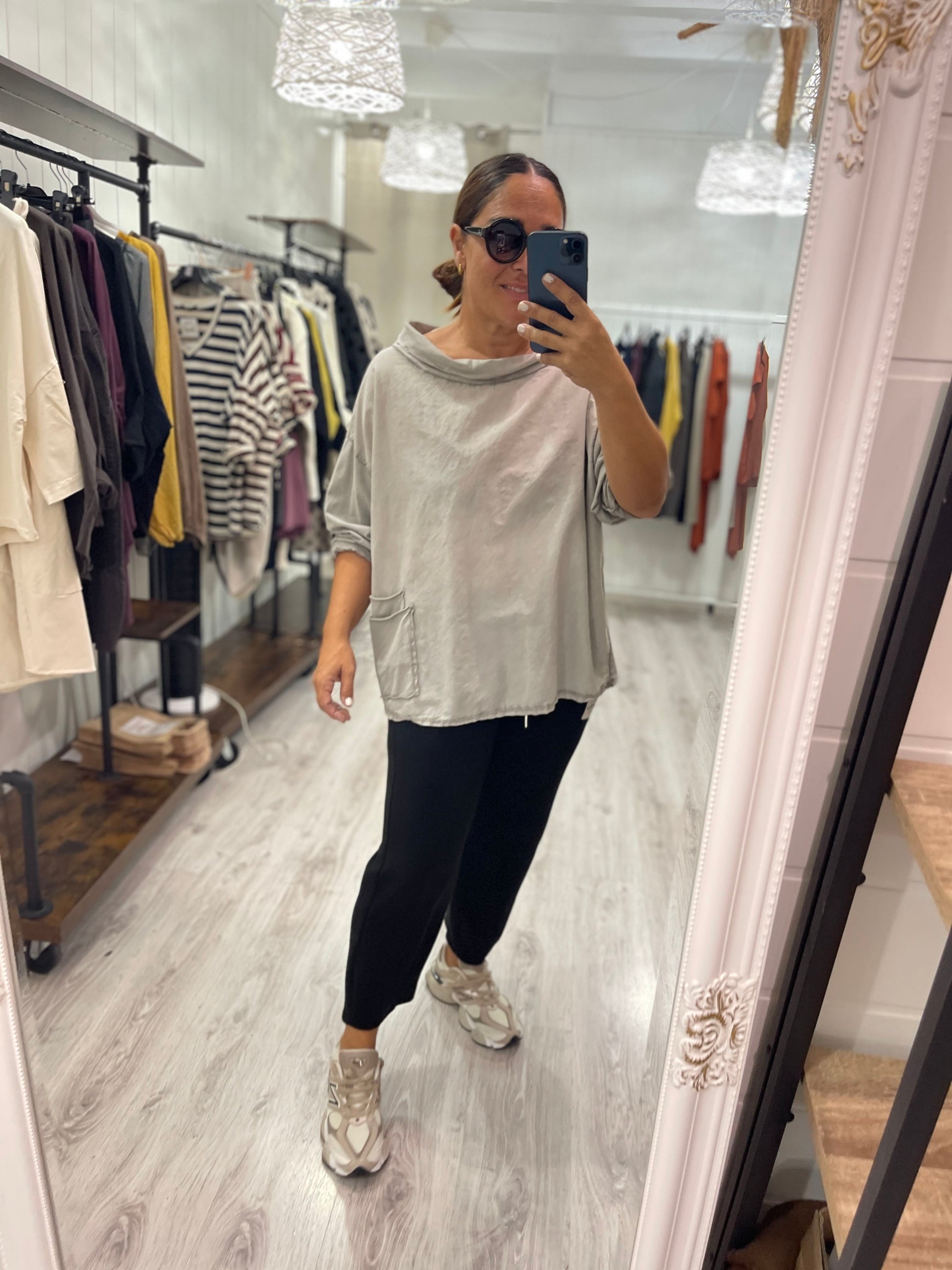 Con cuello barco vuelto, manga larga, y con detalle de 2 bolsillitos en el bajo.