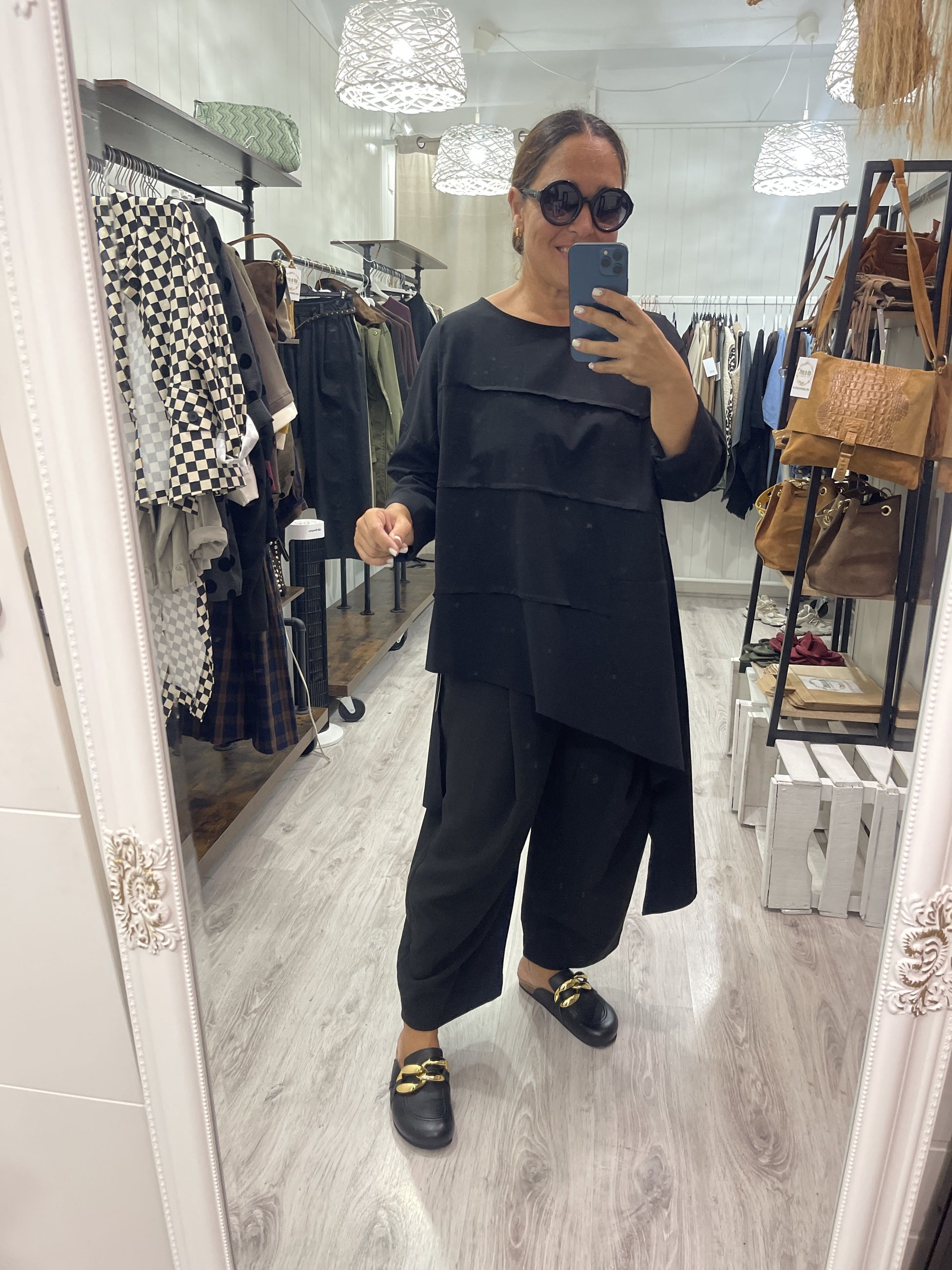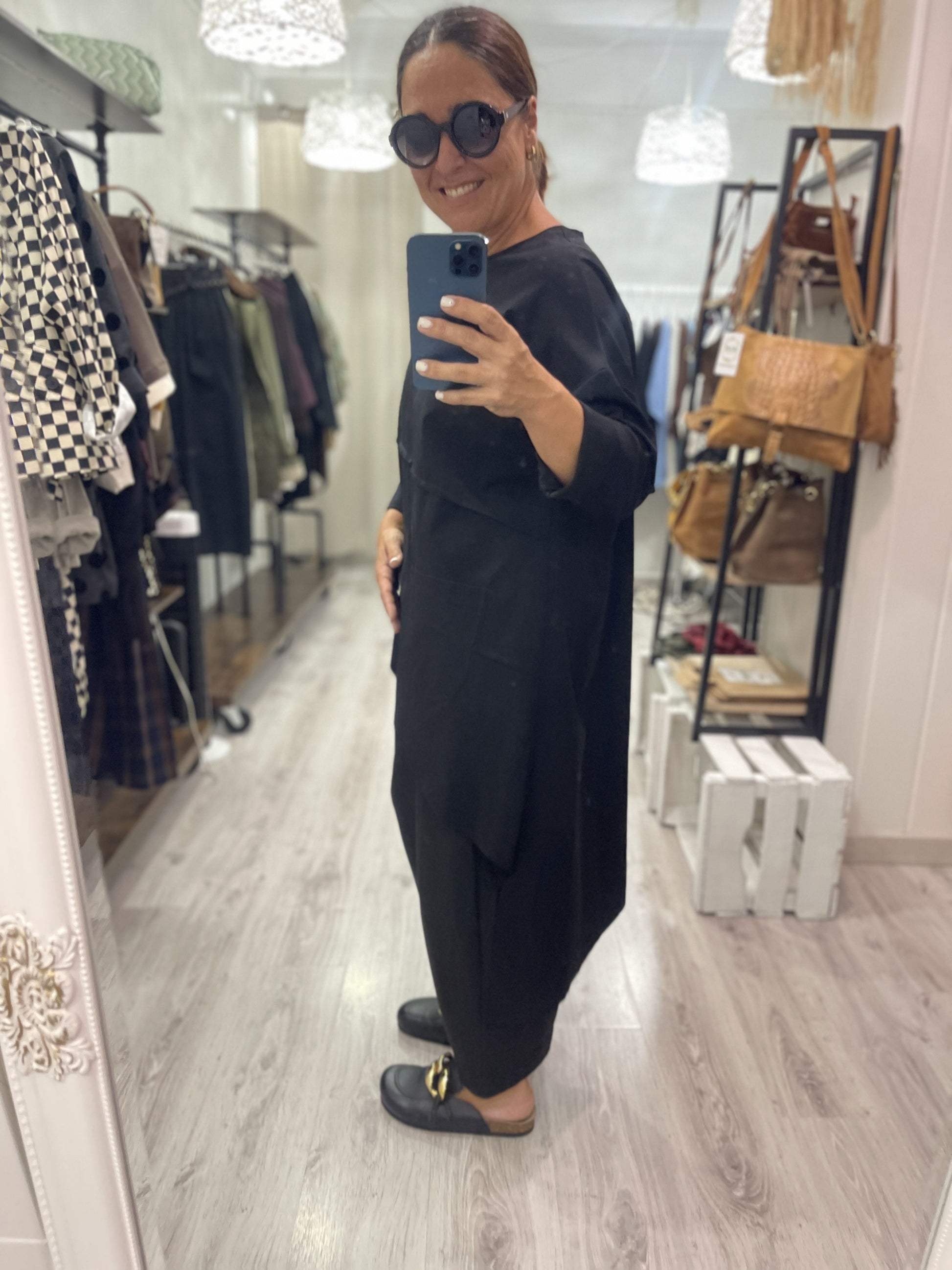 Oversize, con cuello redondo, irregular, con costuras en diagonal y con un bolsillo en un lateral.
