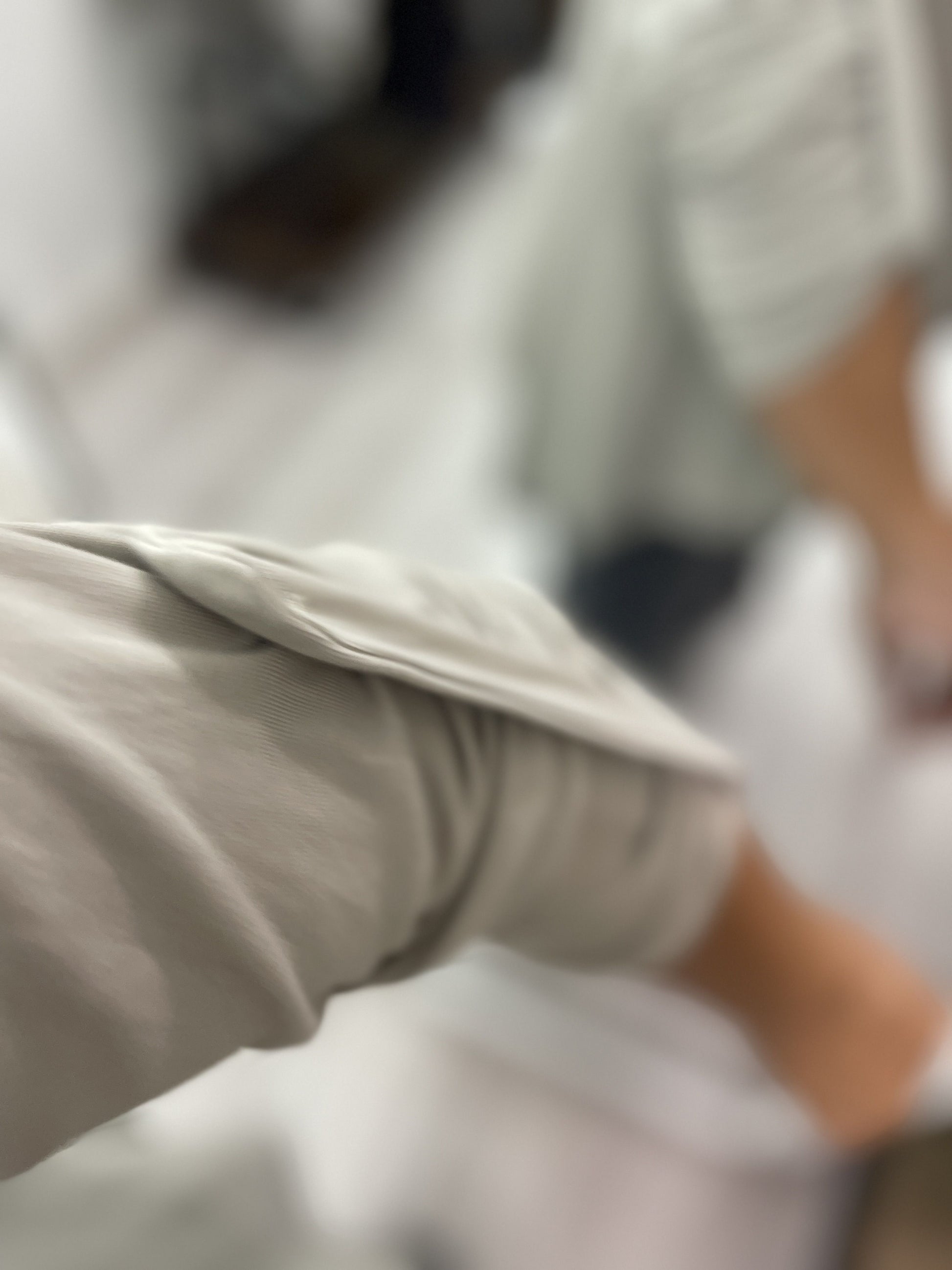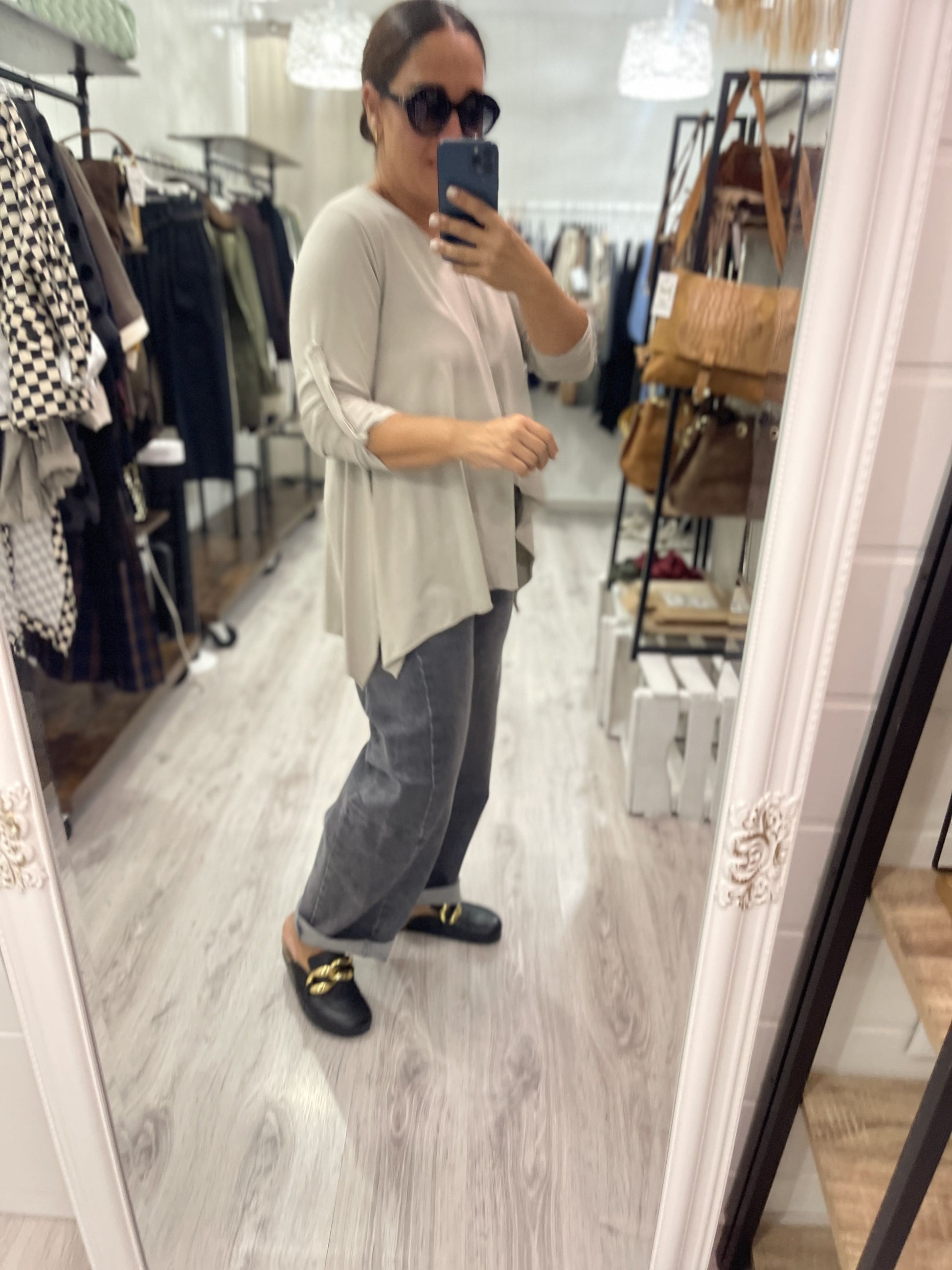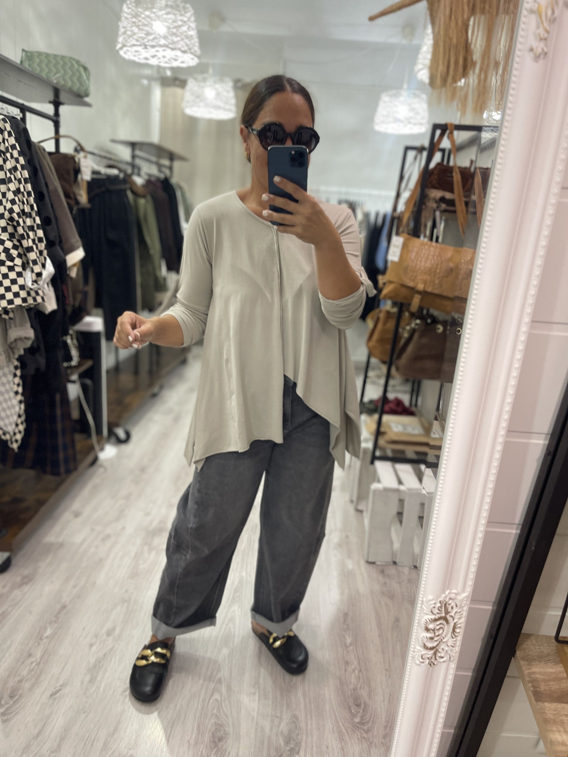 Cuello redondo, manga larga ajustable con cinta y botón al brazo, desigual en el bajo.