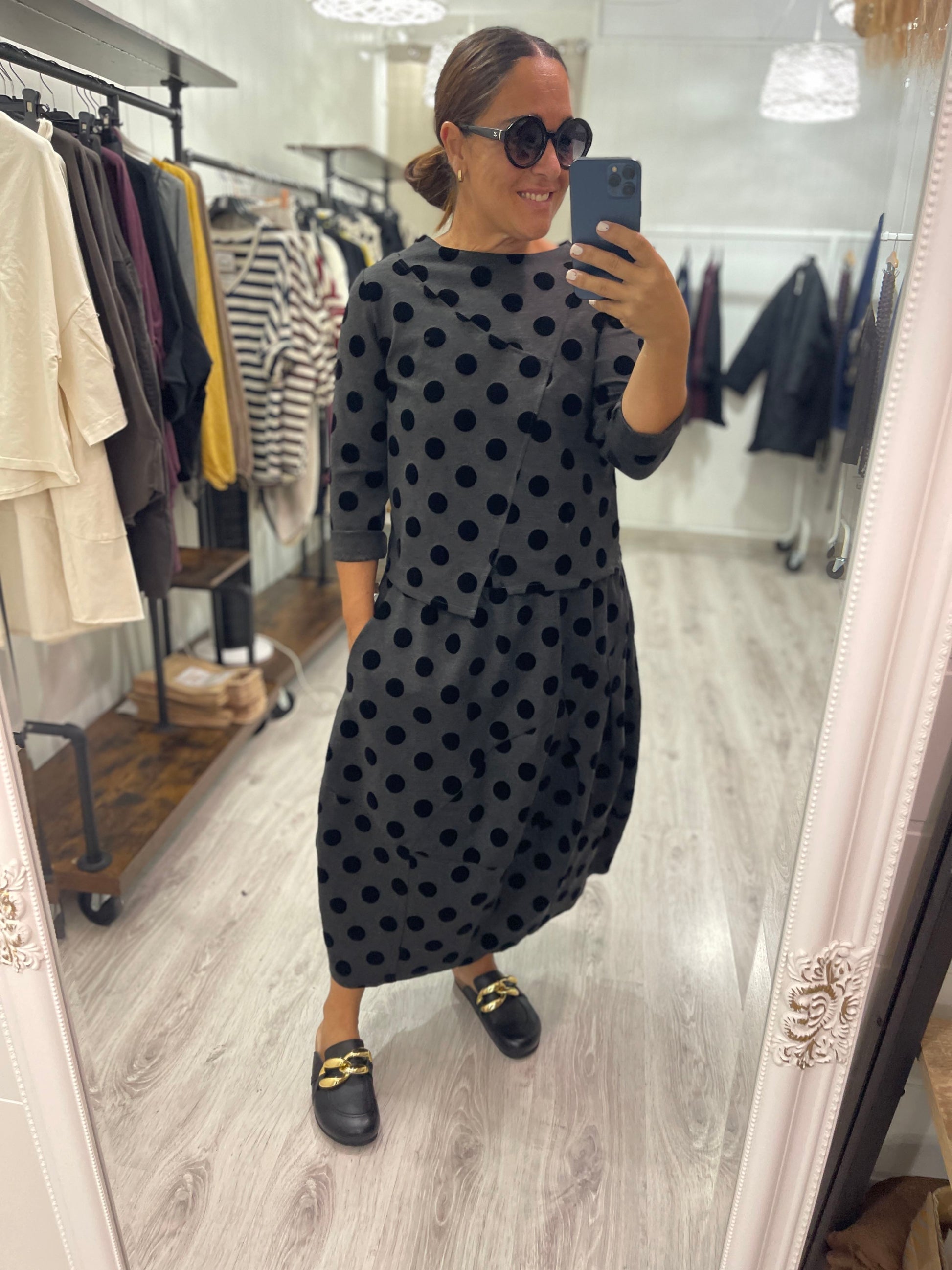 Con cuello redondo, manga larga, con topos en relieve en tejido flocado, tipo terciopelo.