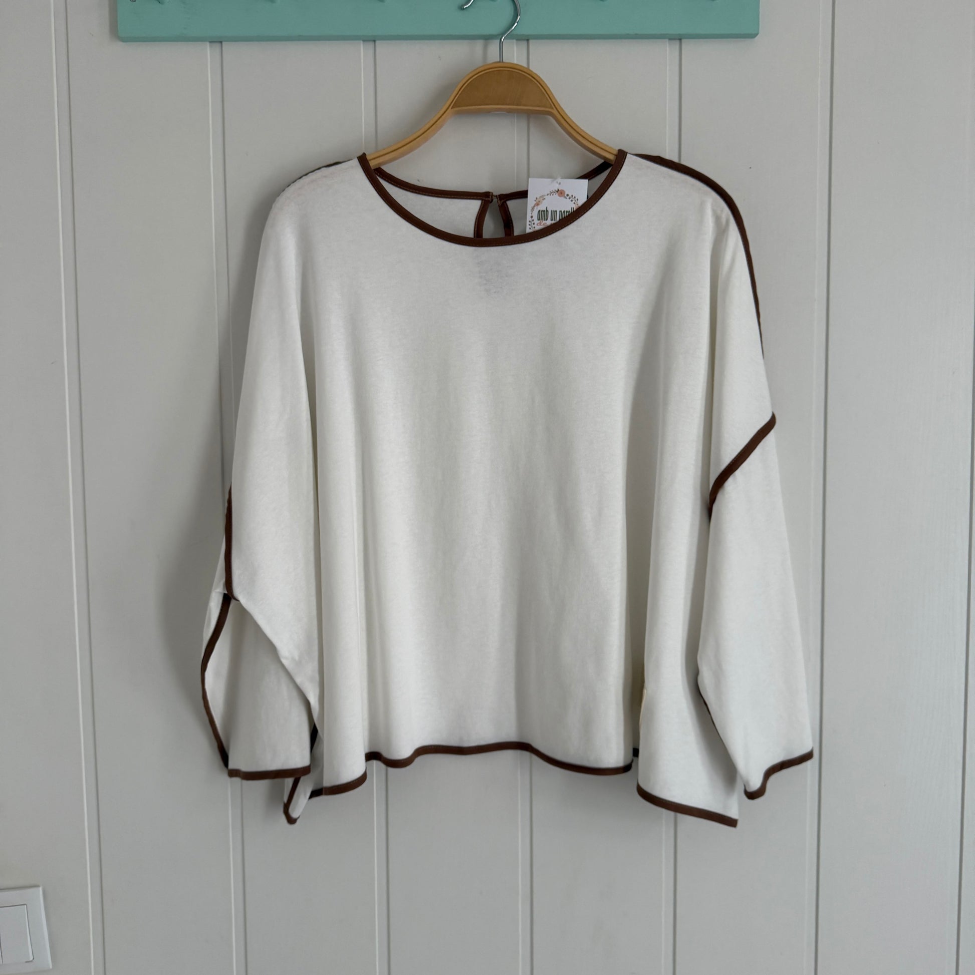 Cuello a la caja, con botón detrás, corte oversize, con borde en contraste.