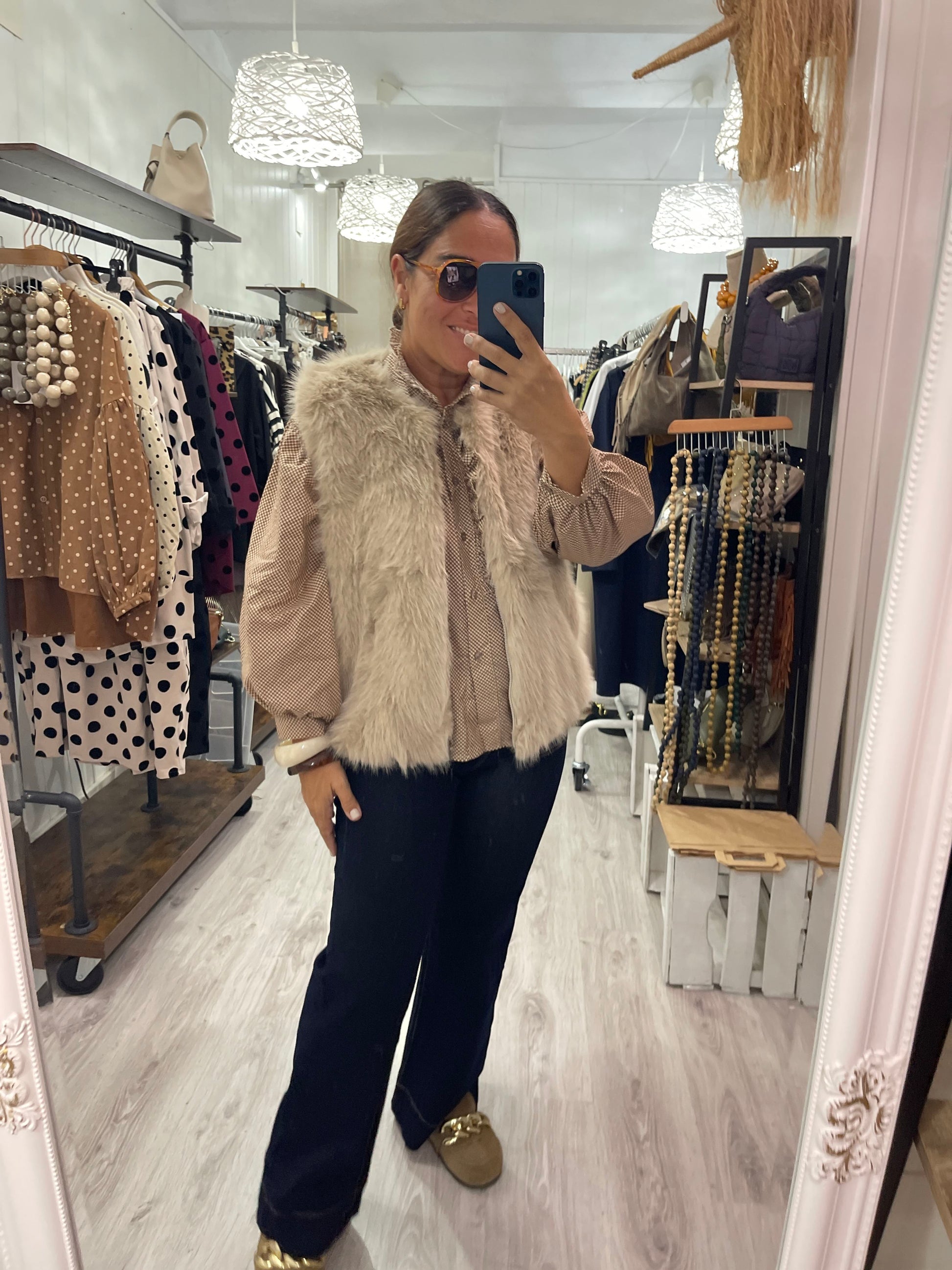 Con cuello redondo, cerrado con cremallera y con bolsillos escondidos.