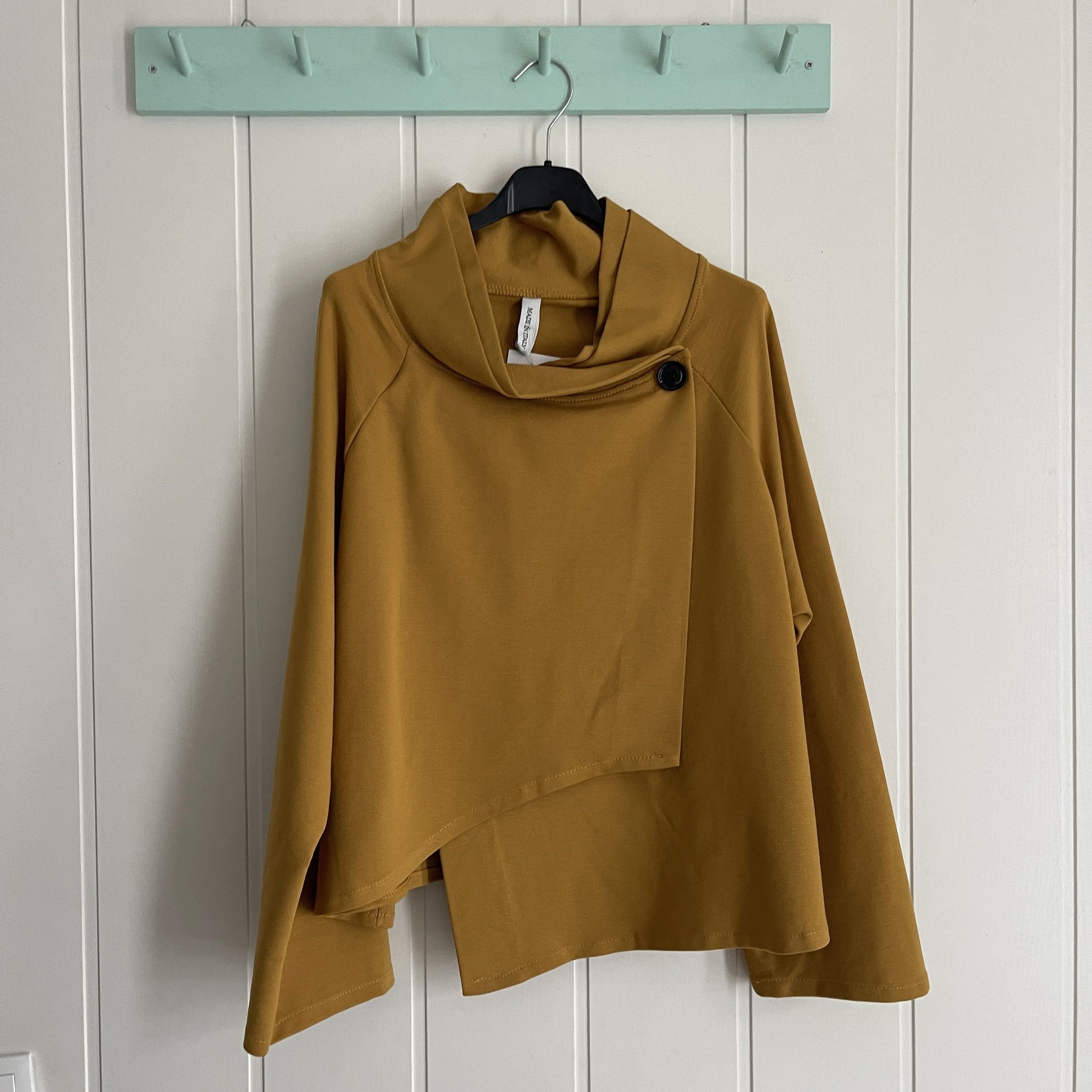 Con botón exterior e interior a los dos extremos del cuello, más larga de un lado que del otro, evasé, y manga larga.