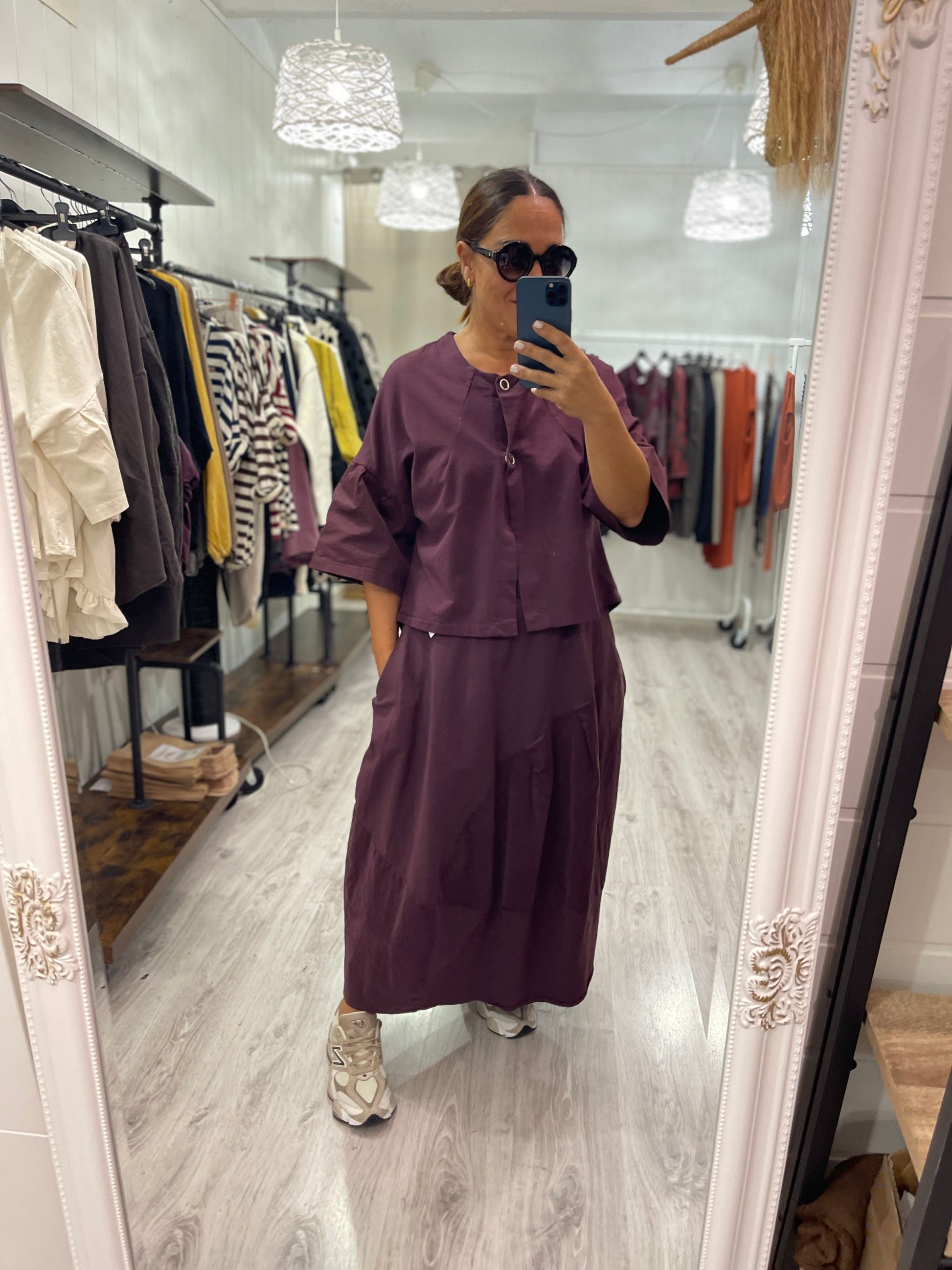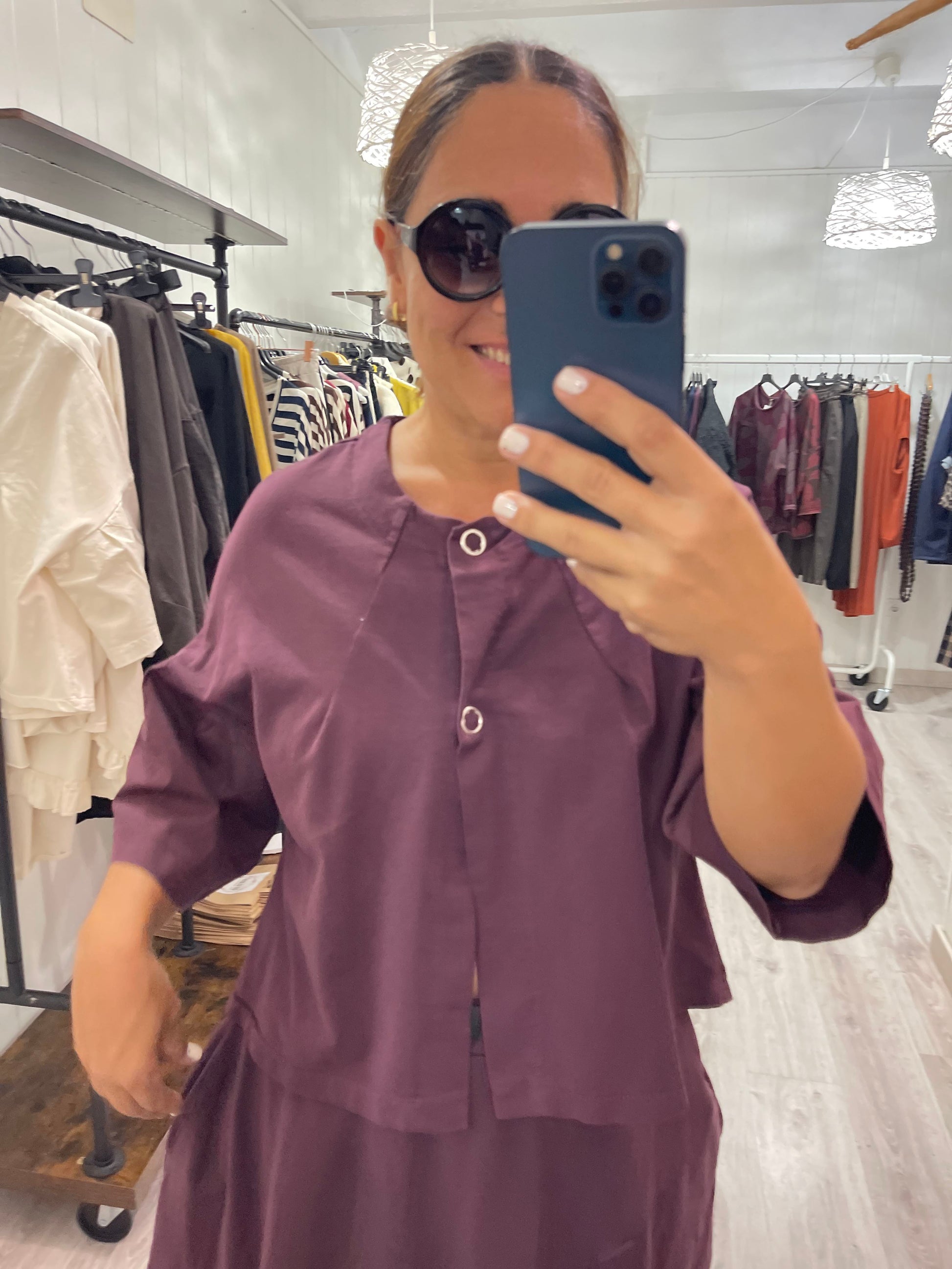 Cuello redondo, abotonada con dos automáticos en el frente, de corte ligeramente evasée y con manga acampanada 3/4.