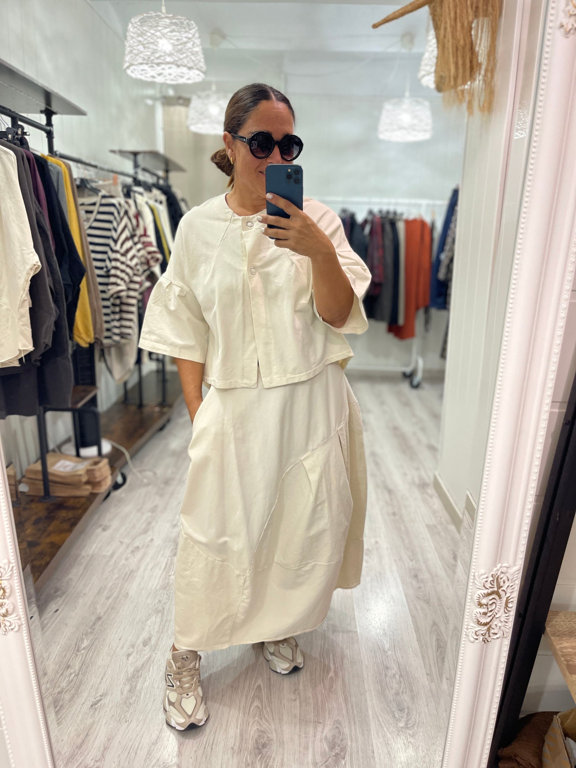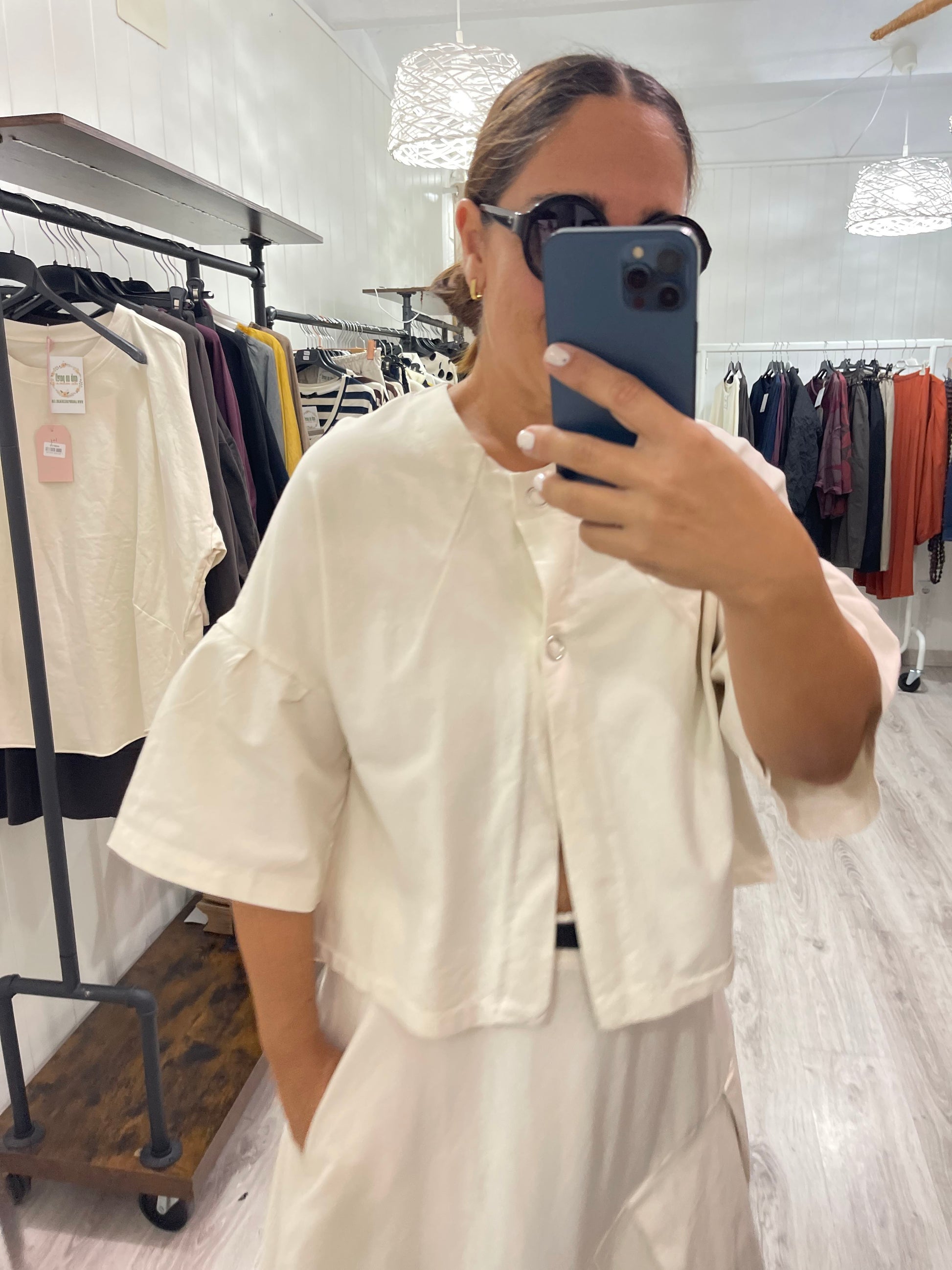 Cuello redondo, abotonada con dos automáticos en el frente, de corte ligeramente evasée y con manga acampanada 3/4.
