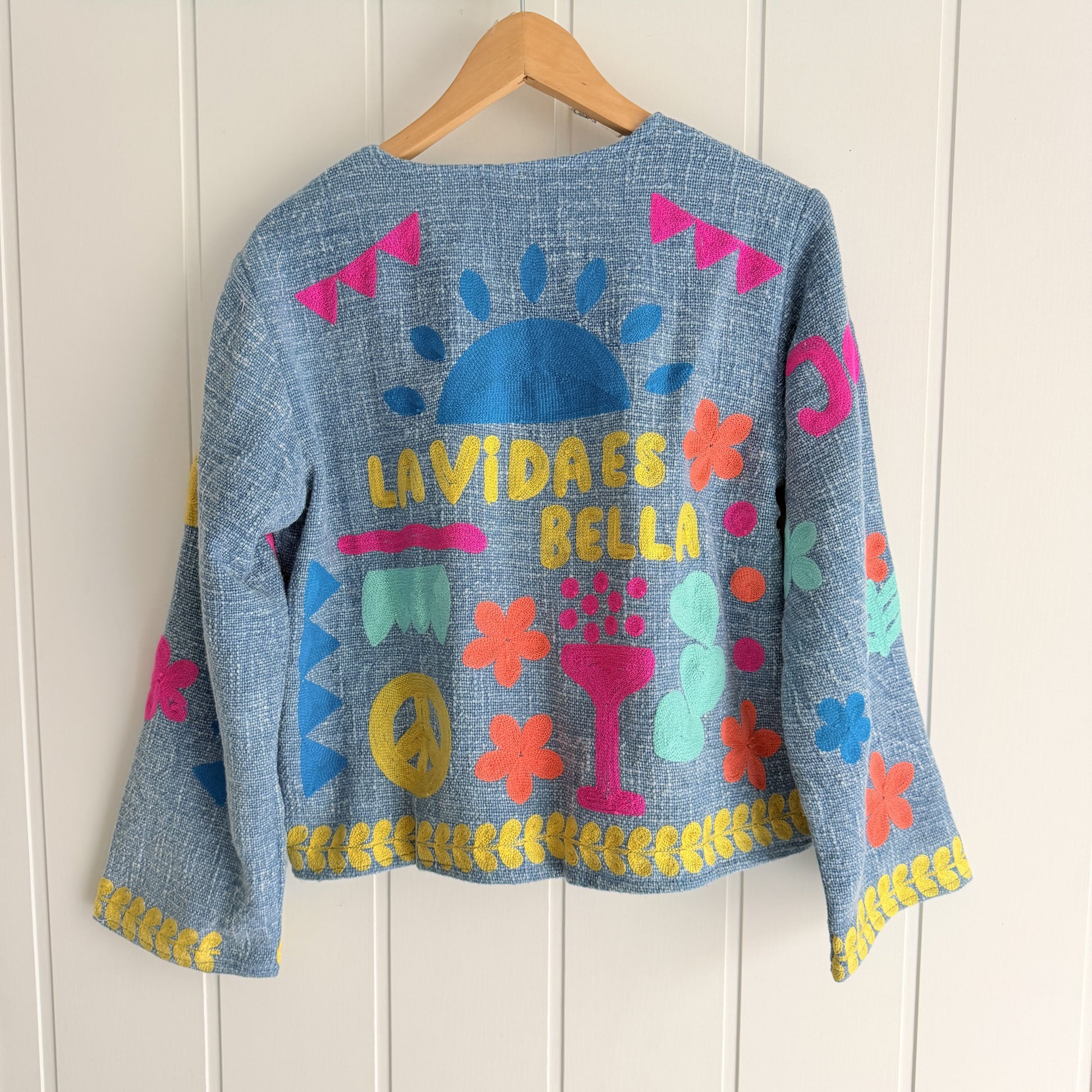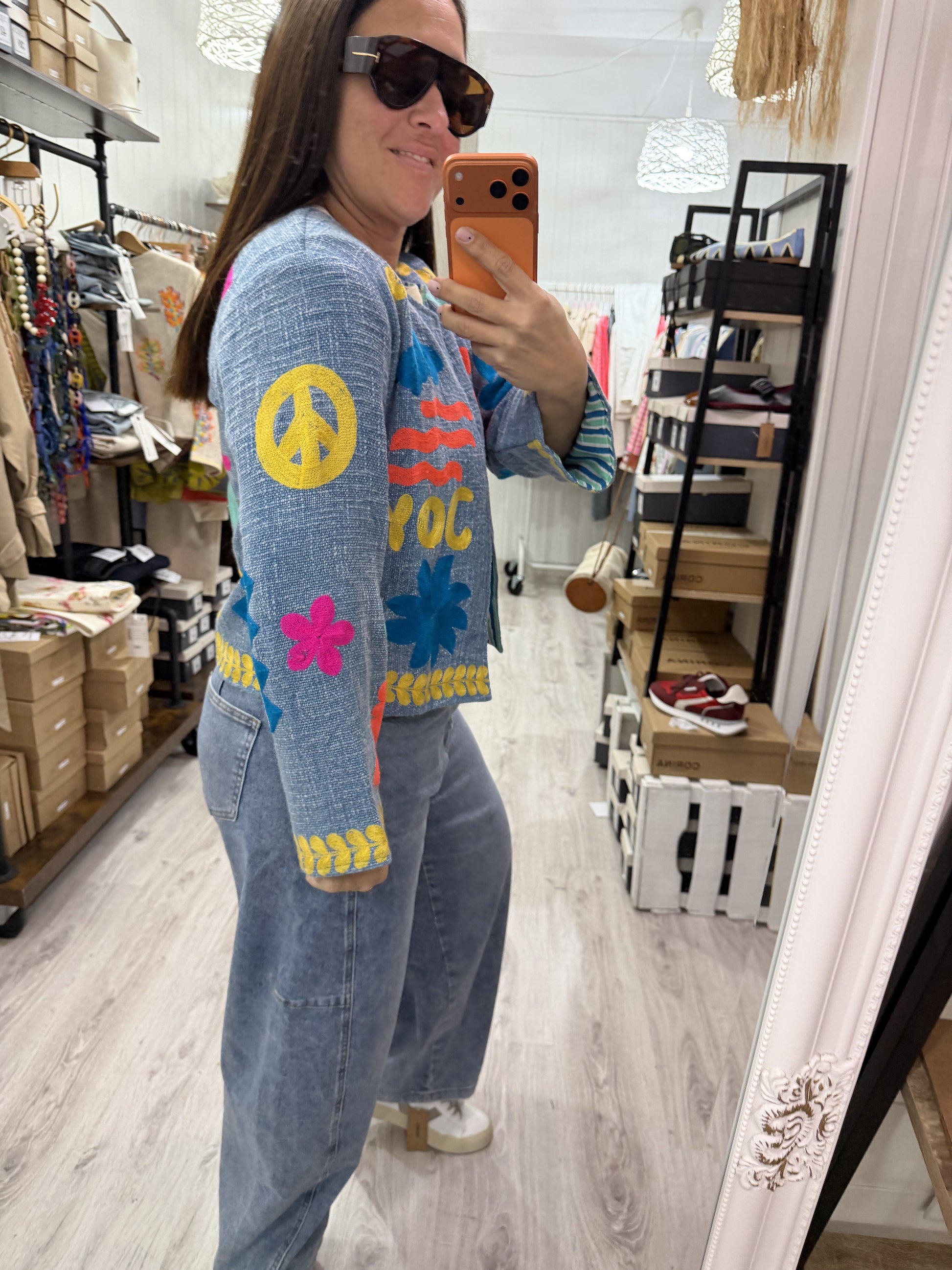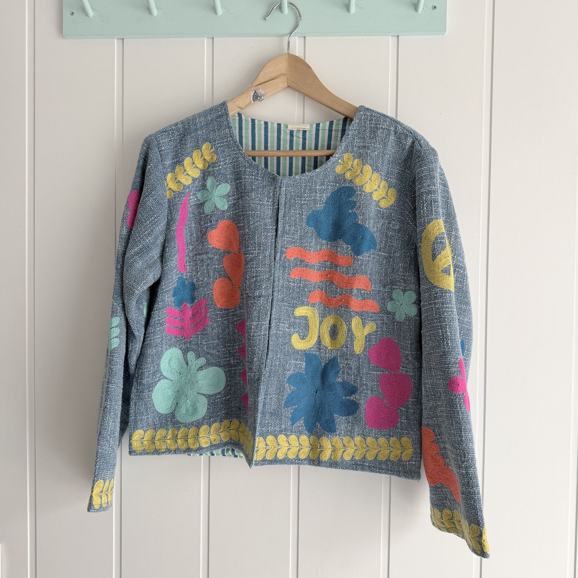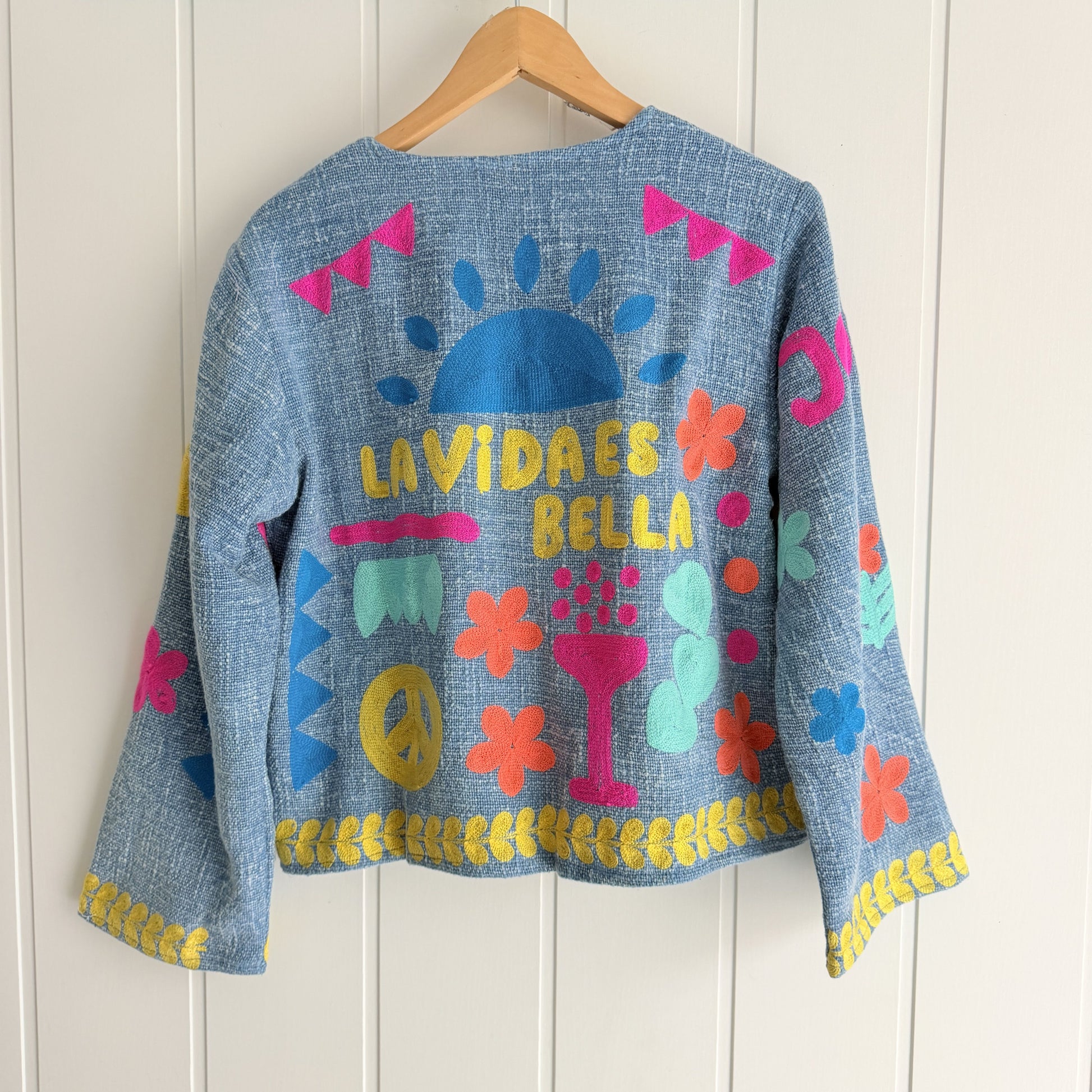 Hecha a mano en la India, con bolsillos, cerrada con corchetes invisibles.
