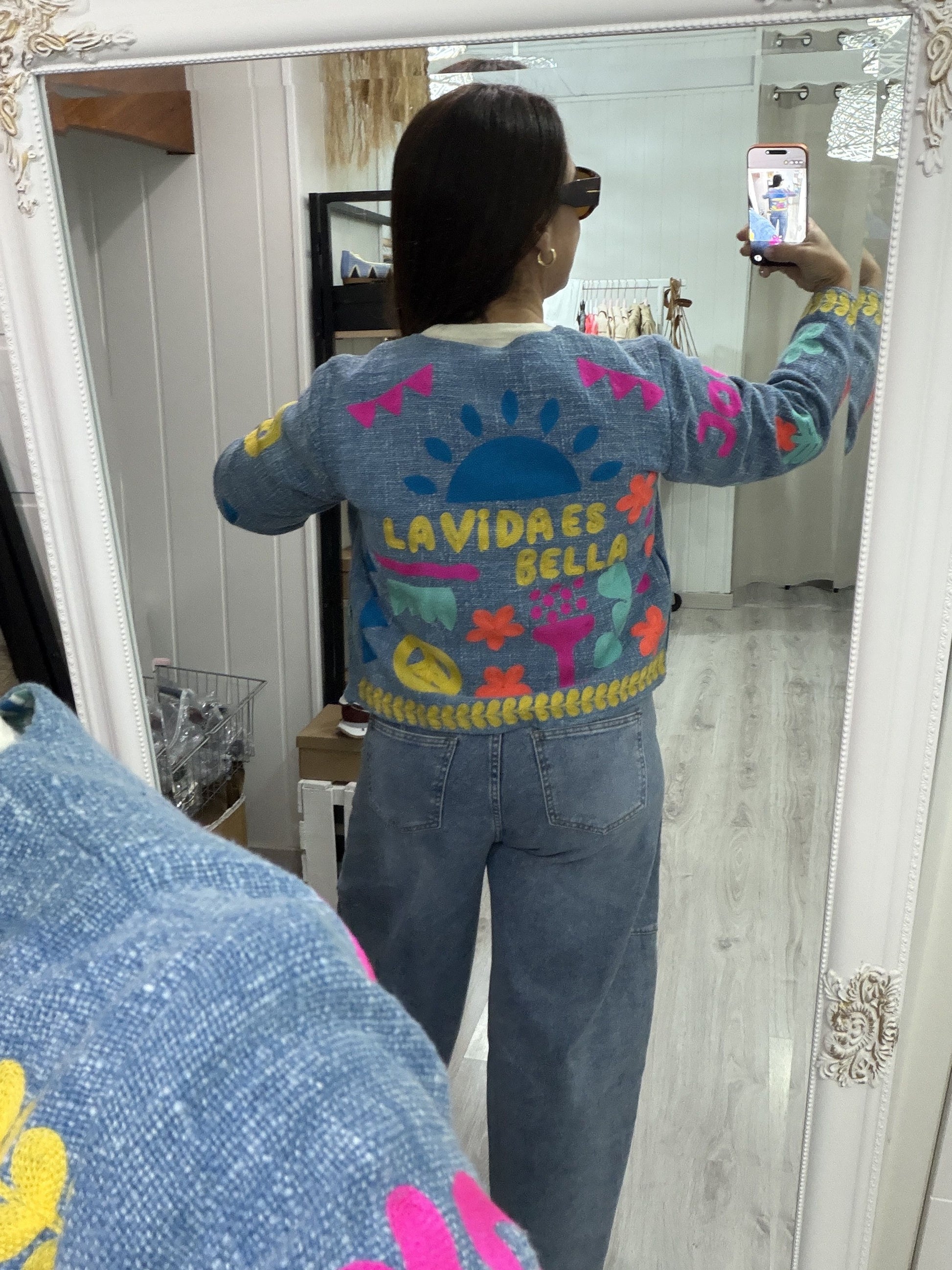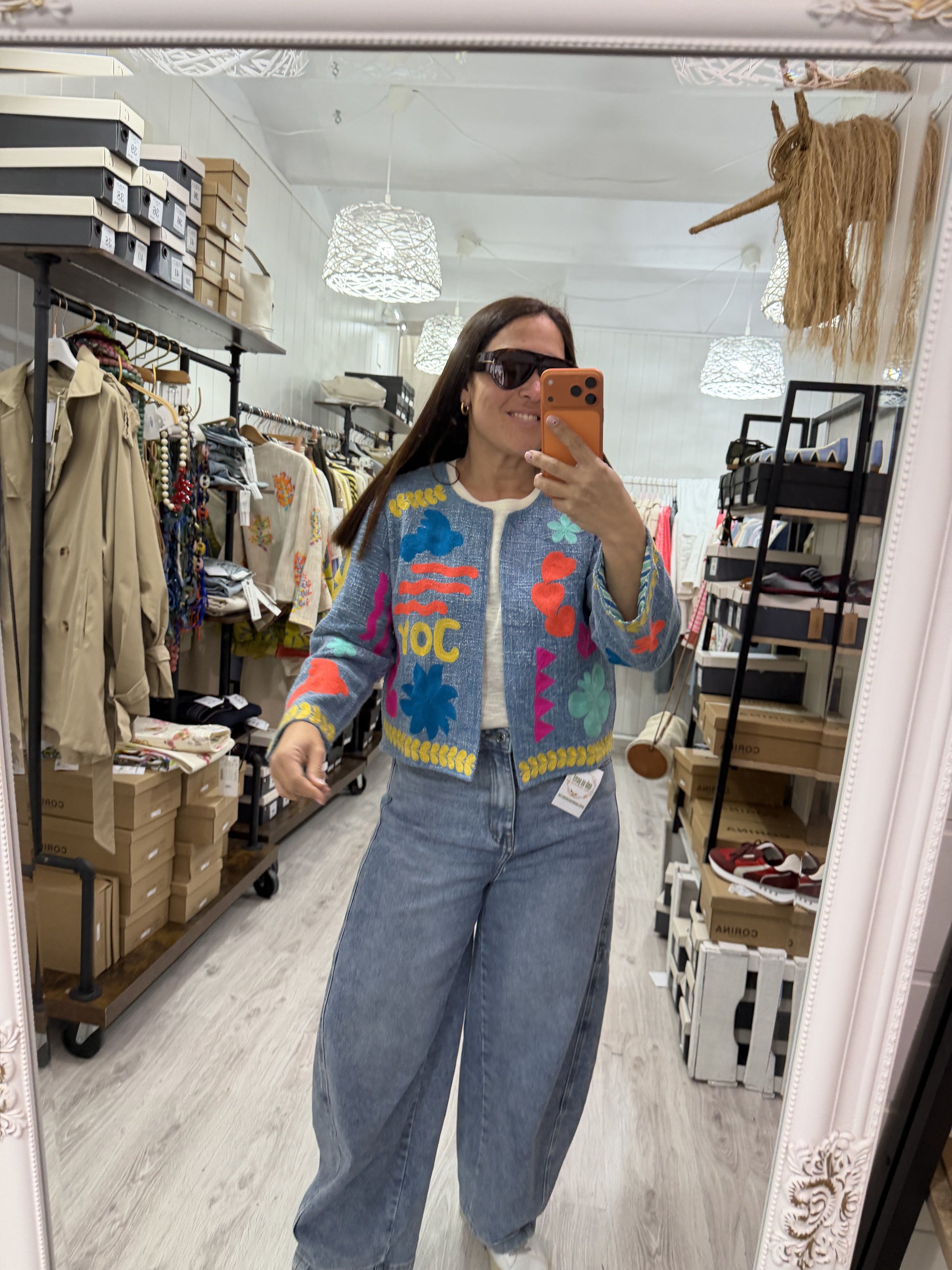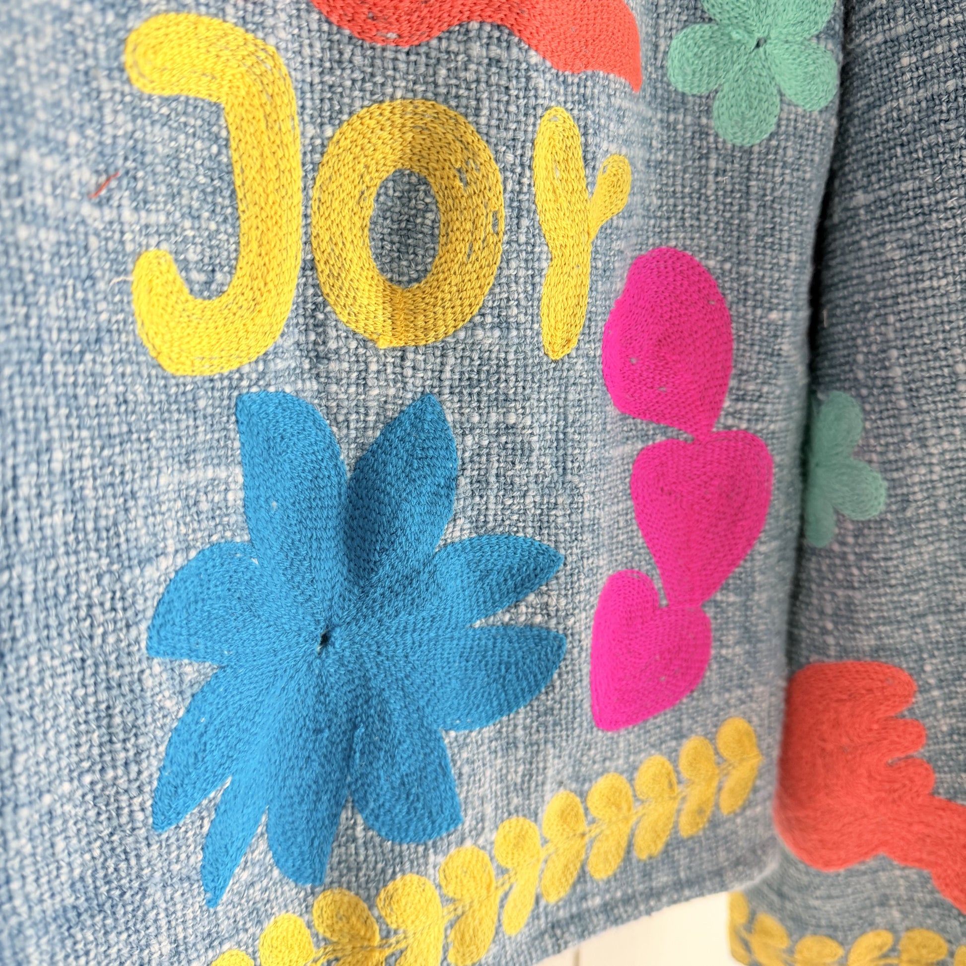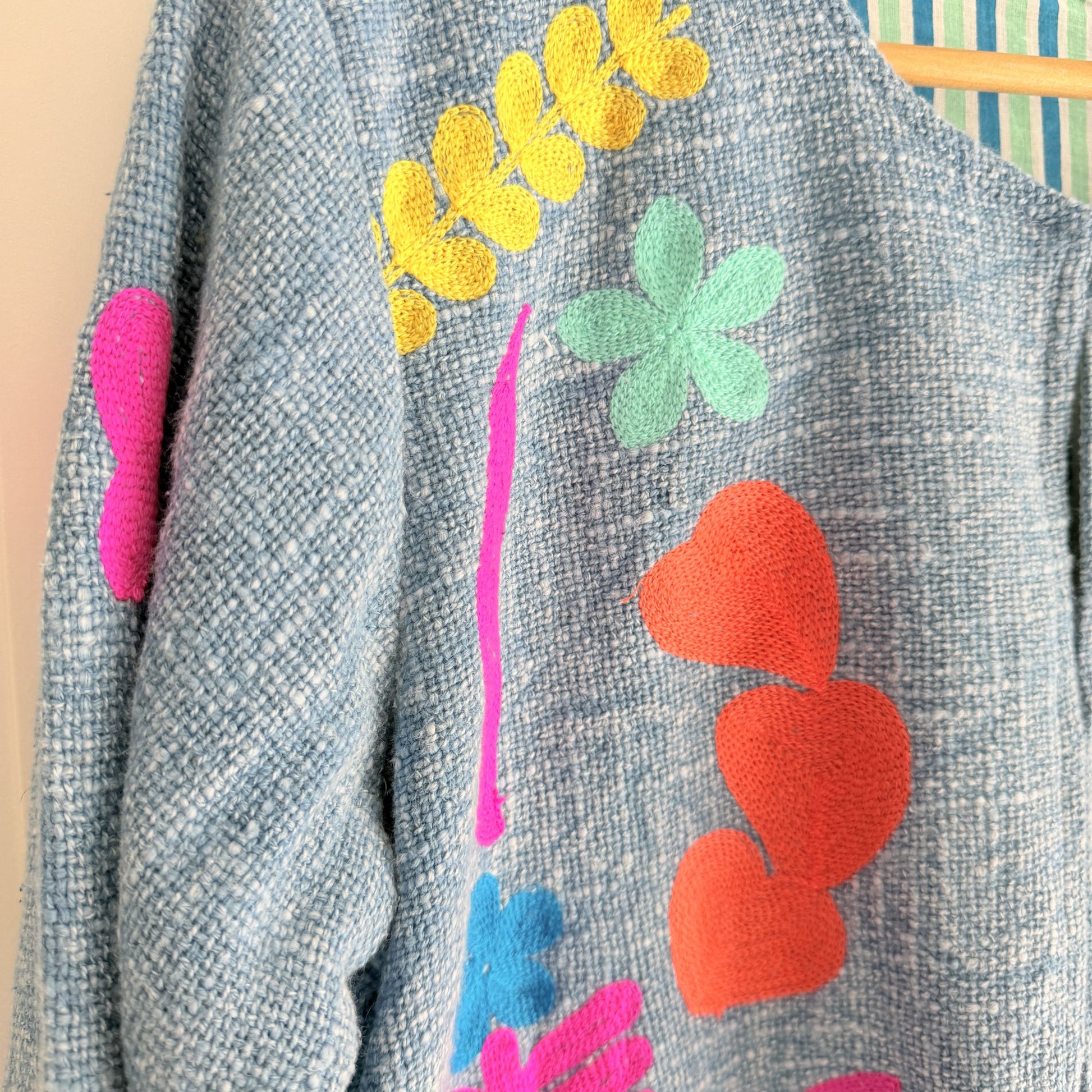 Hecha a mano en la India, con bolsillos, cerrada con corchetes invisibles.