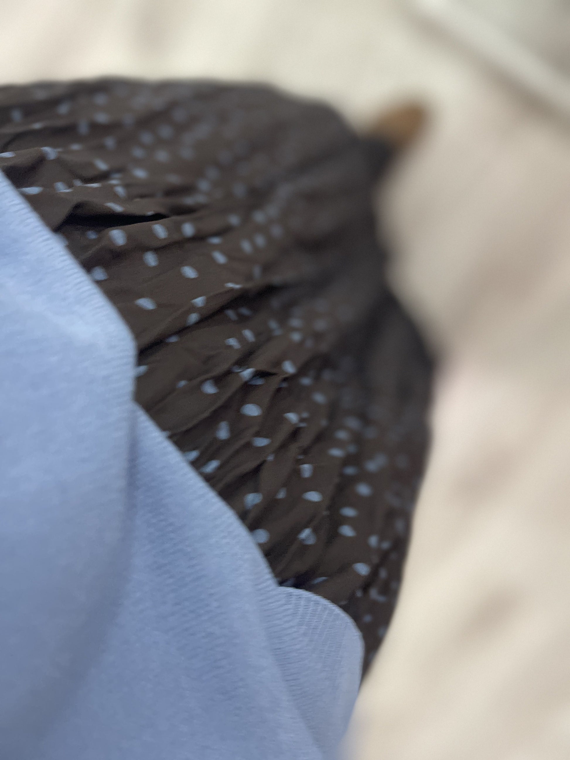 Compuesto por jersei fino y falda larga arrugada en topitos.