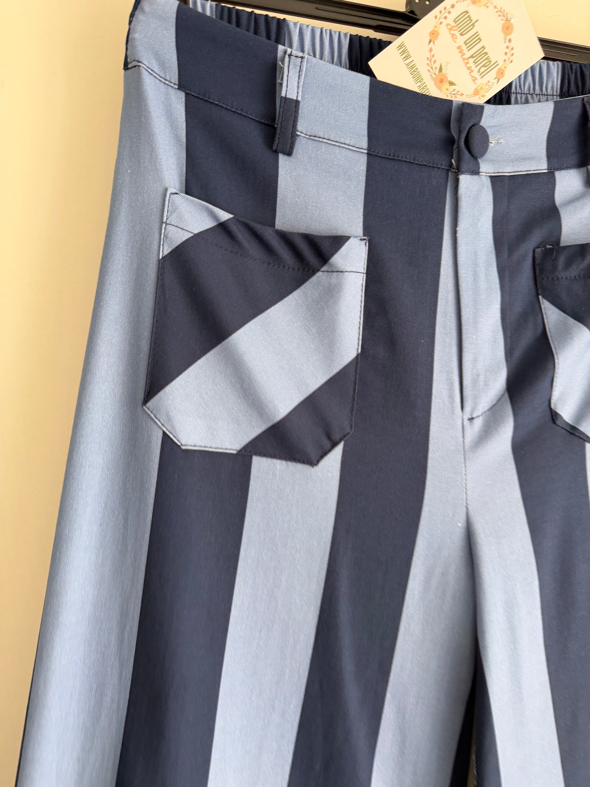 Pantalón con bolsillos al frente, sin bolsillos atrás, con botón y cremallera delante y en la parte trasera elástico.