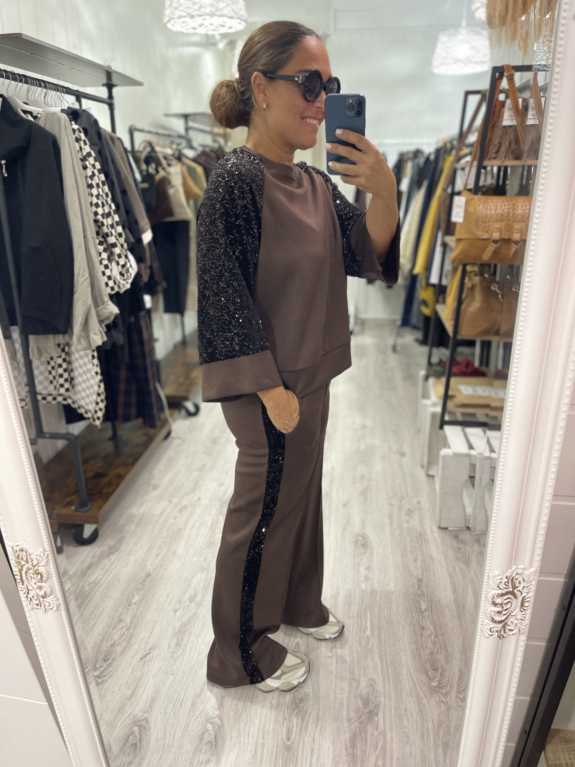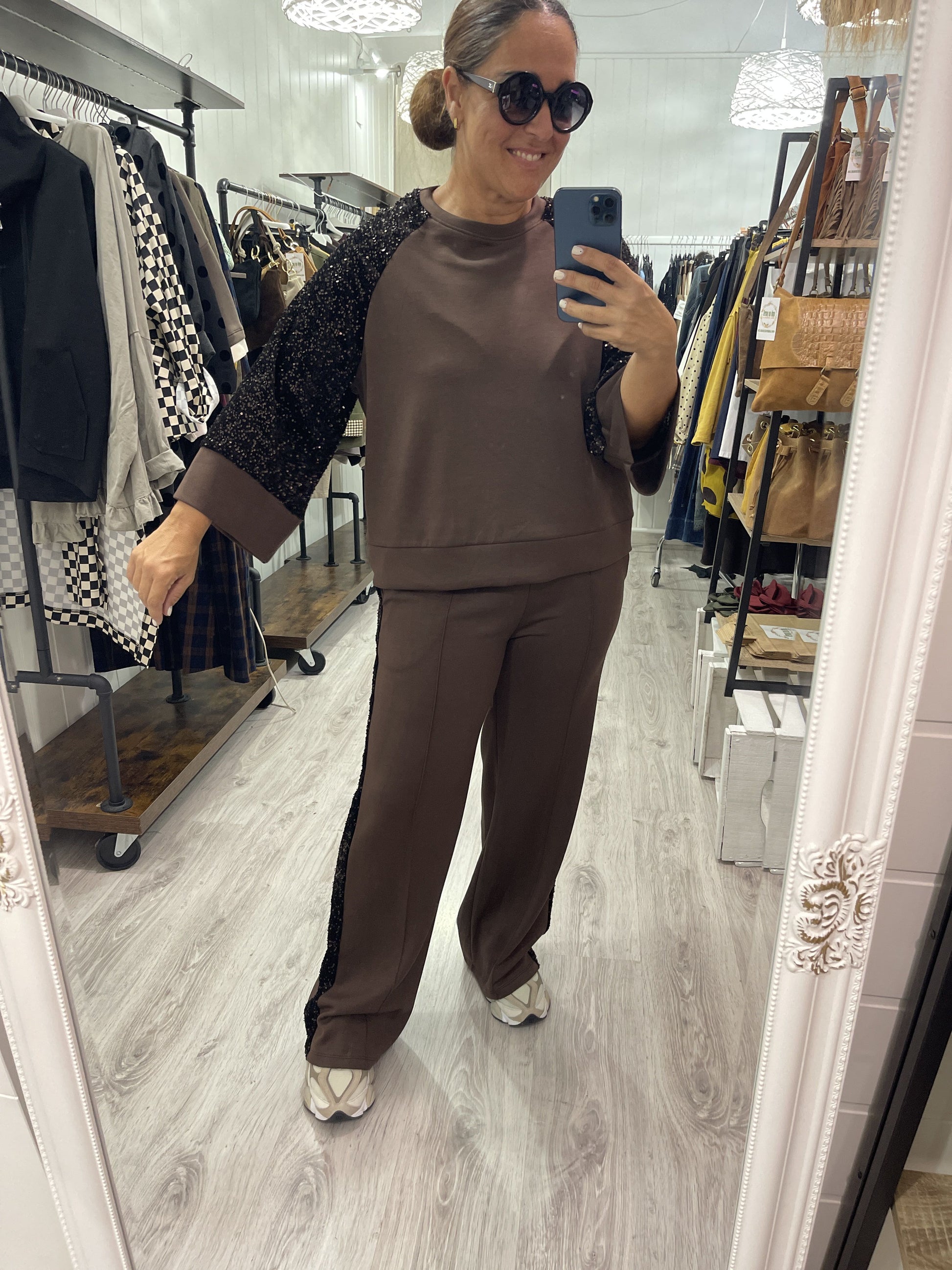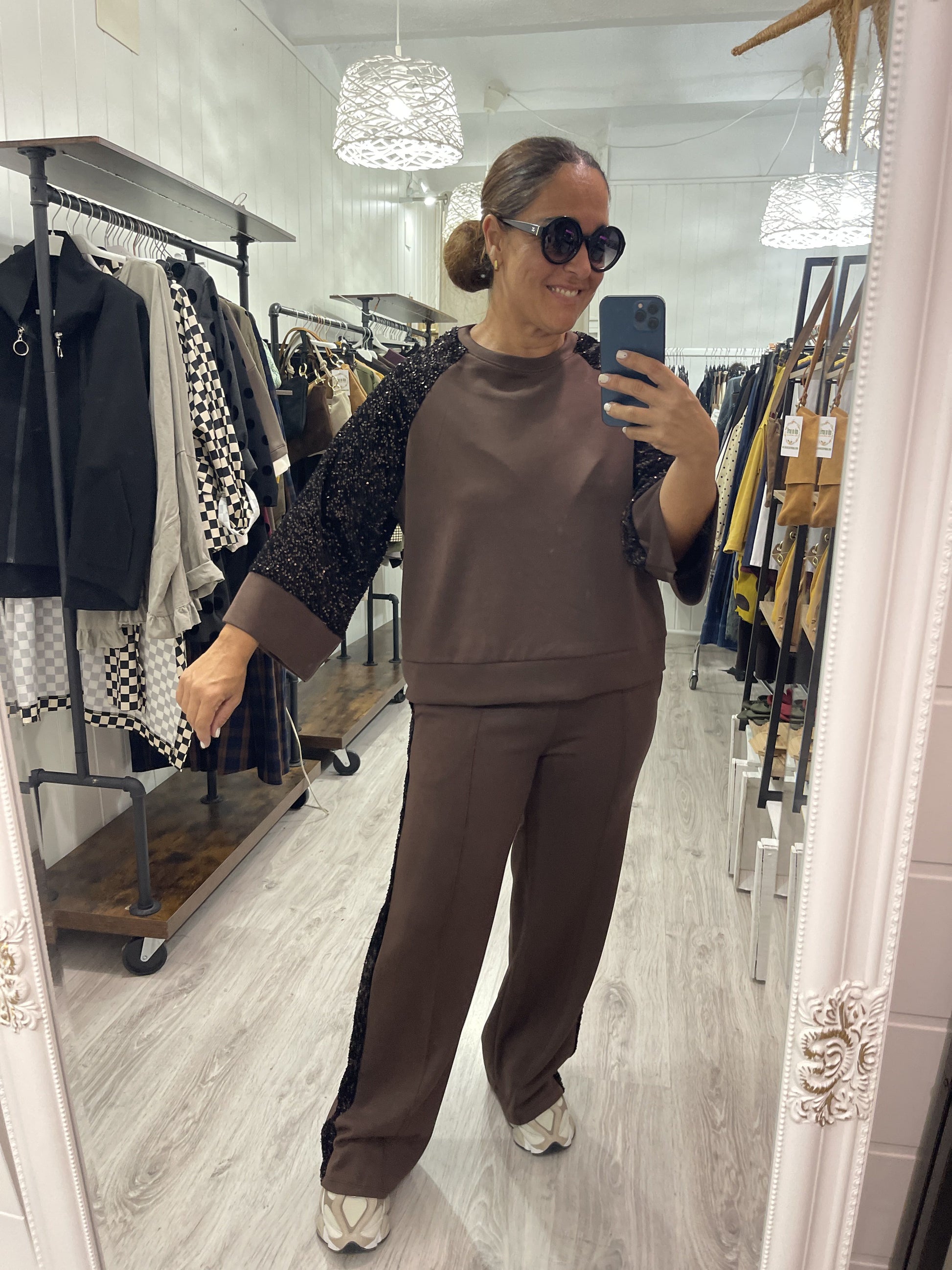 Sudadera cuello redondo, manga francesa con detalle en paillettes y pantalón recto con raya lateral compuesta por paillettes.