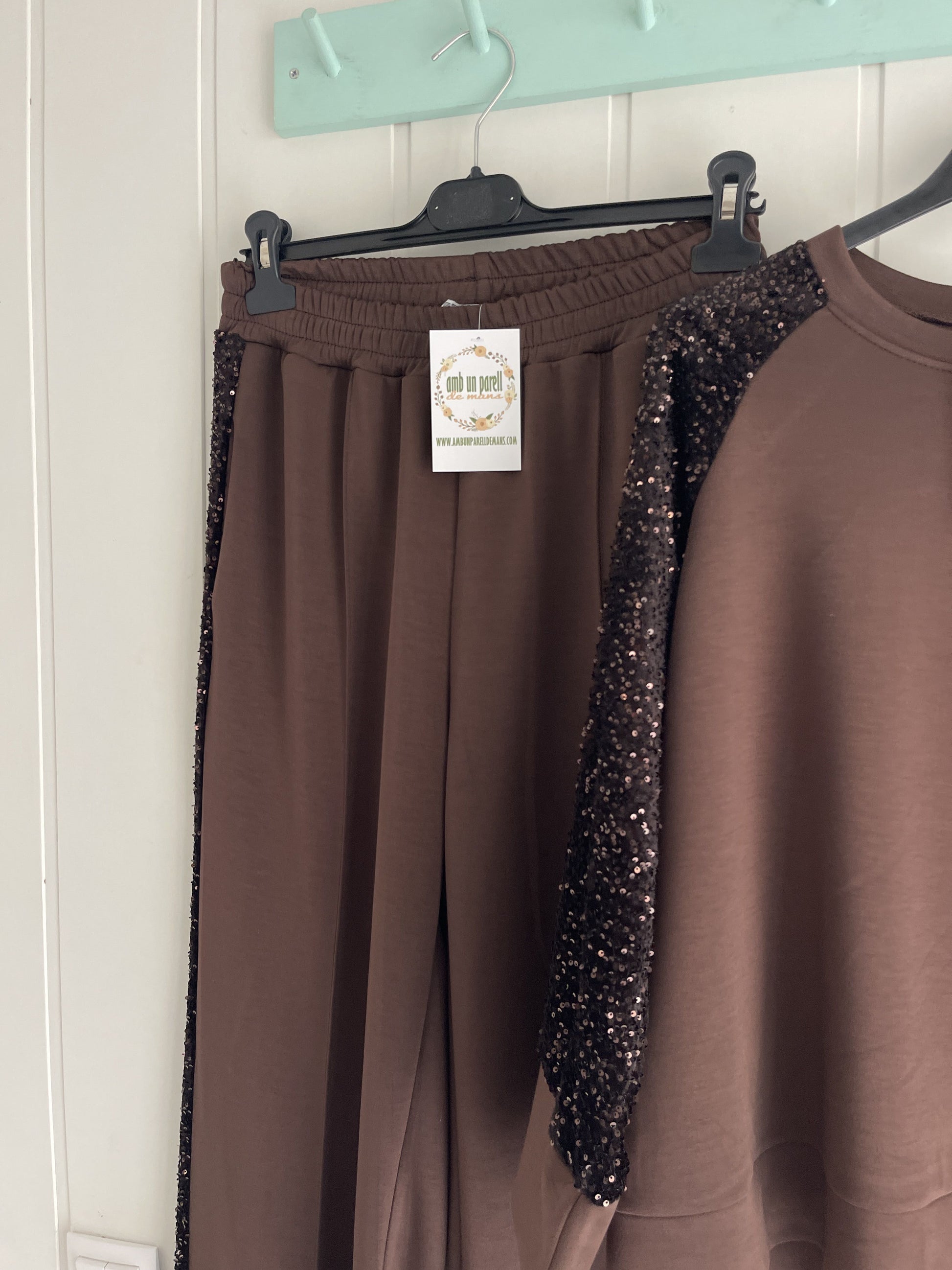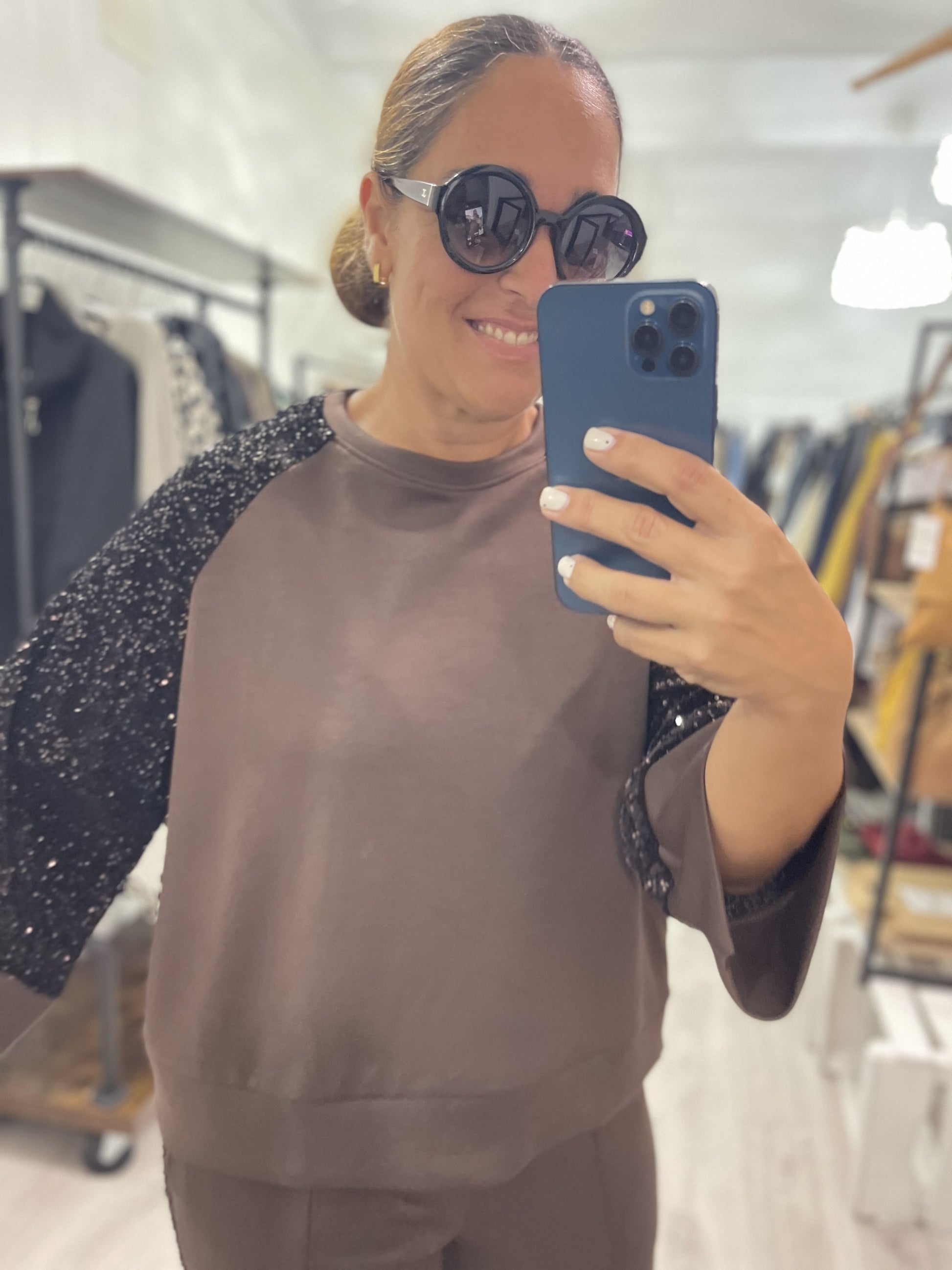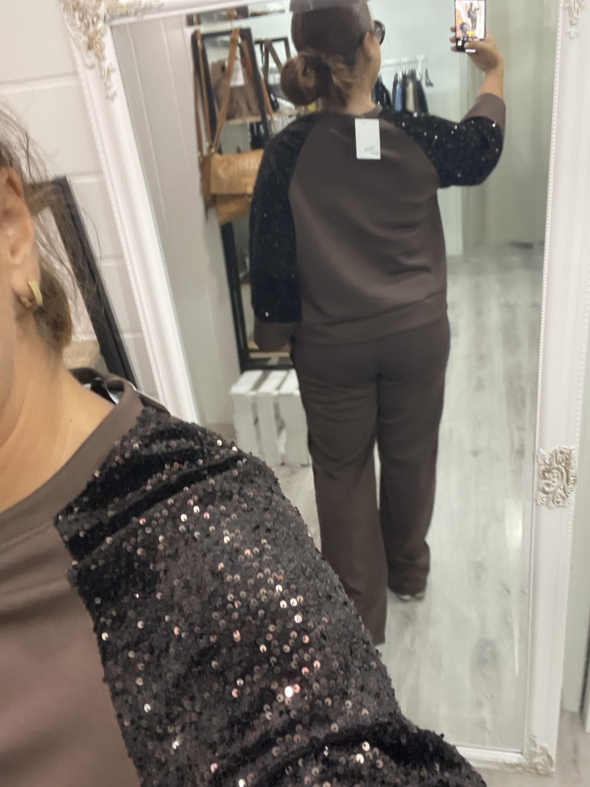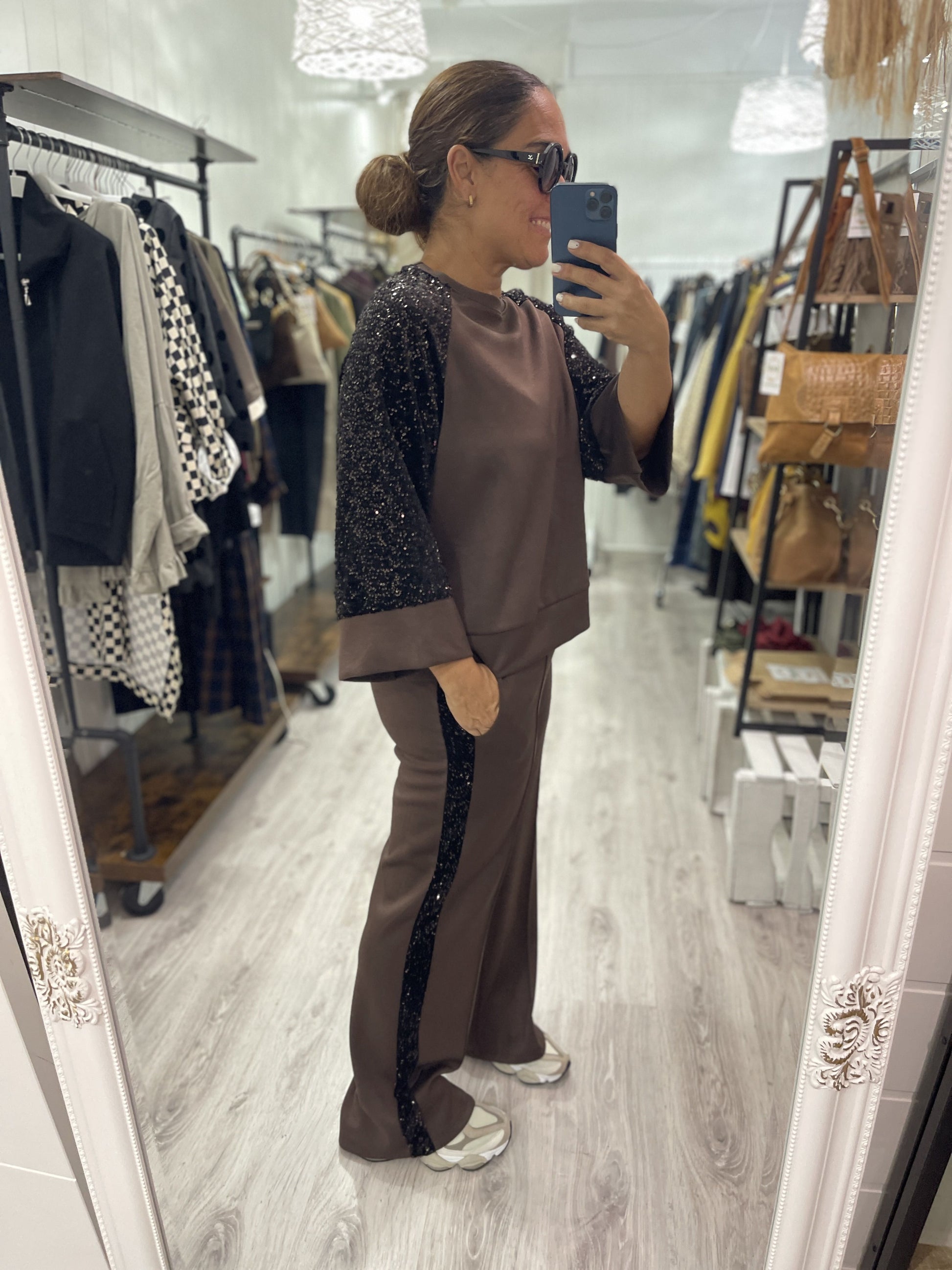 Sudadera cuello redondo, manga francesa con detalle en paillettes y pantalón recto con raya lateral compuesta por paillettes.