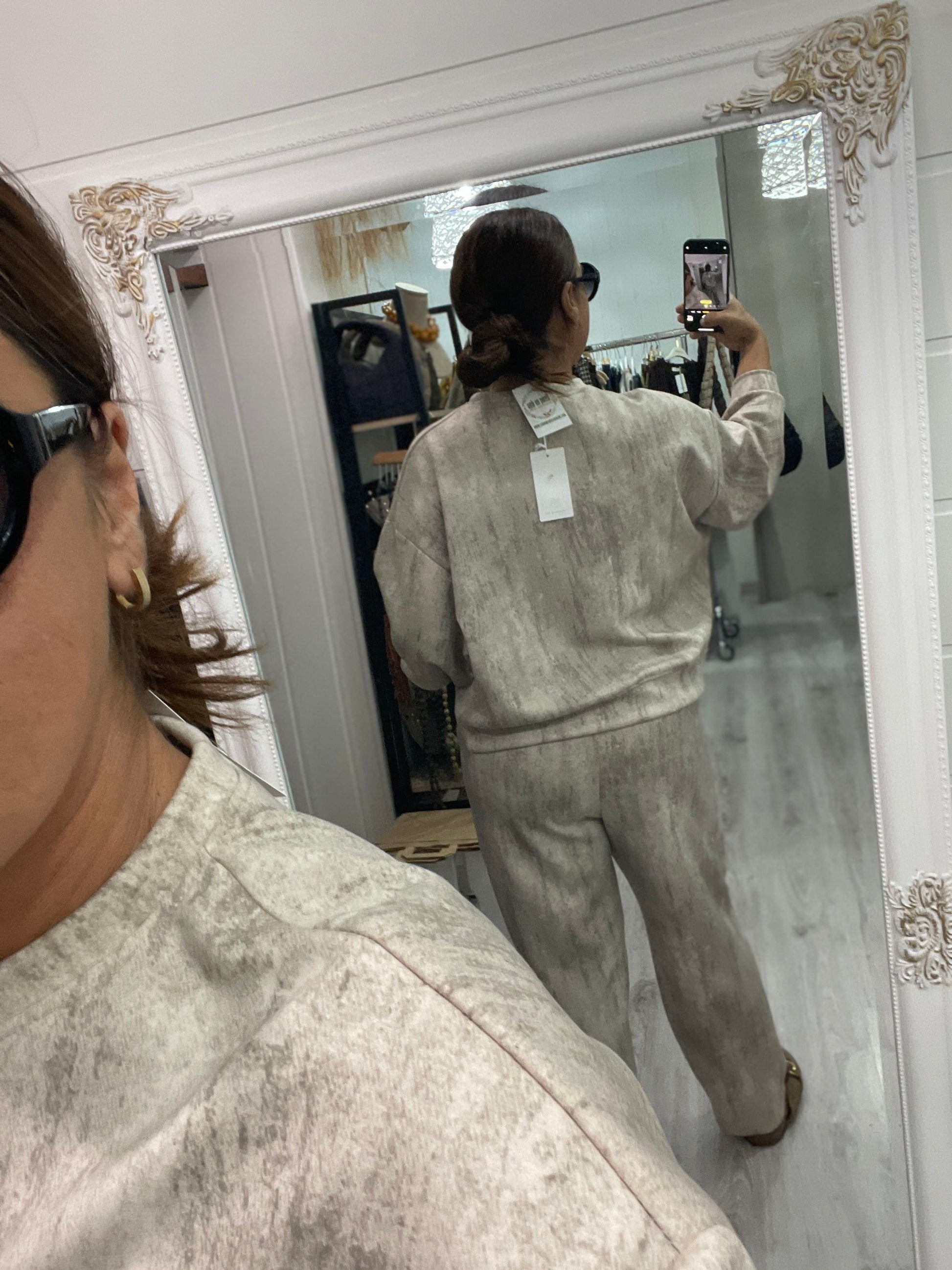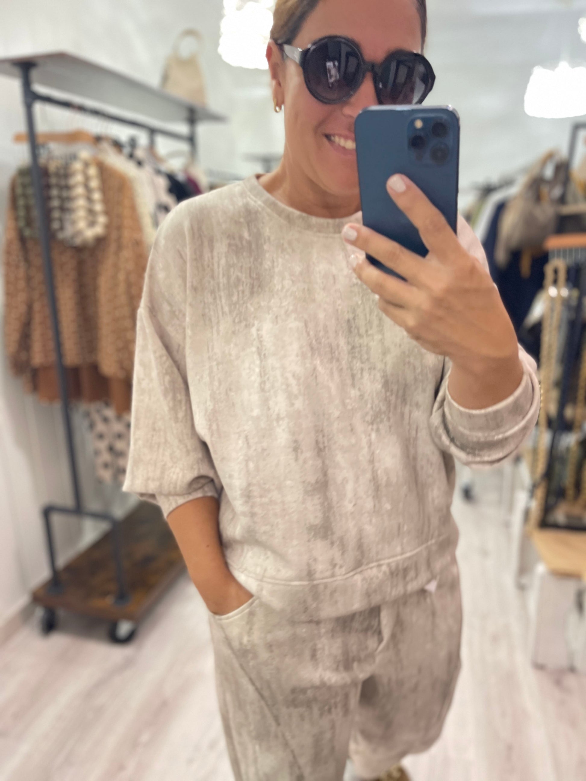 Compuesto por sudadera y pantalón, en tejido elástico y cómodo, tipo punto roma.