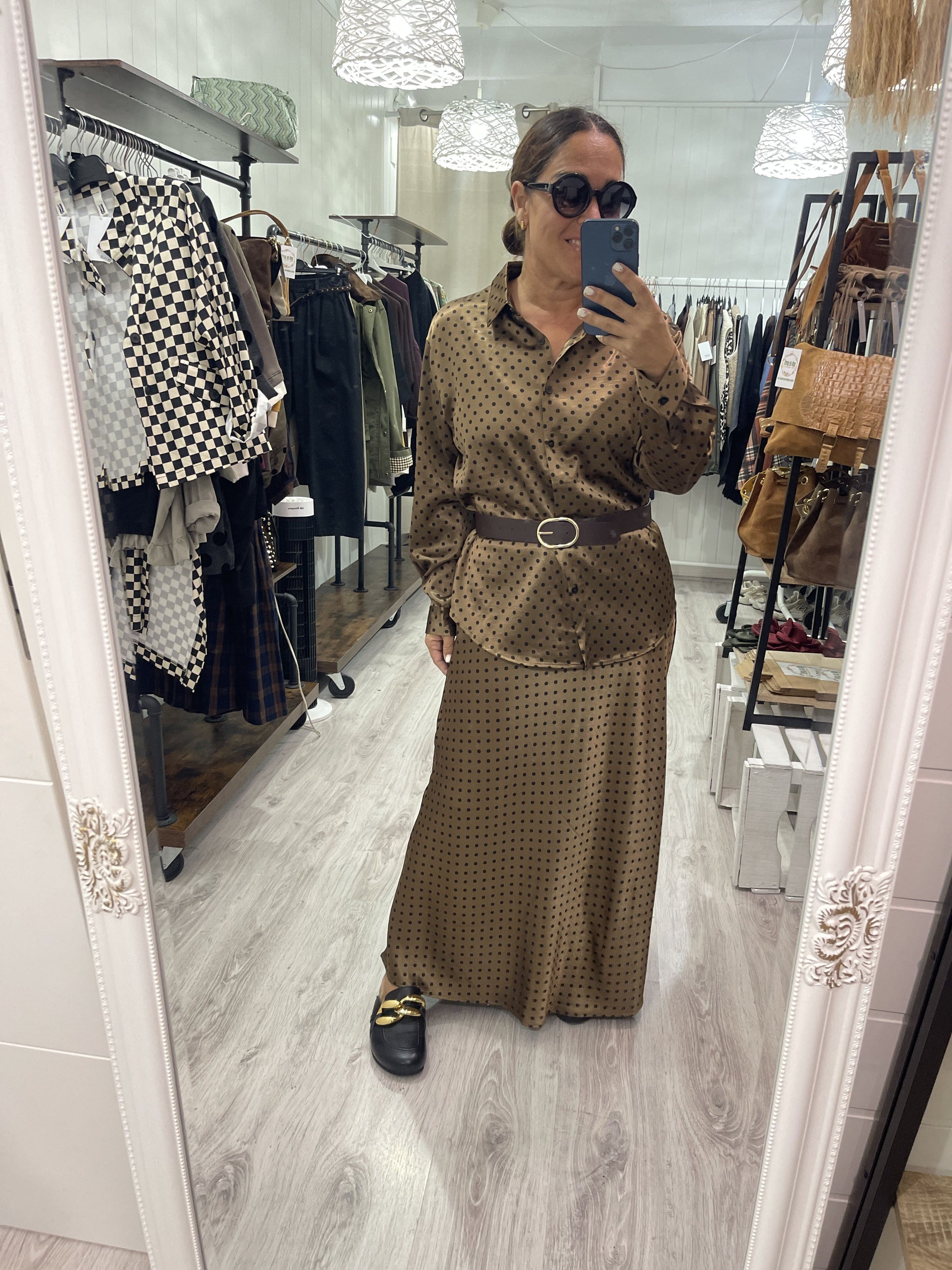 Conjunto Topitos satinado camisa y falda