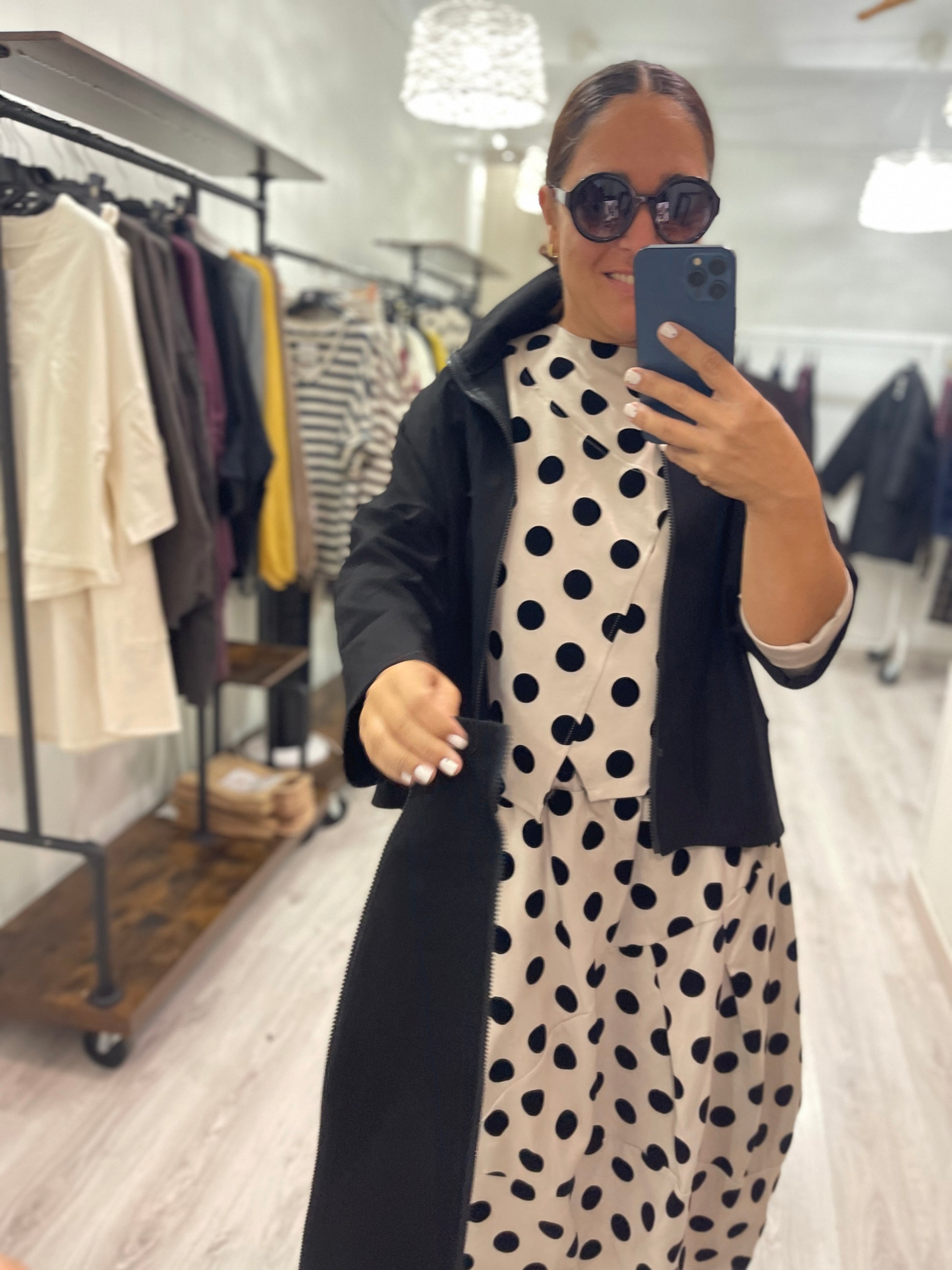 Tejido en punto roma, con topos en relieve tipo terciopelo.