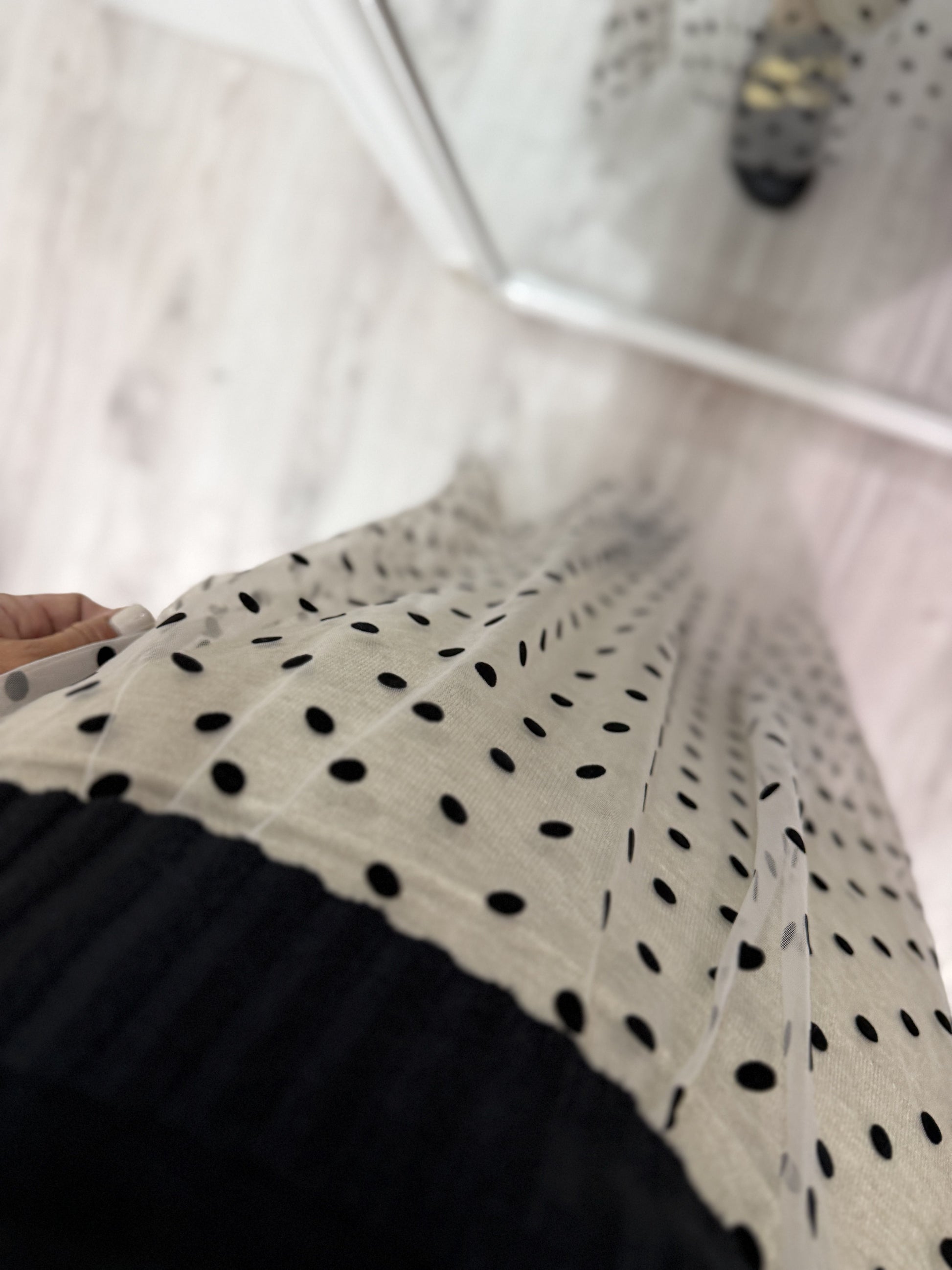 Cinturilla elástica, de punto, con tul por encima, con topos en terciopelo.