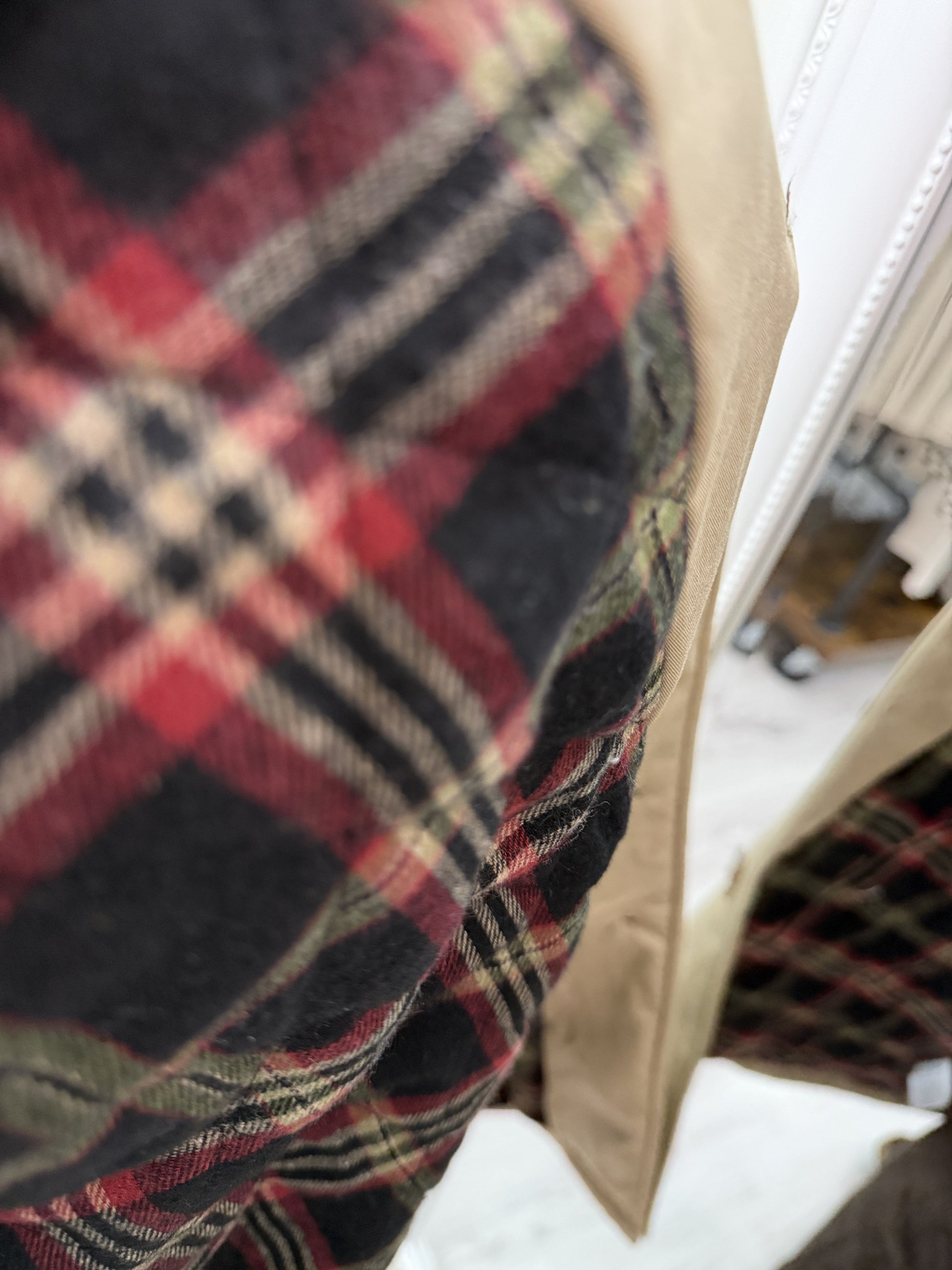 Con cuello, manga larga, abotonada al frente, con bolsillos y con interior forrado y acolchado en tela con estampado British, con tejido similar a la franela.
