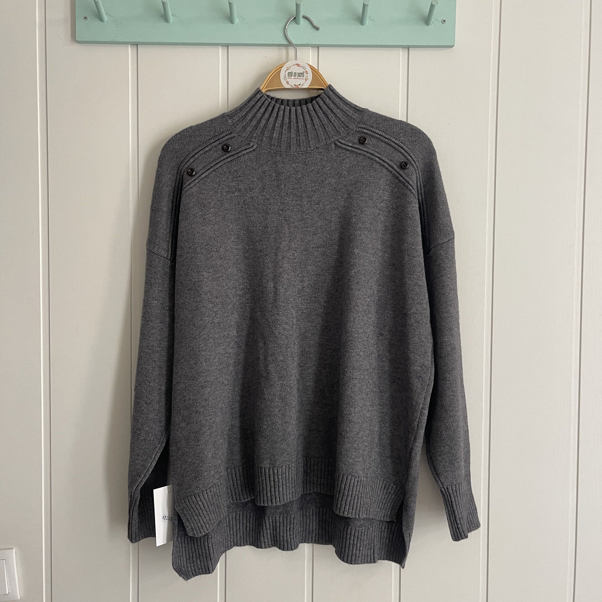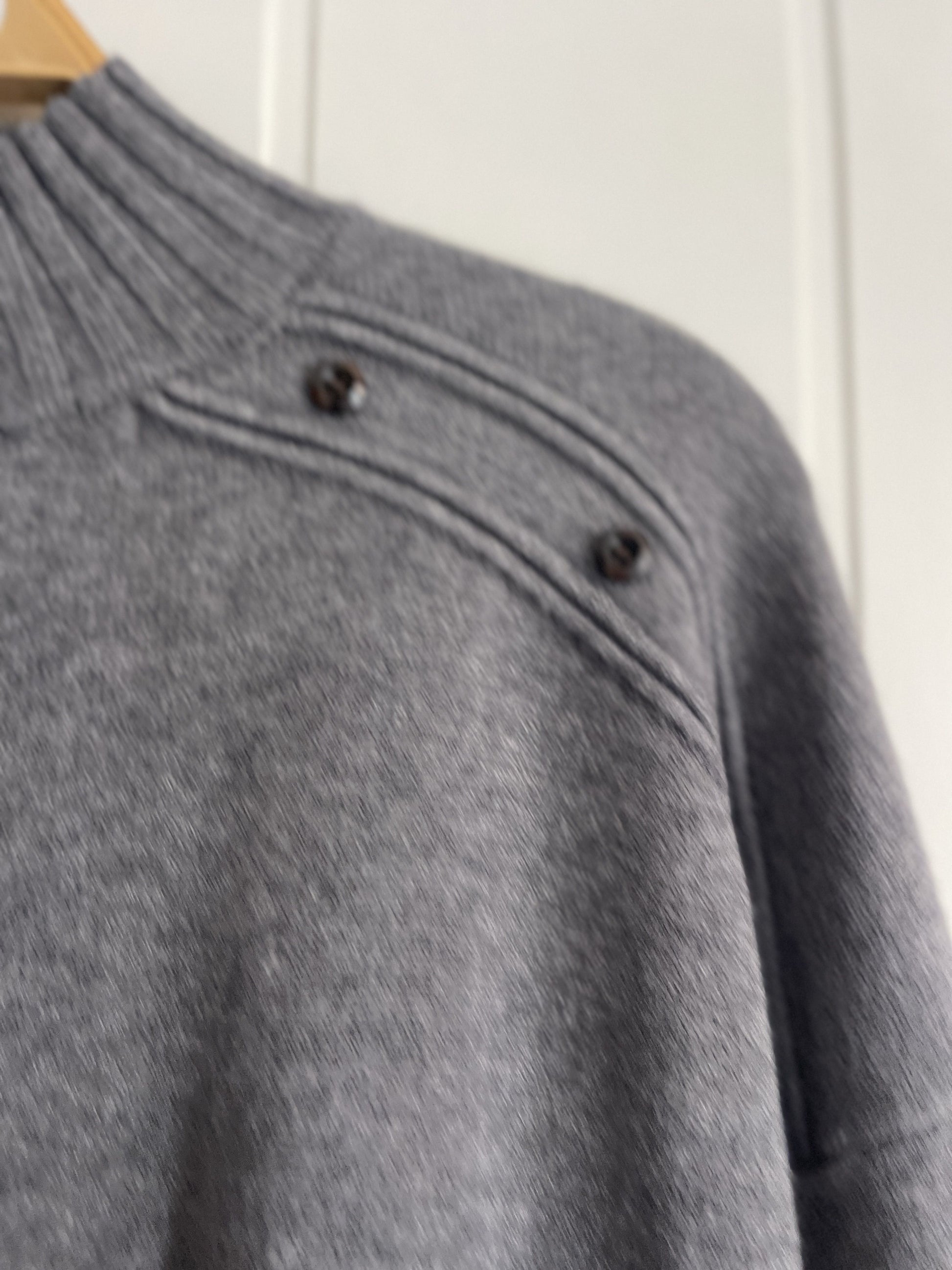 De tacto súper suave, cuello Perkins, manga ranglán caída con detalle de botones en negro, con el largo trasero más largo que de delante.