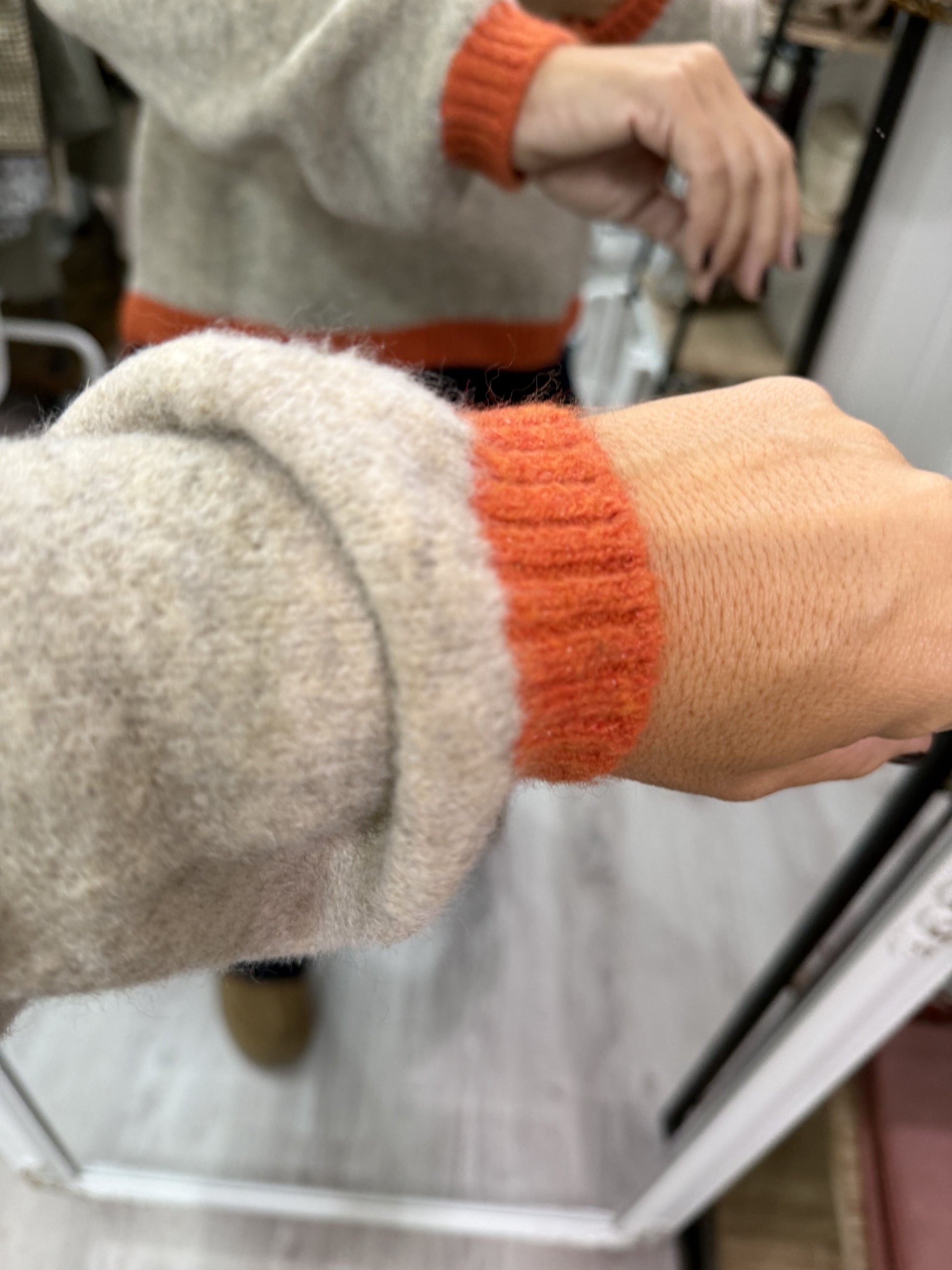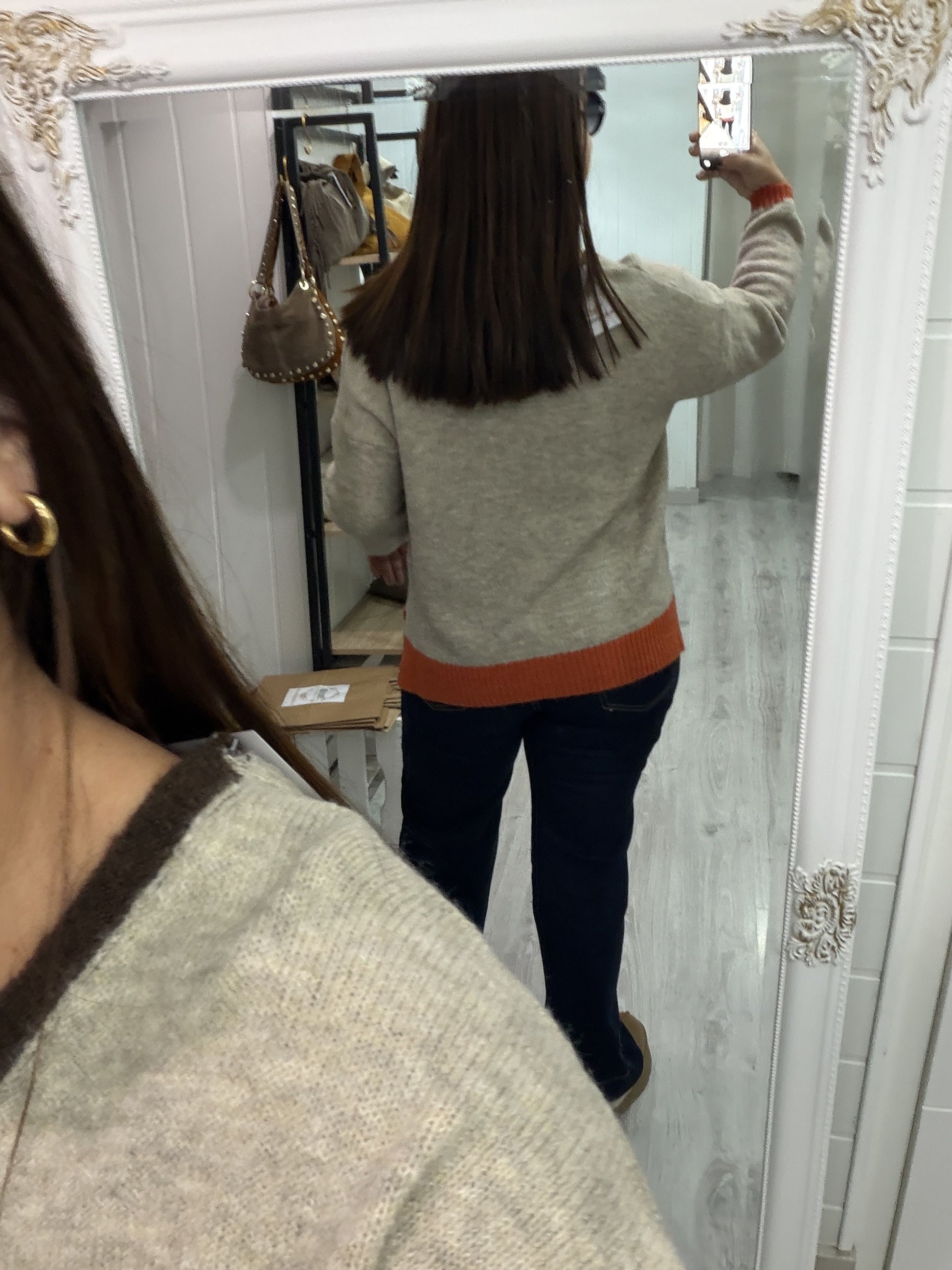 De cuello de pico, tacto suave, manga caída y con cuello, puños y bajo en contraste.