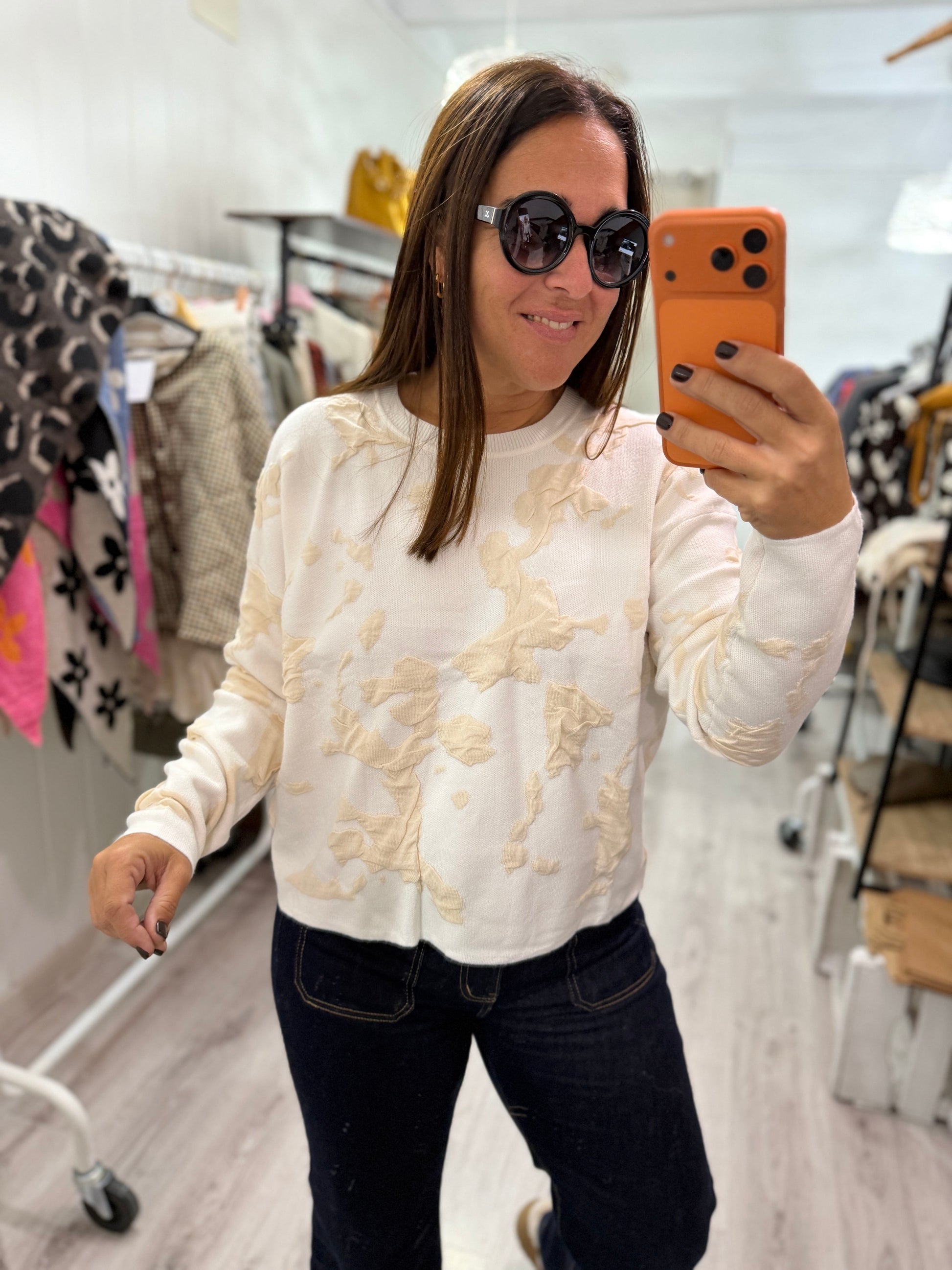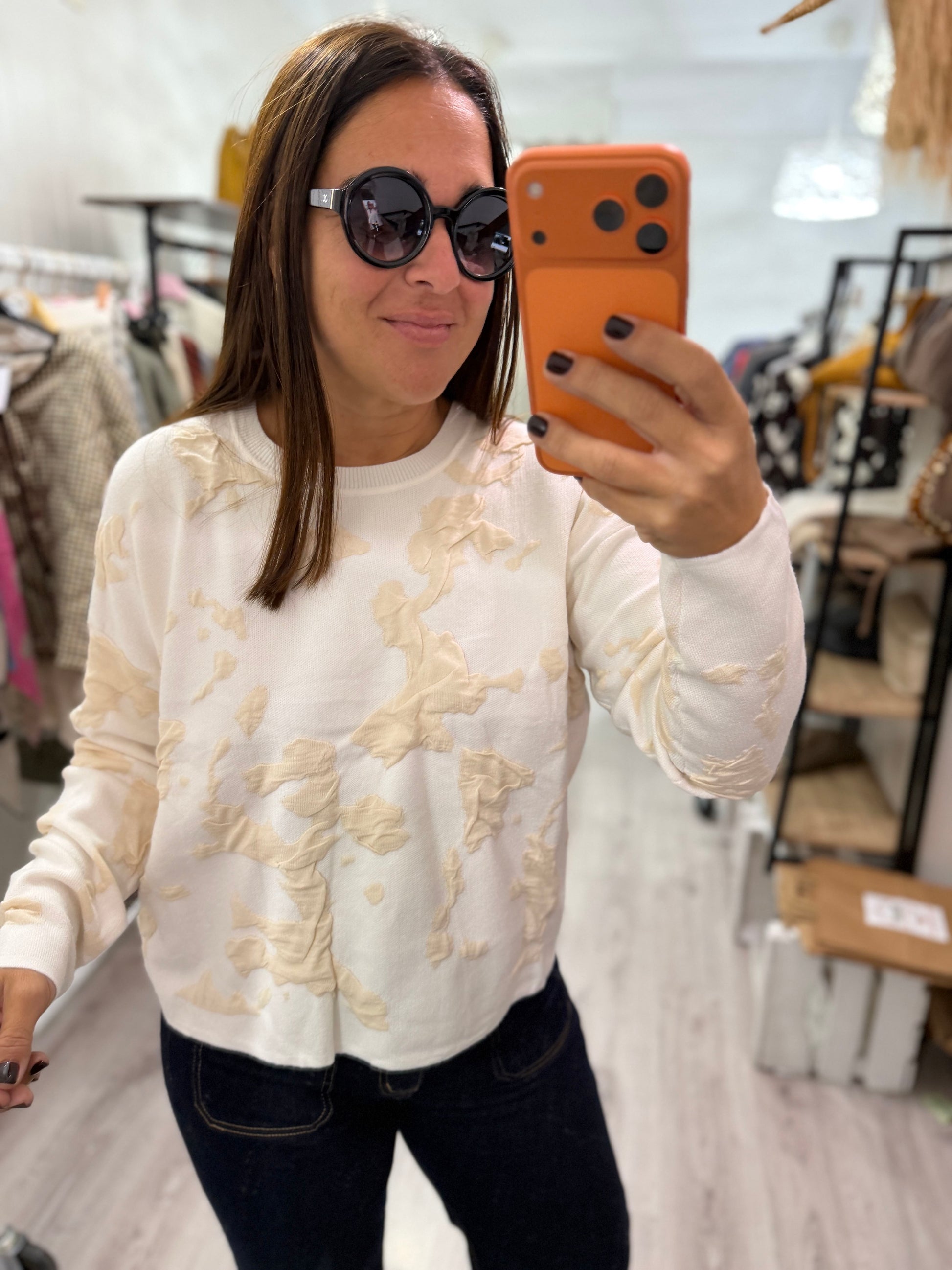 Cuello redondo, manga larga, ligeramente oversize.