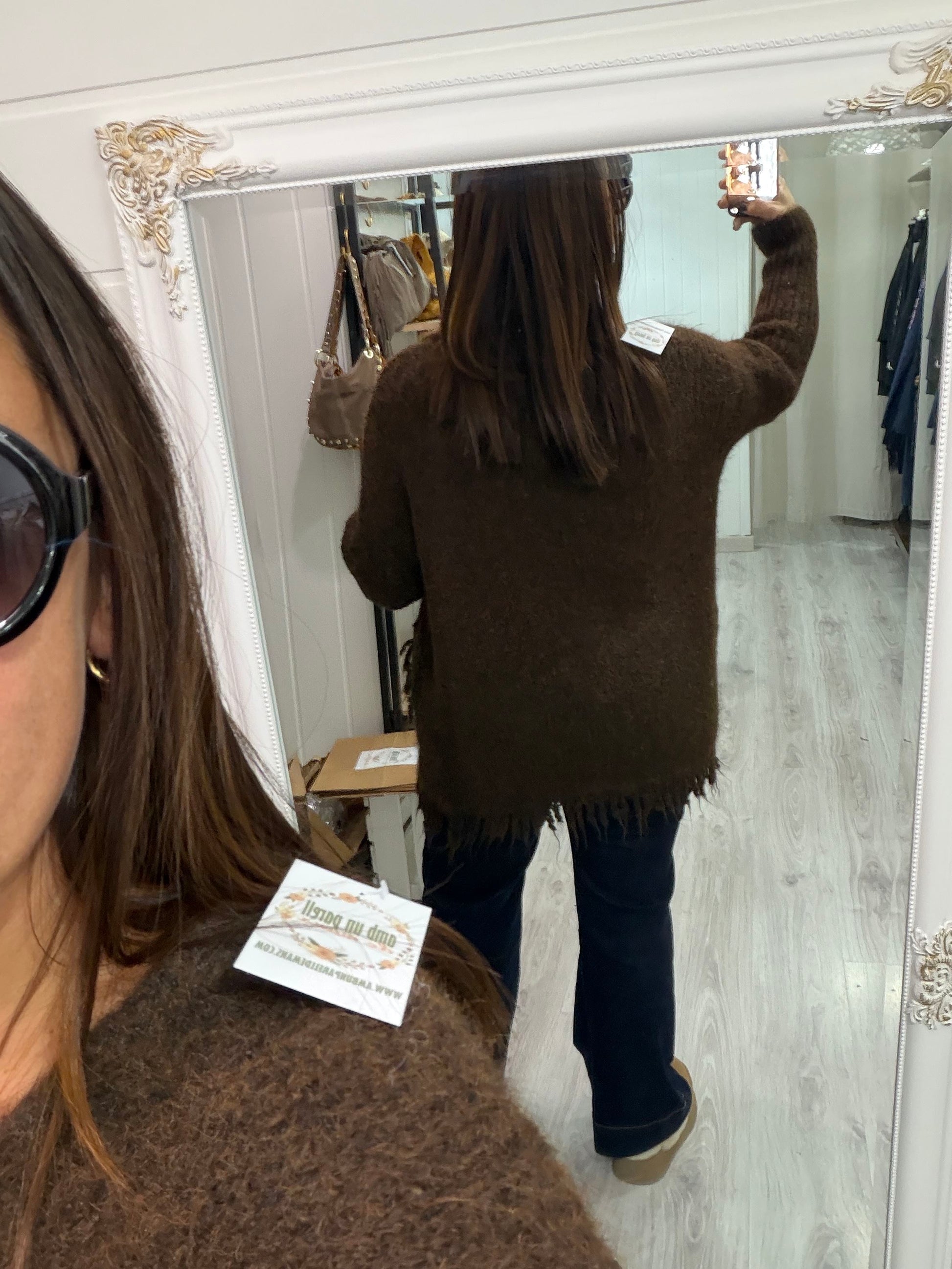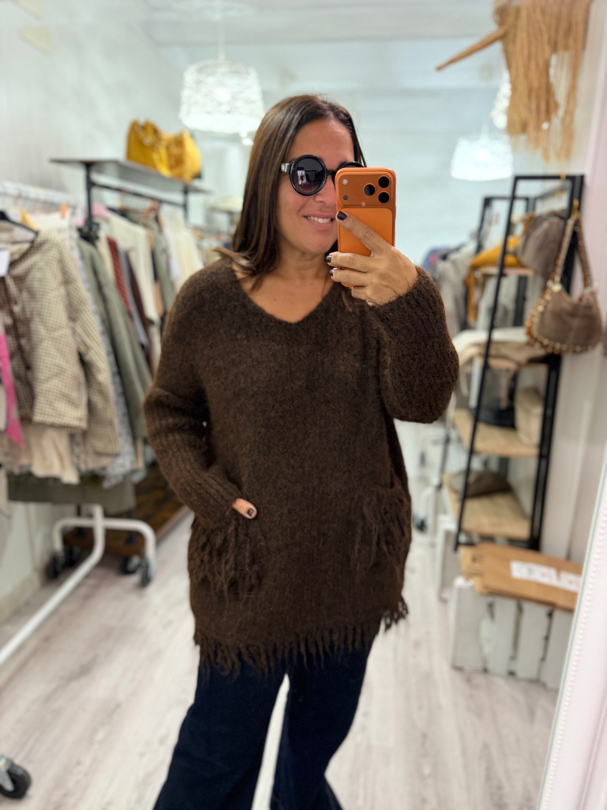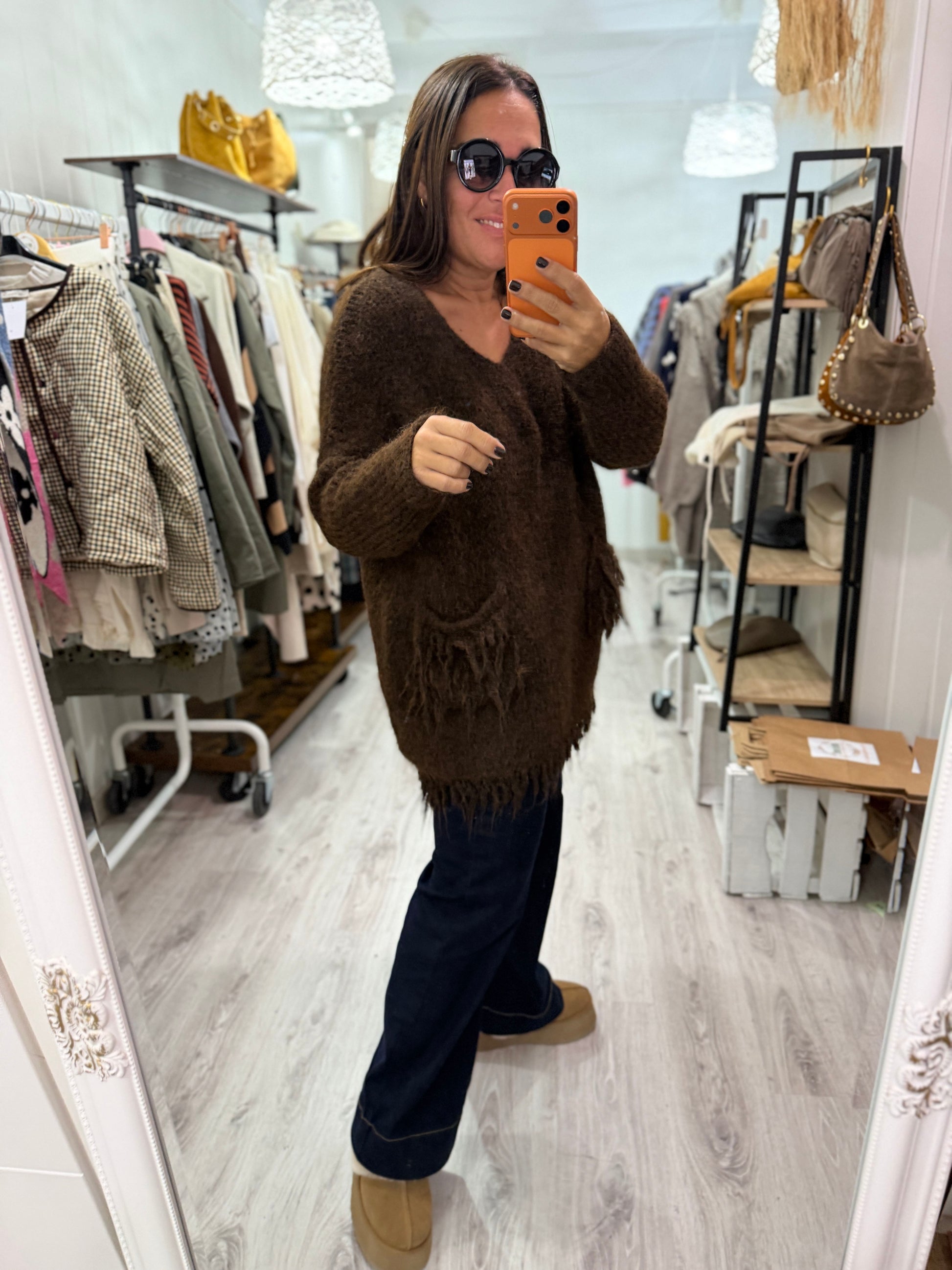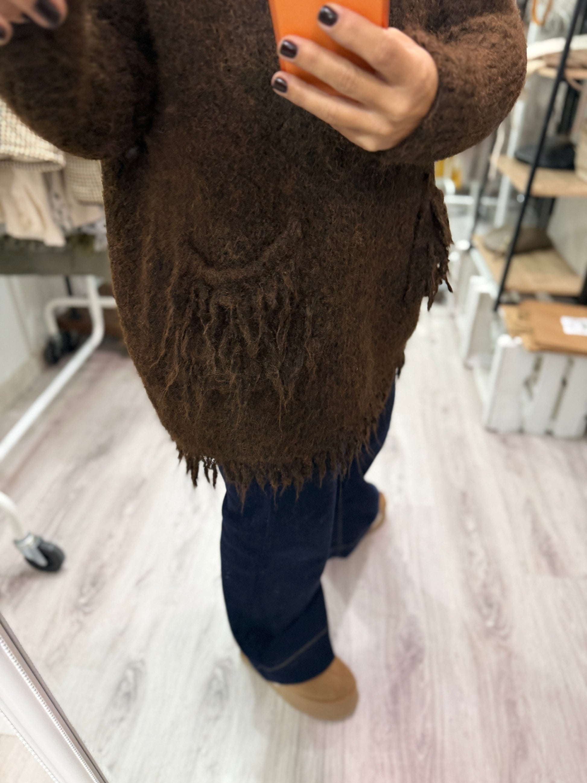 Cuello pico, manga larga, largo, con flecos en los bolsillos y en el bajo.