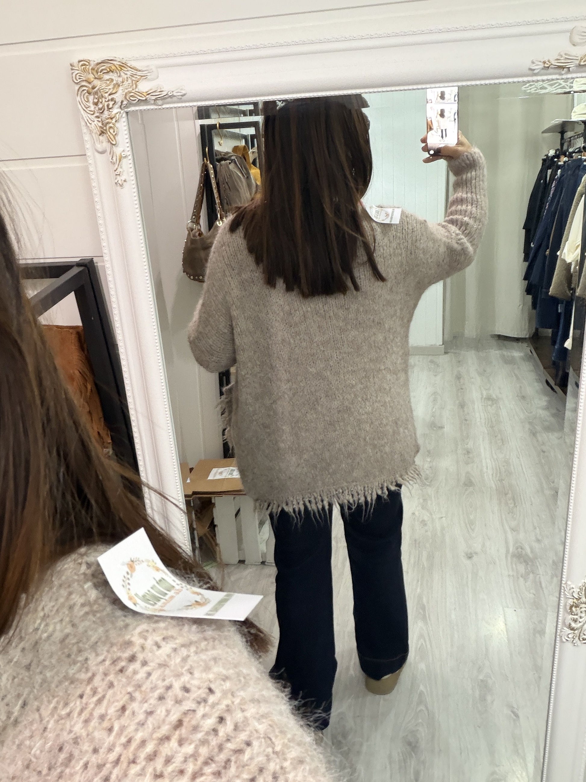 Cuello pico, manga larga, largo, con flecos en los bolsillos y en el bajo.