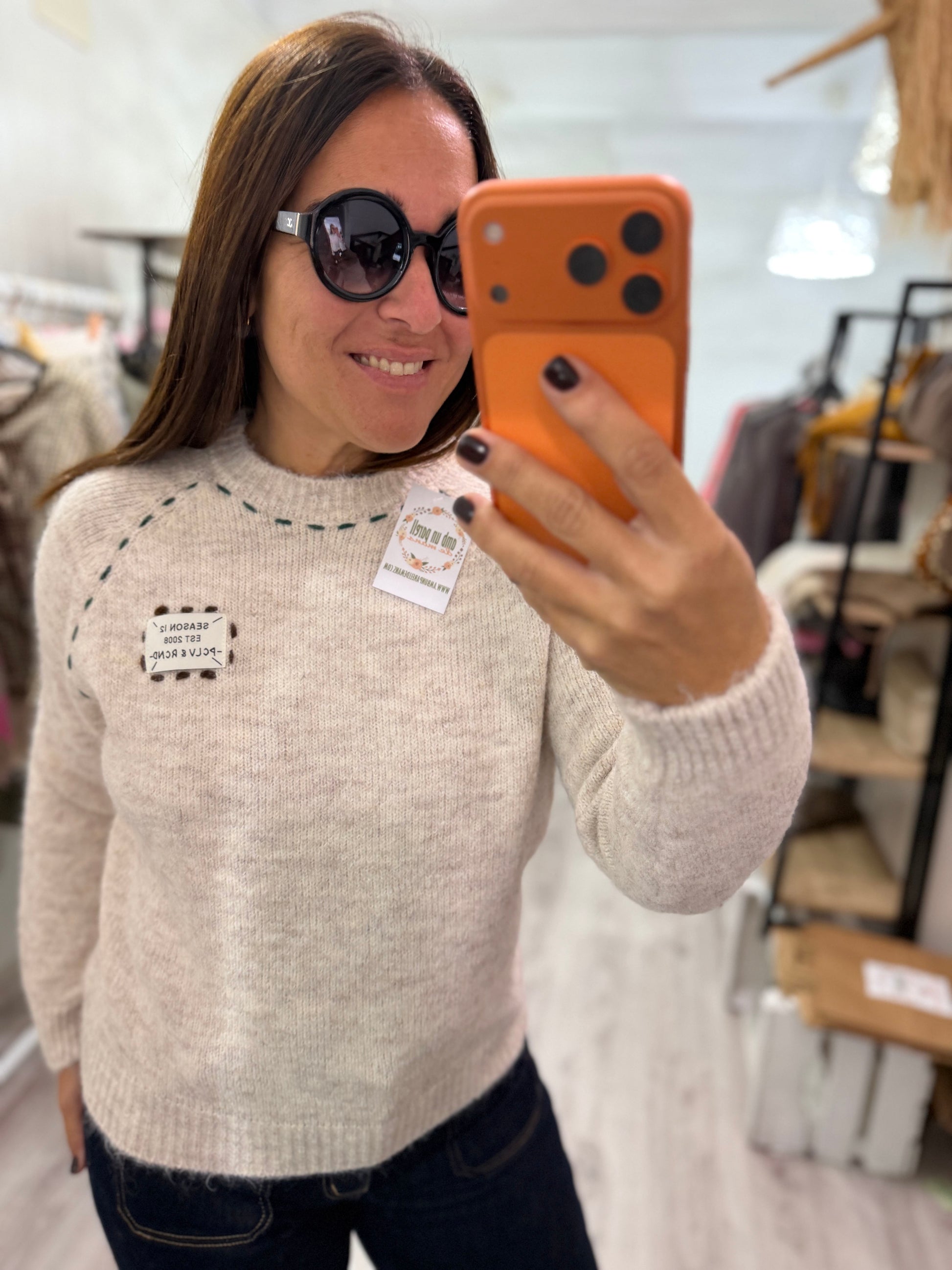 Cuello redondo, manga larga. Con pespunte a contraste, y etiqueta delantera.