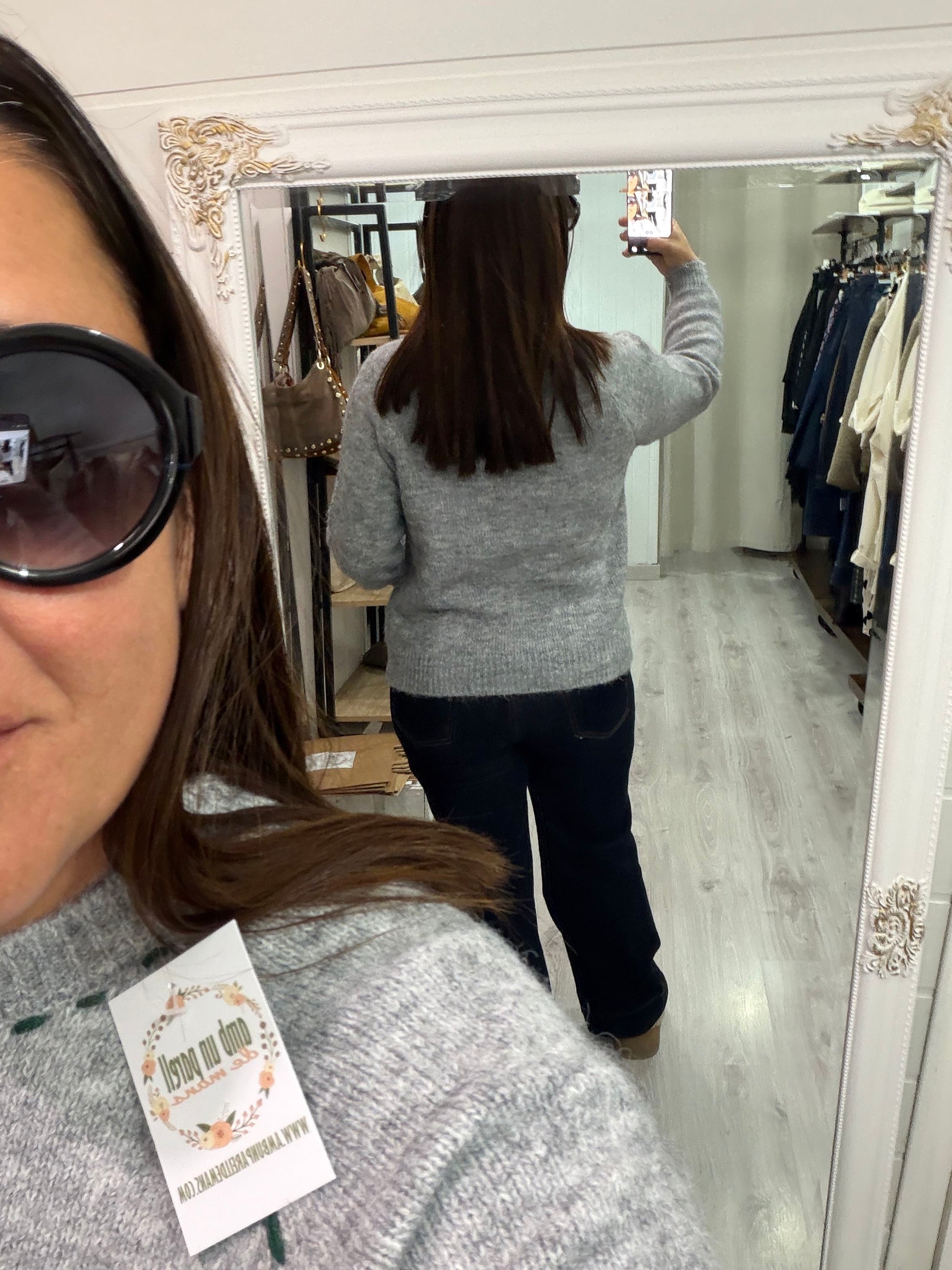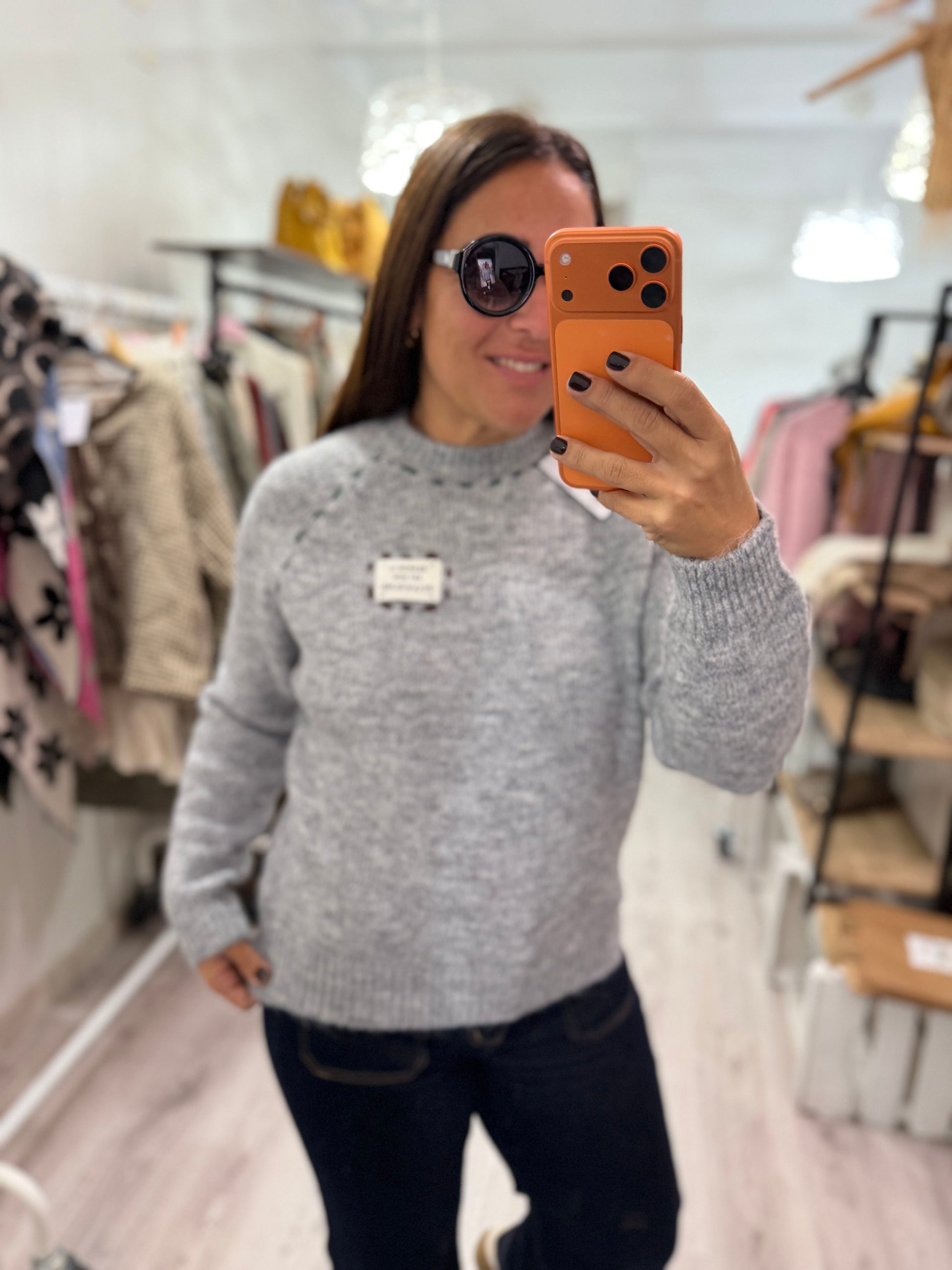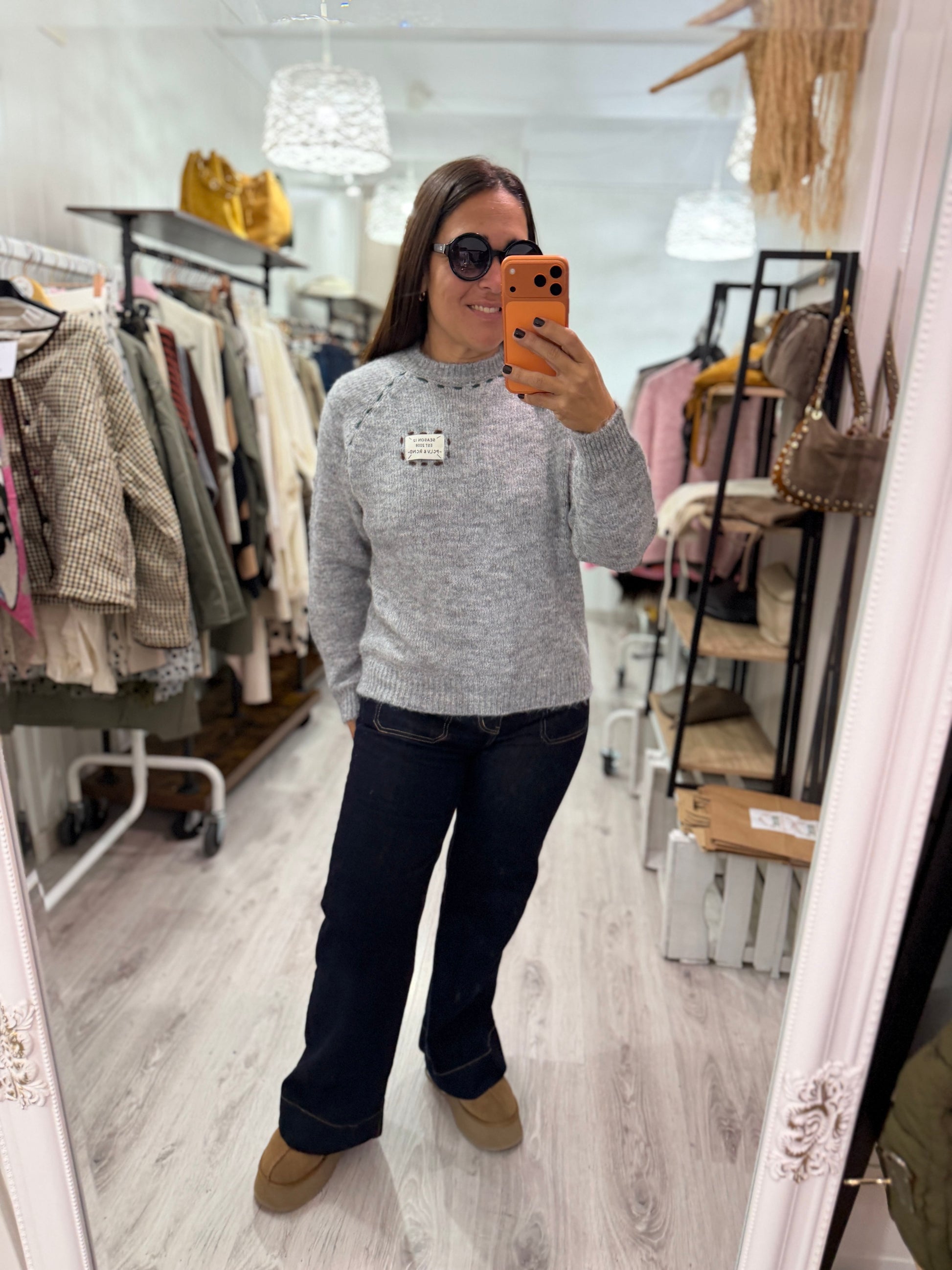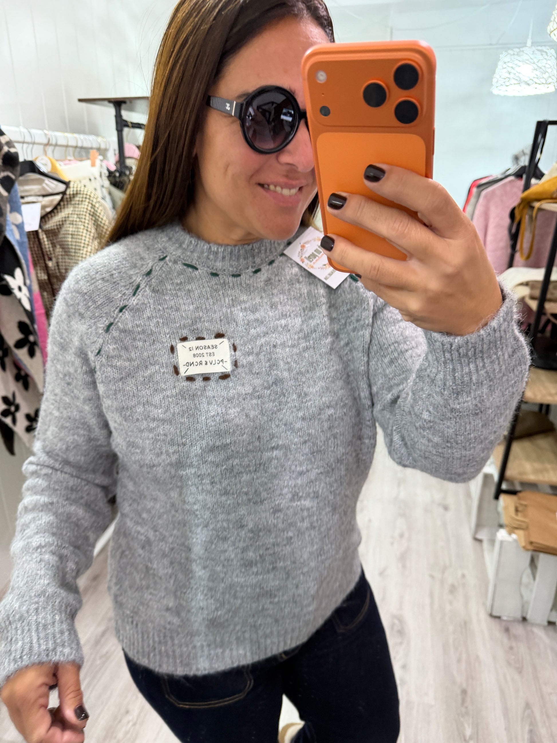 Cuello redondo, manga larga. Con pespunte a contraste, y etiqueta delantera.