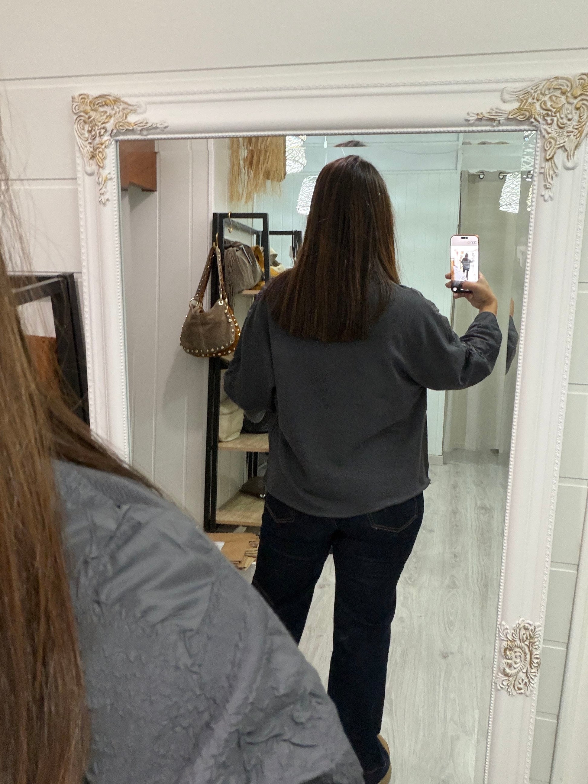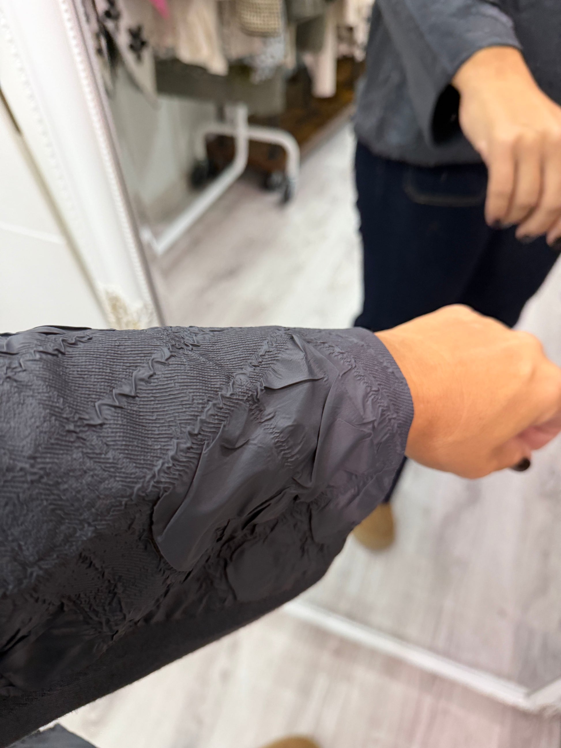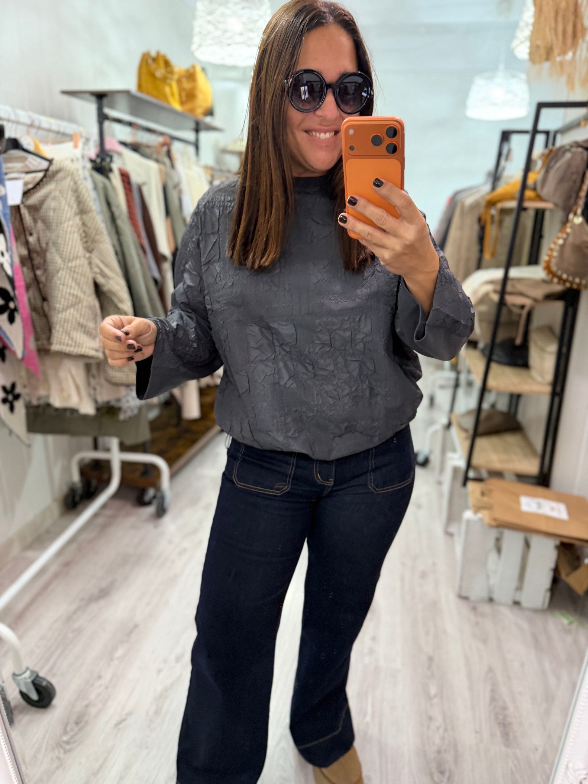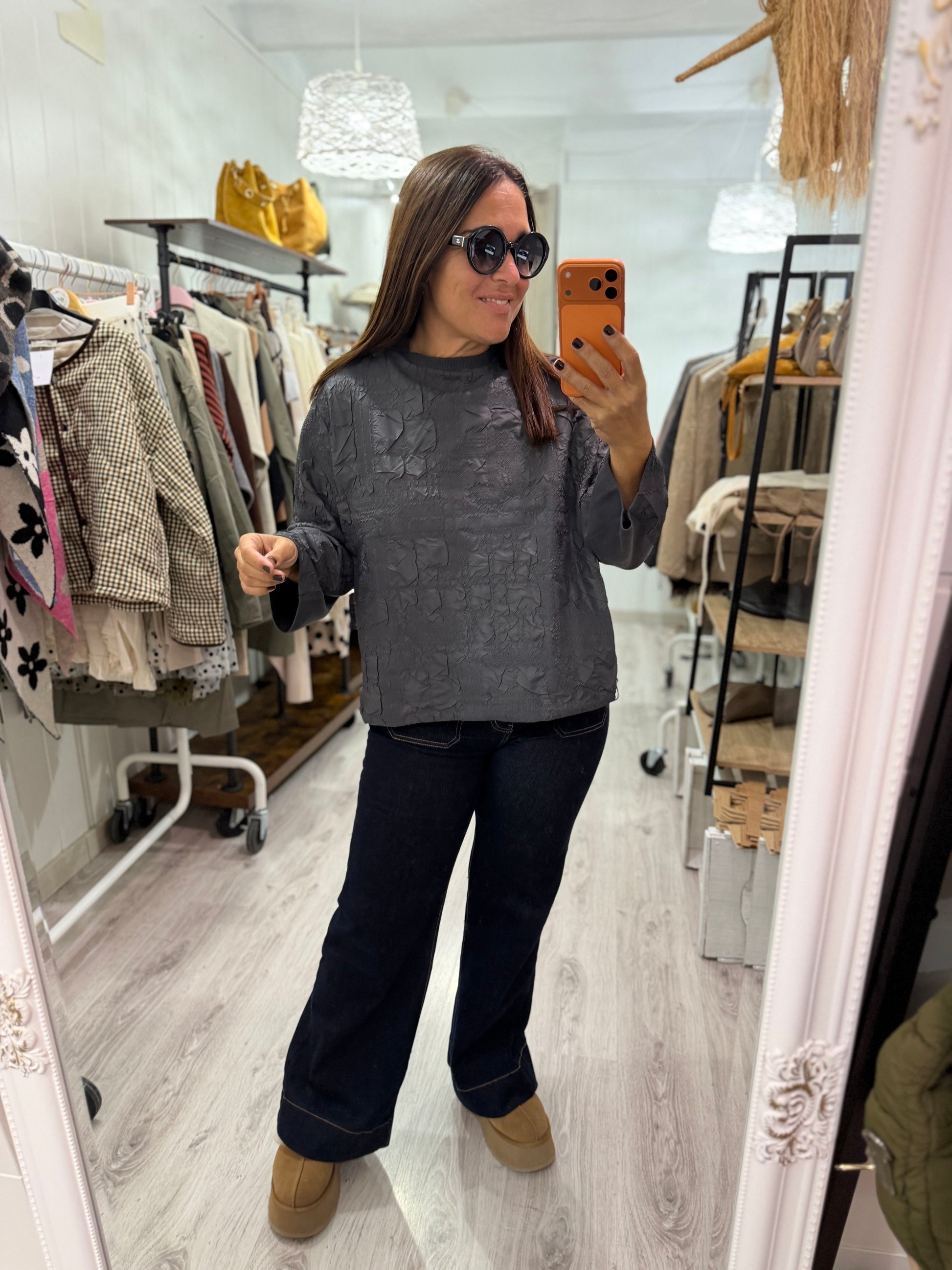 Parte delantera texturizada, de corte moderno oversize, con cuello redondo y manga larga.