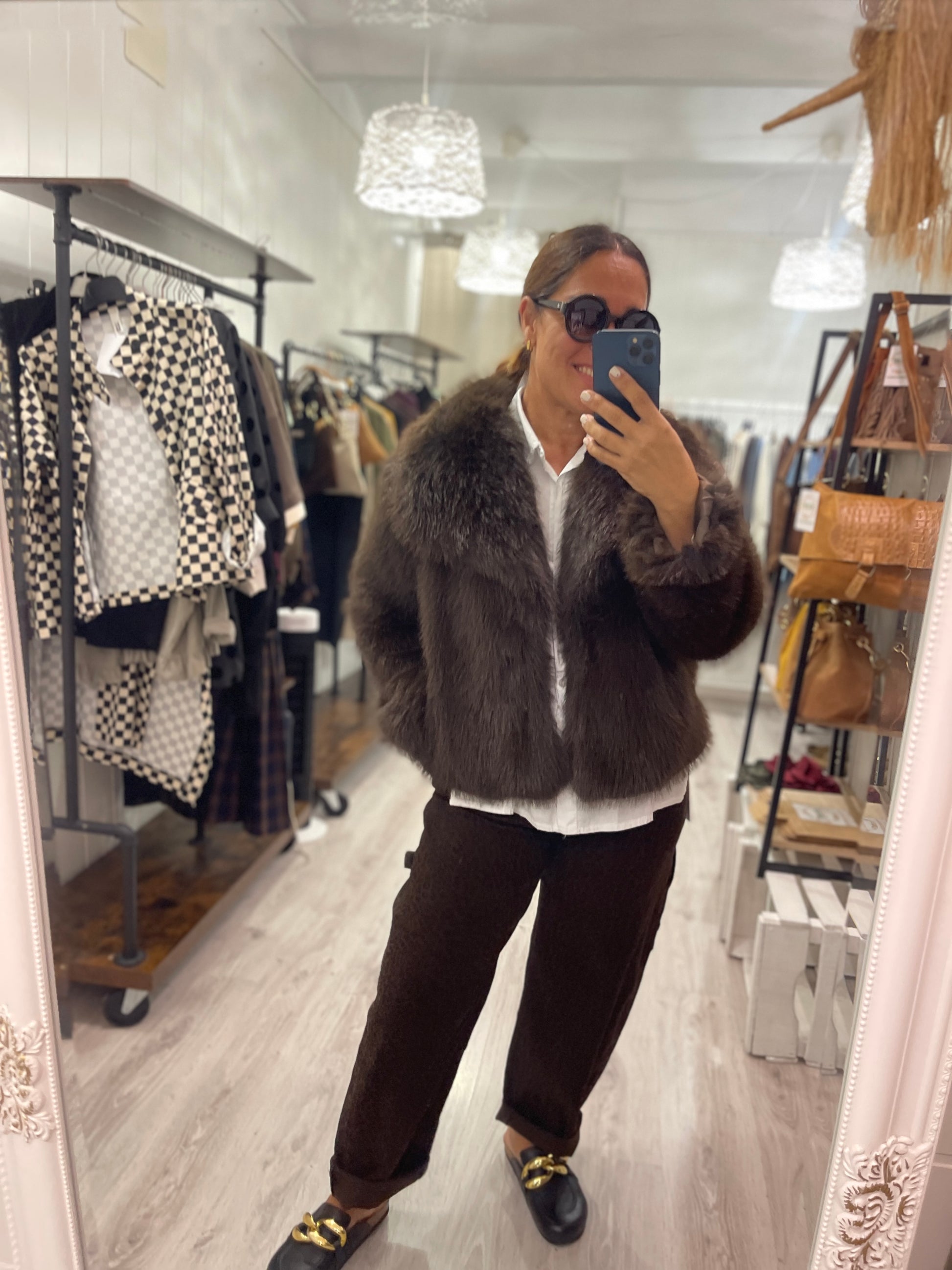 De corte tipo Barrel, con tiro medio, en estampado animal print en tonos chocolate y negro.