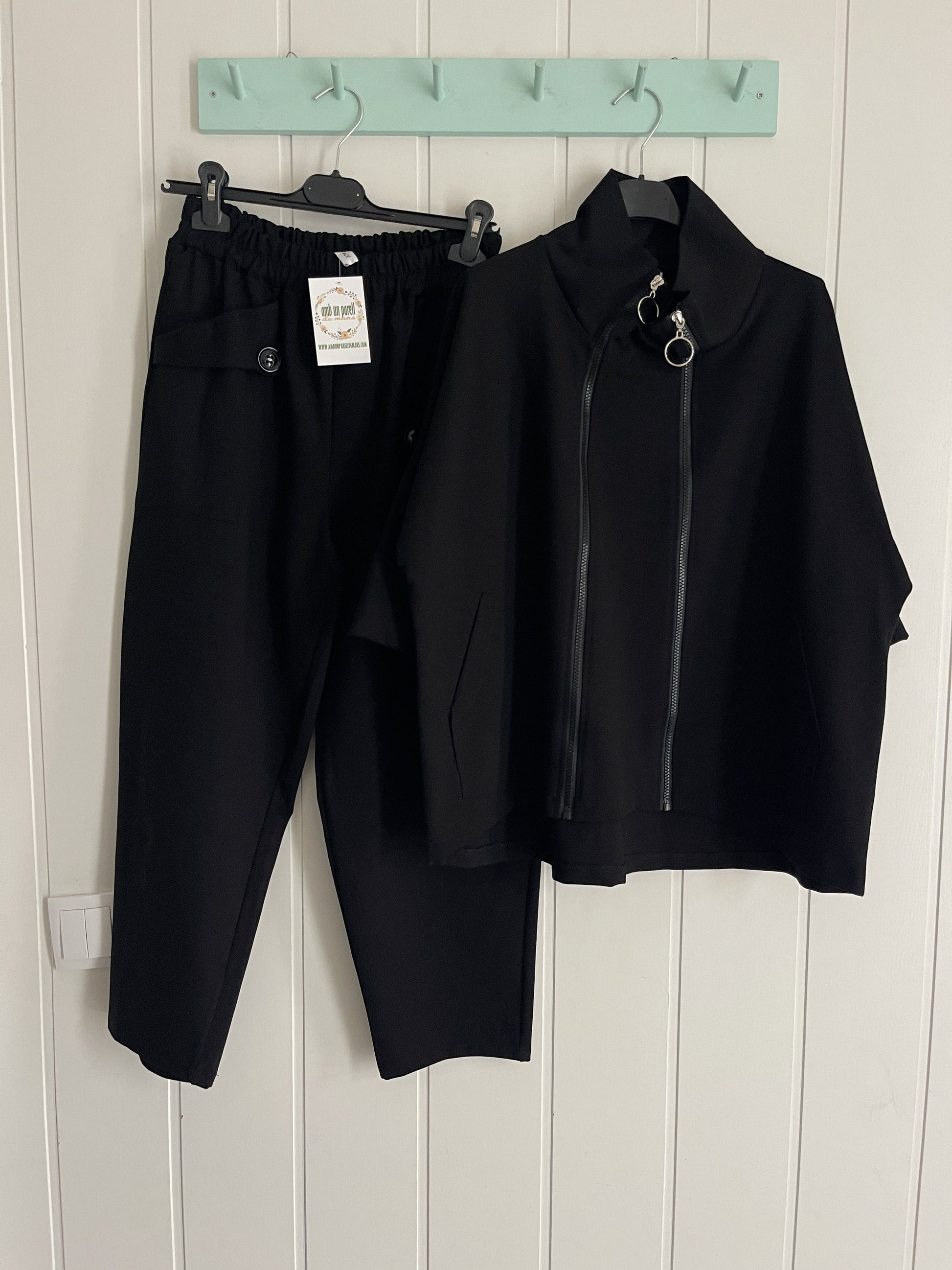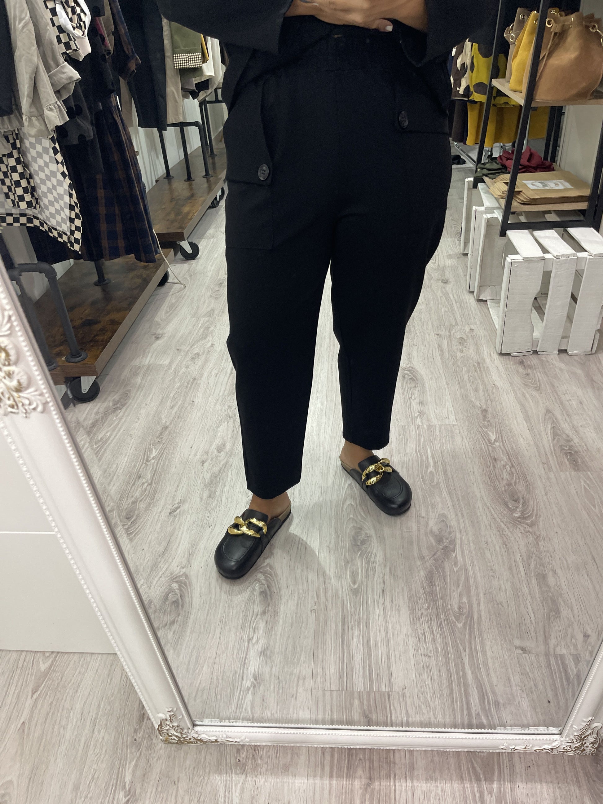 De punto roma, elástico, con cinturilla elástica, bolsillos y largo.