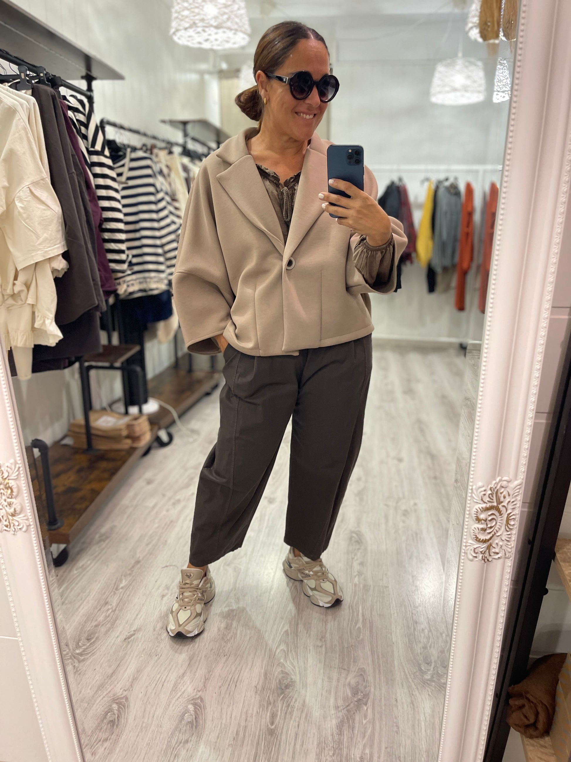 De corte barrell, con cinturilla elástica, bolsillos laterales y en el trasero.