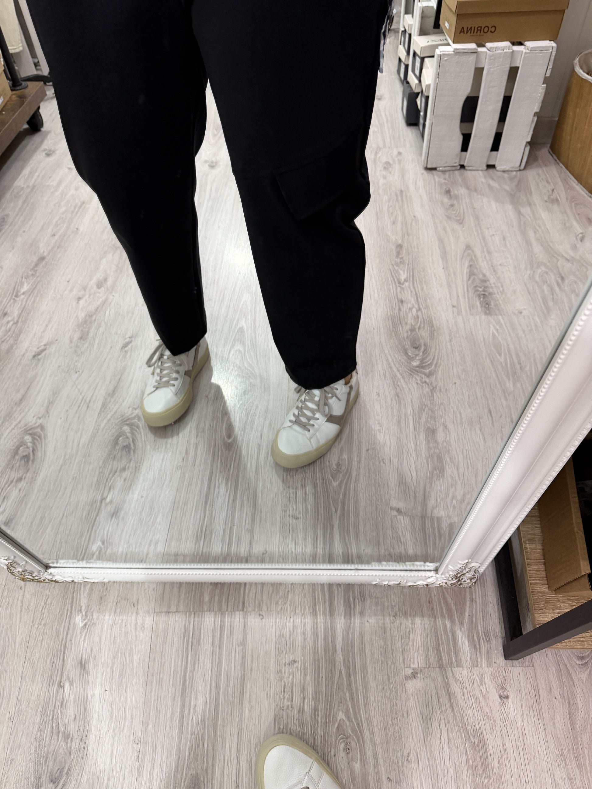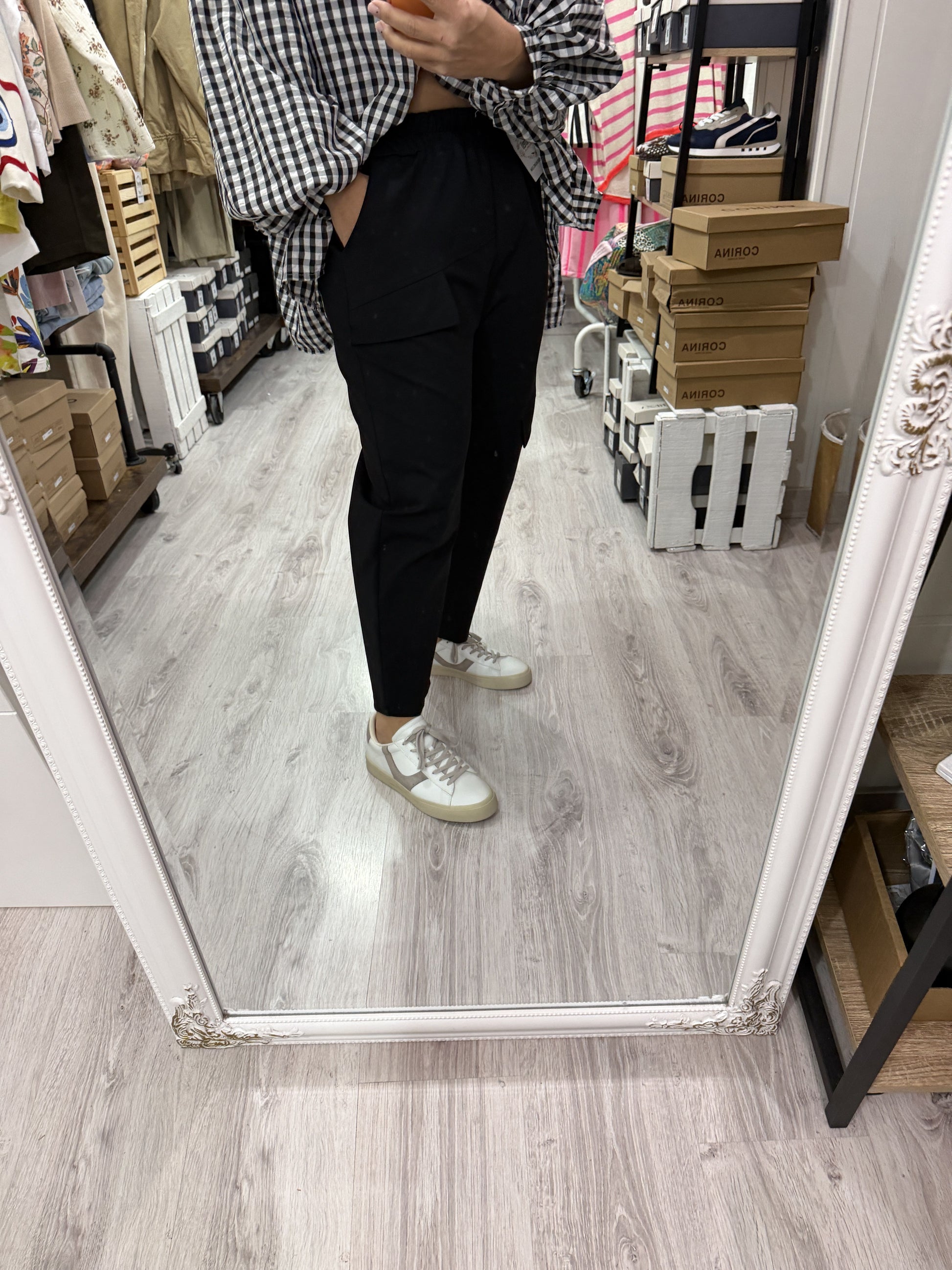 Con goma en la cinturilla, bolsillos y detalle de tapetas a diferentes alturas en las 2 piernas.