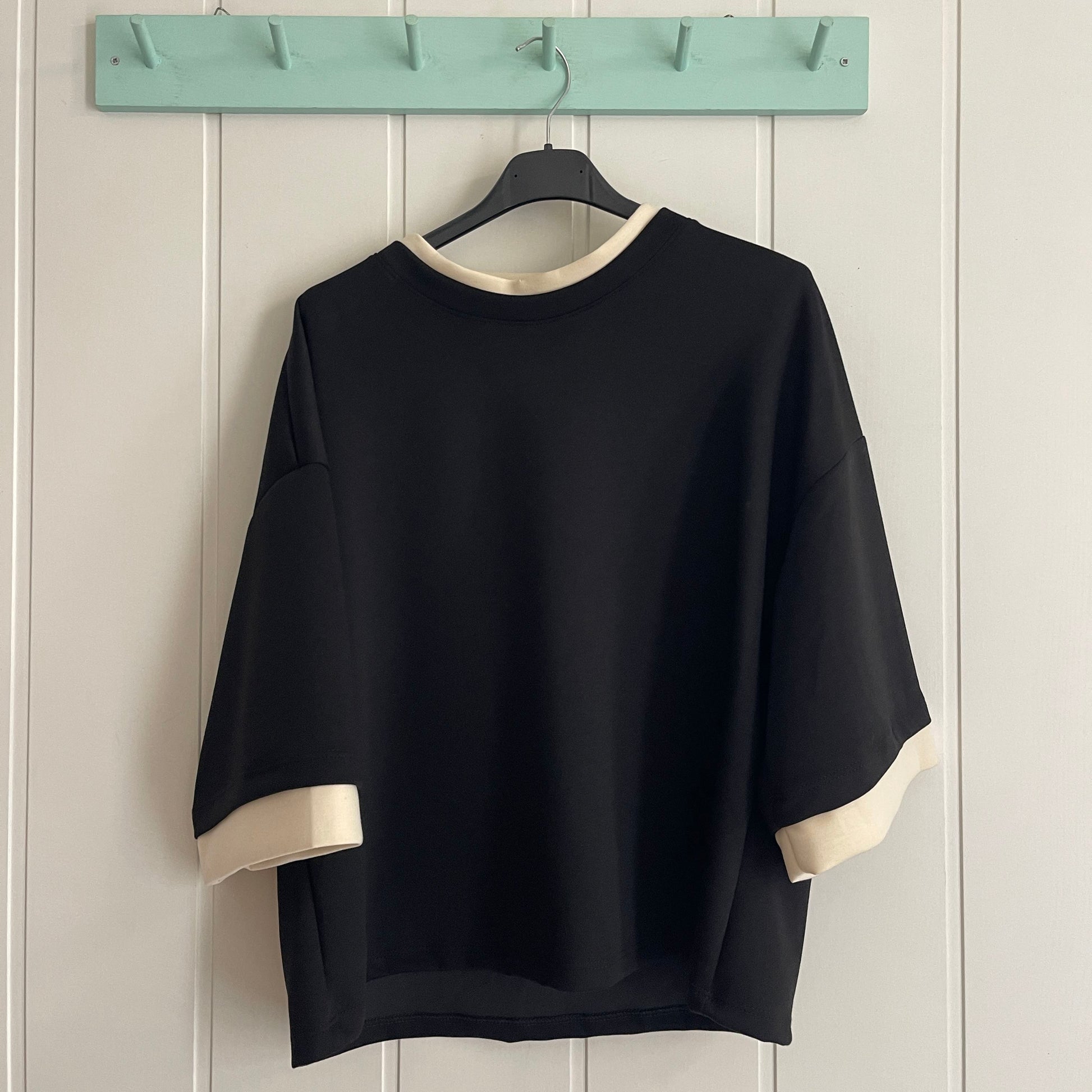 De manga al codo , tejido punto roma, con vivo en el cuello y manga de color marfil.