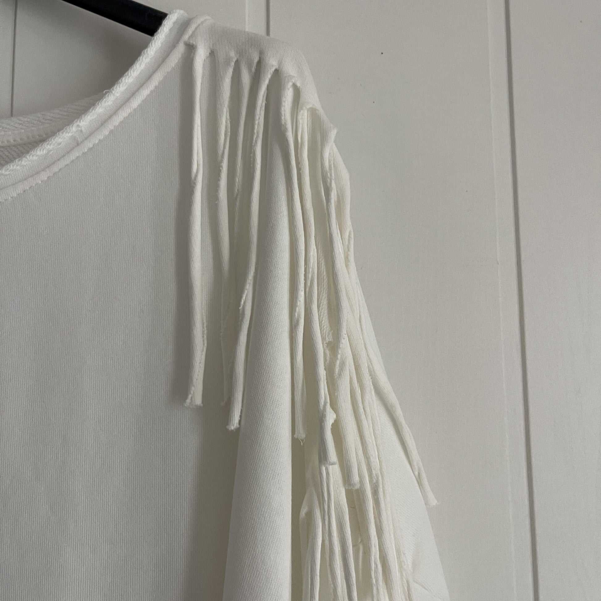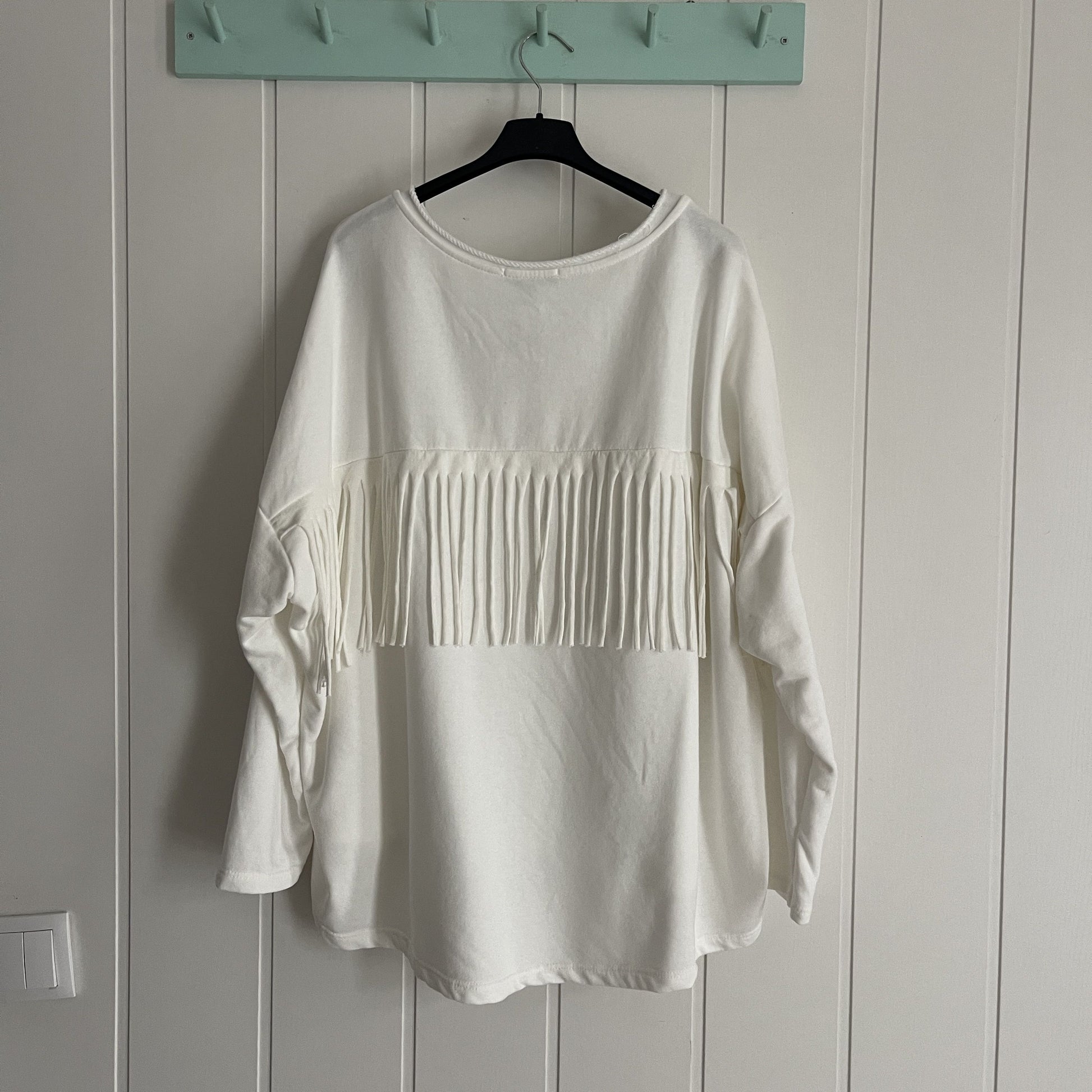 De corte oversize, cuello redondo, manga larga, con flecos delante y detrás.