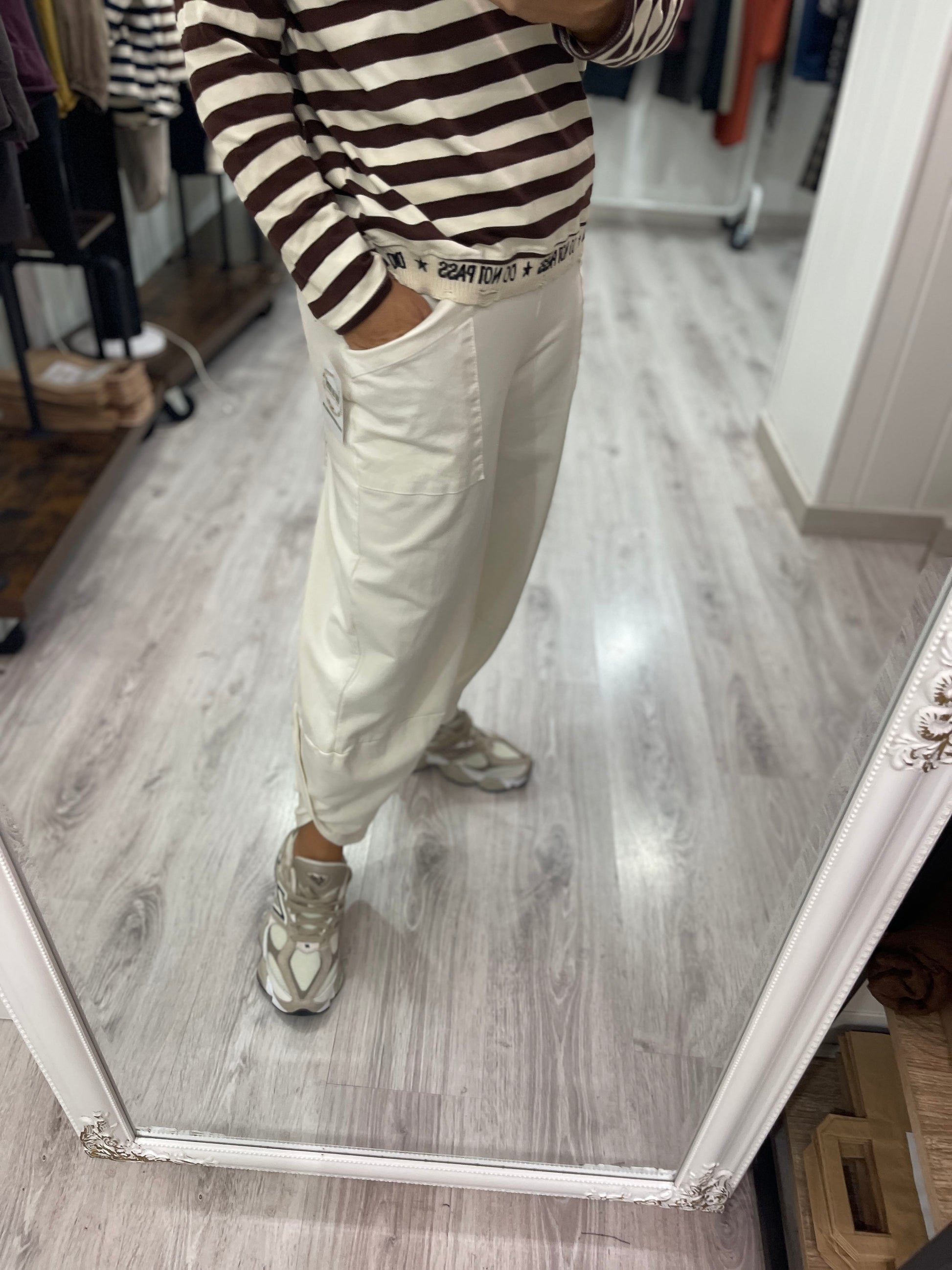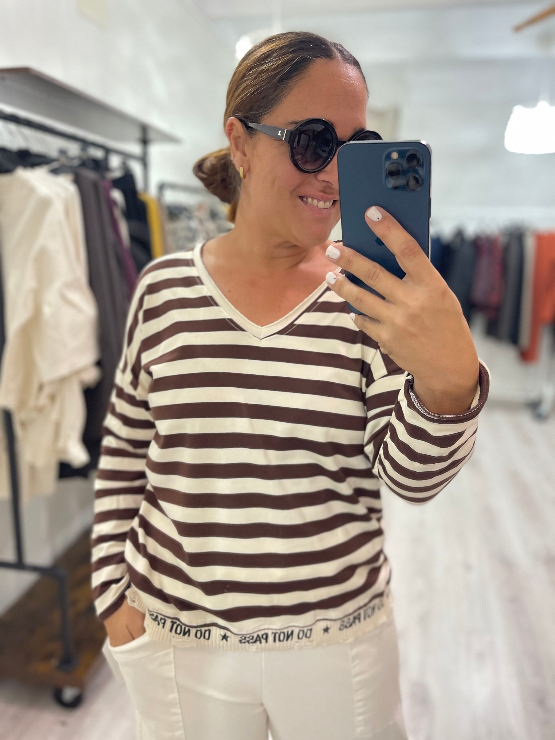 Cuello pico, con rayas horizontales, manga larga y detalle en el bajo escrito Do not pass.