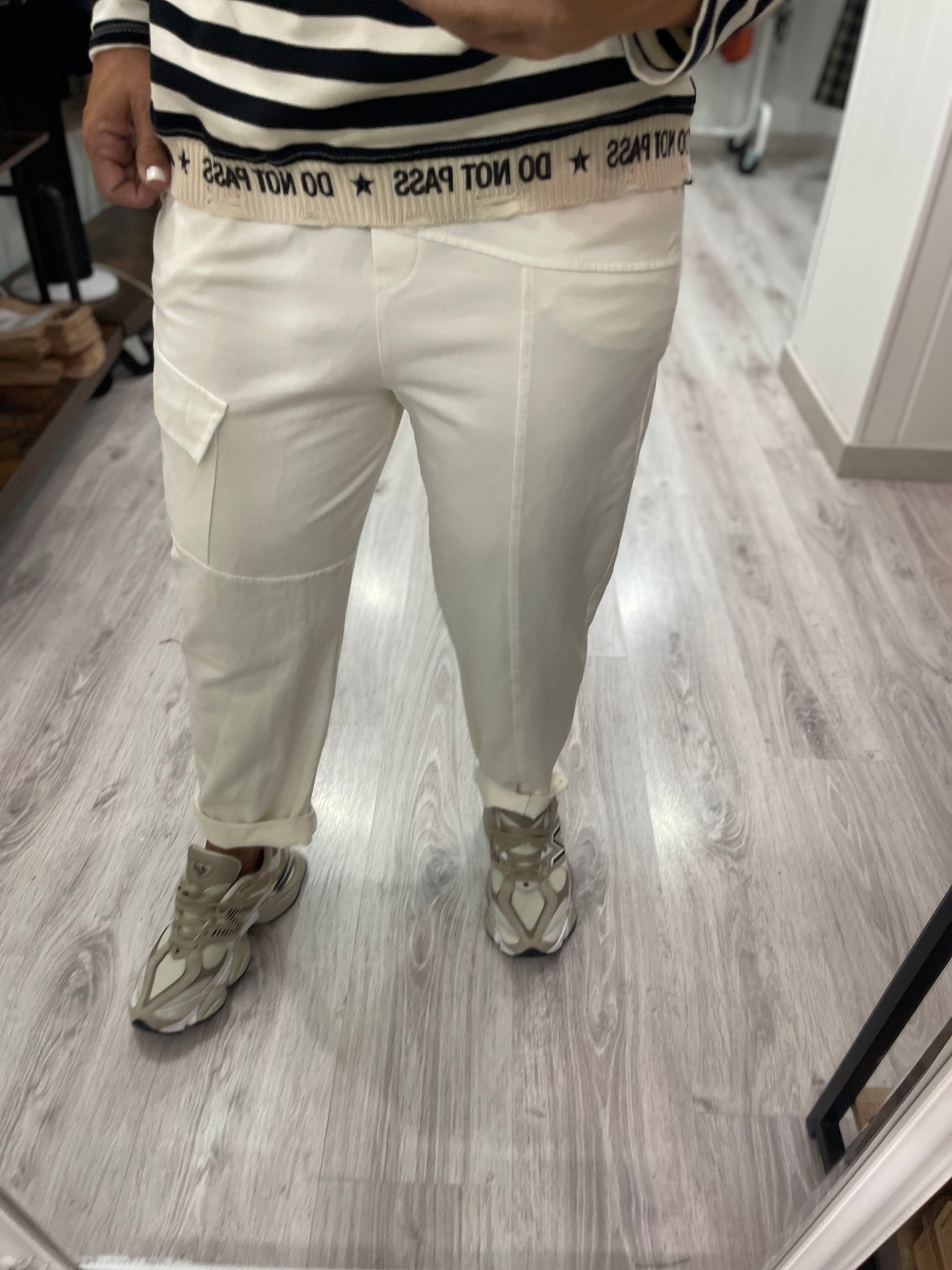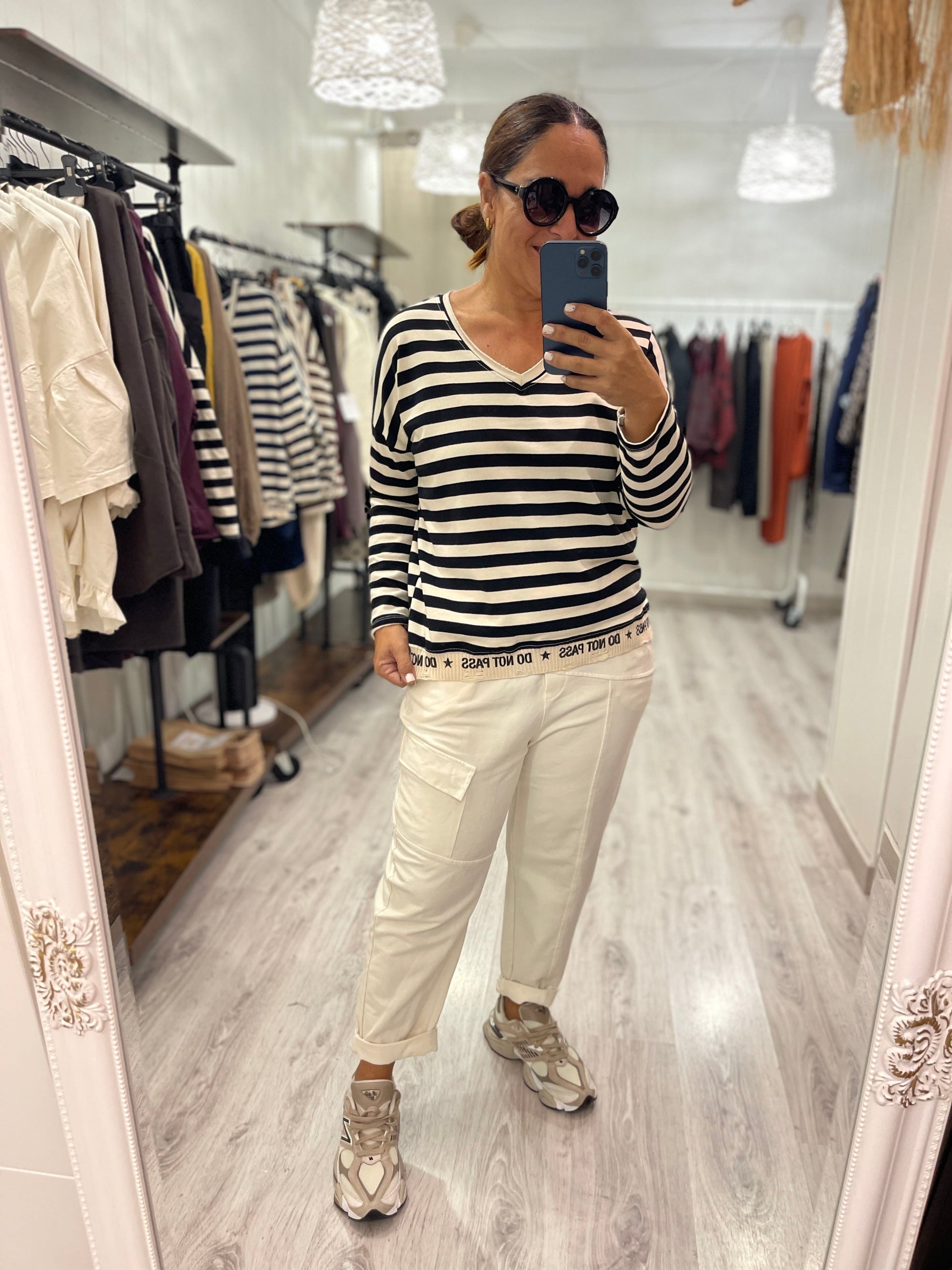 Cuello pico, con rayas horizontales, manga larga y detalle en el bajo escrito Do not pass.