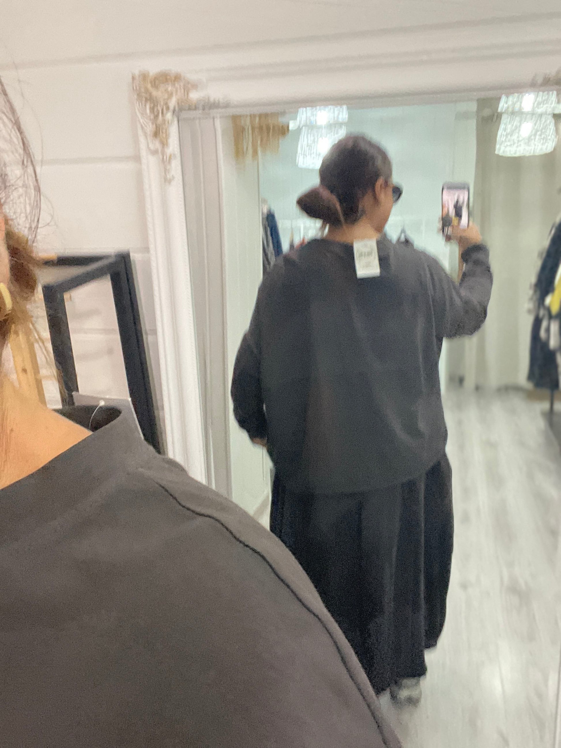 Con cuello redondo, manga larga, corte oversize, y con unas pinzas abajo que la hacen un poco abullonada.