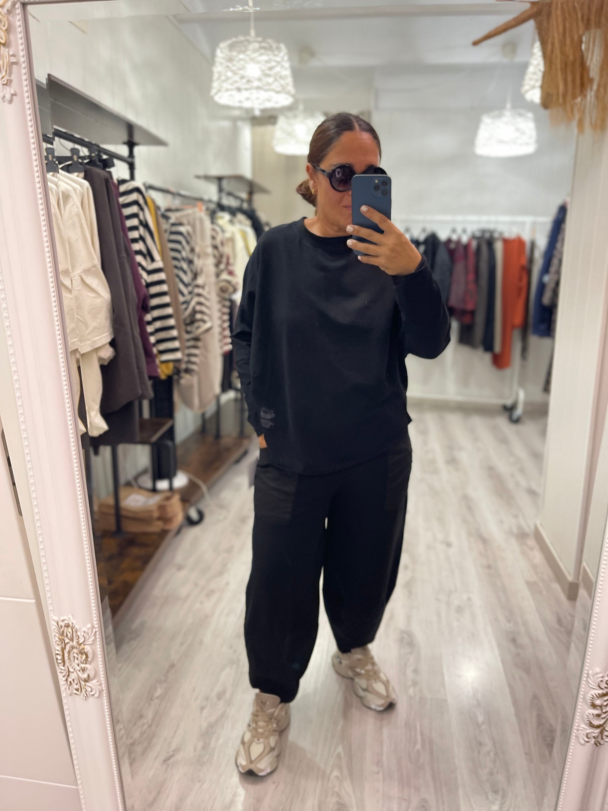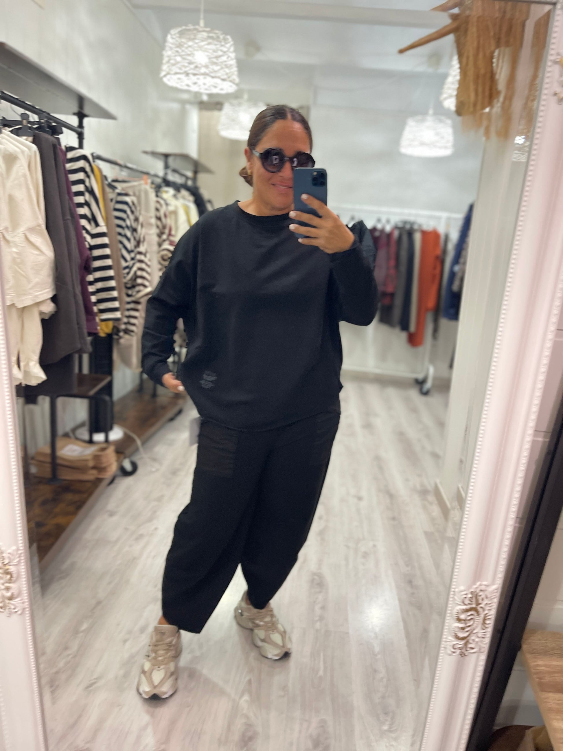 Con cuello redondo, manga larga, corte oversize, y con unas pinzas abajo que la hacen un poco abullonada.