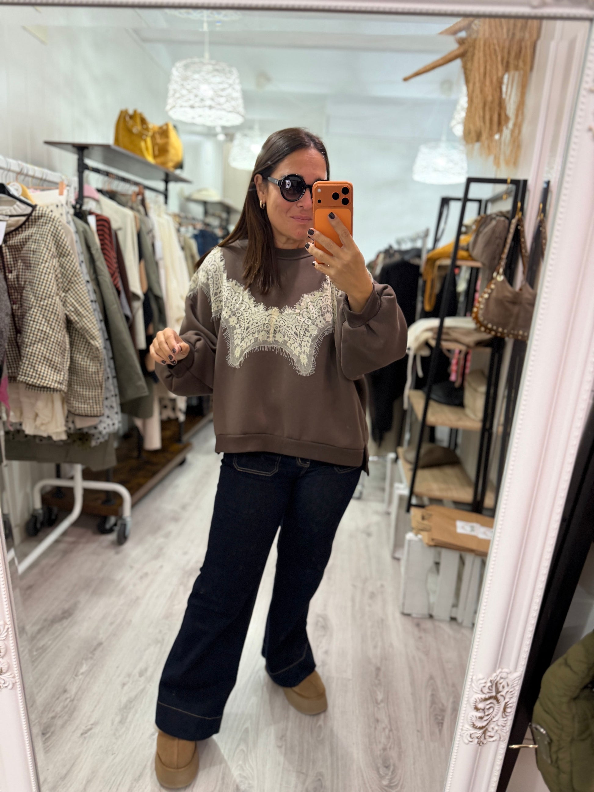 De corte oversize, con detalles de puntilla en el pecho, afelpada, súper calentita.