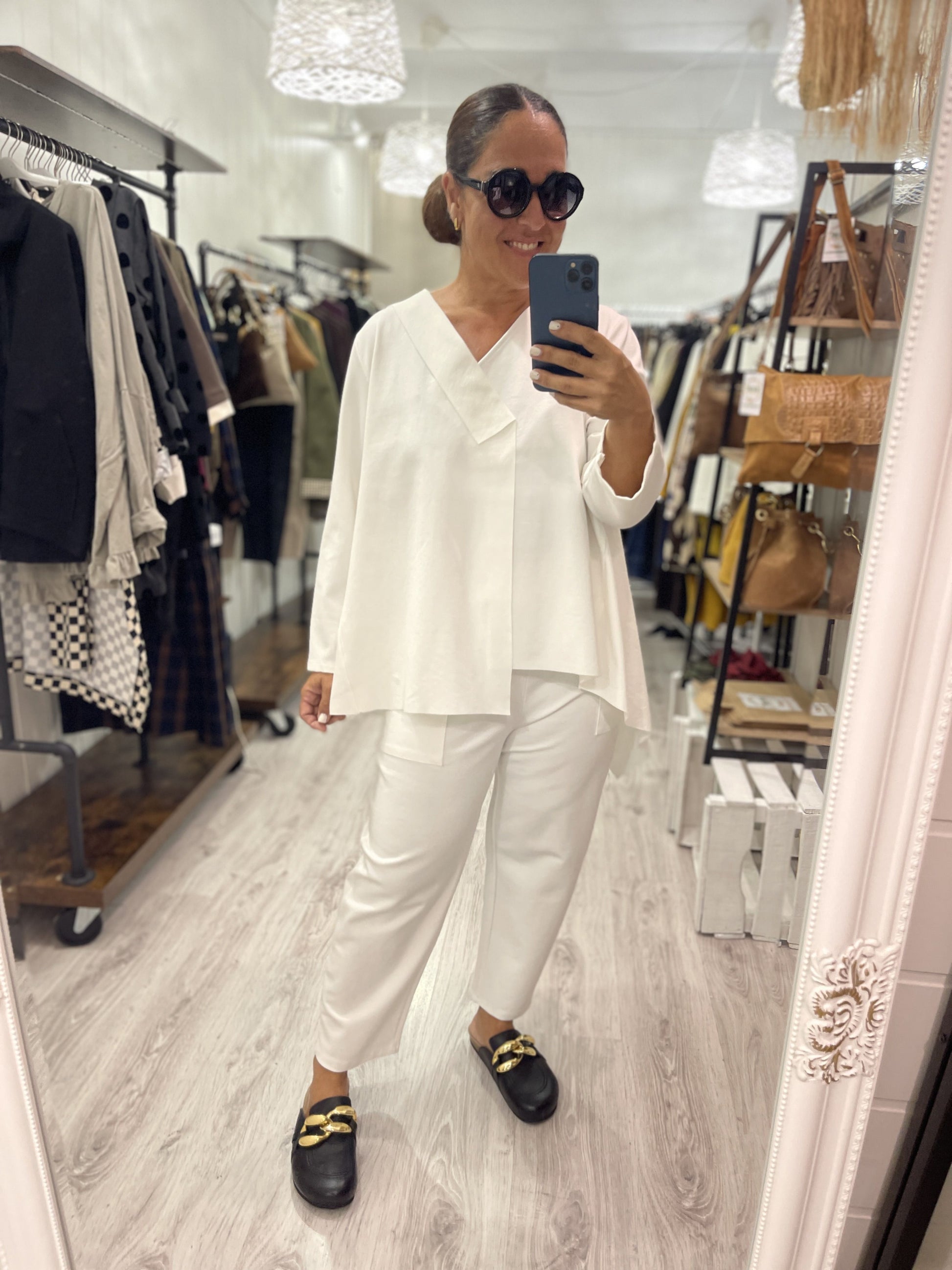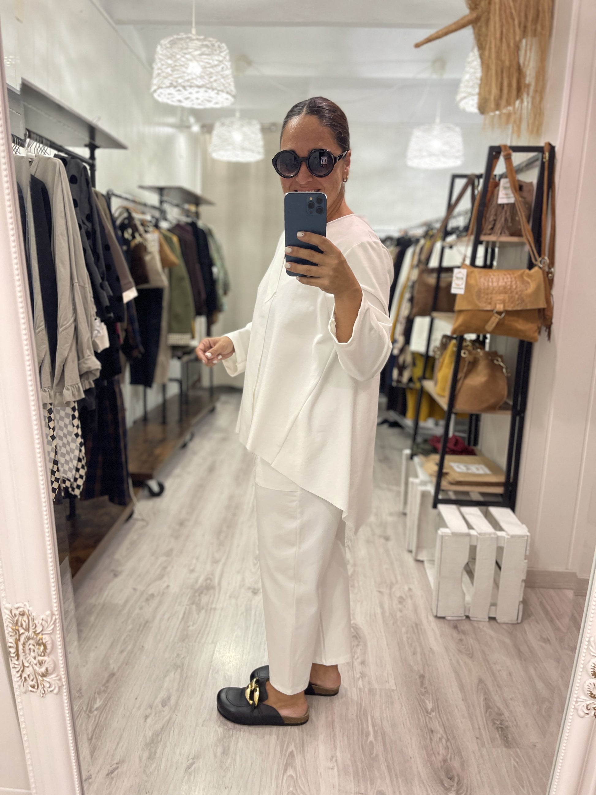 De punto roma, cuello pico, asimétrica, oversize y manga larga.