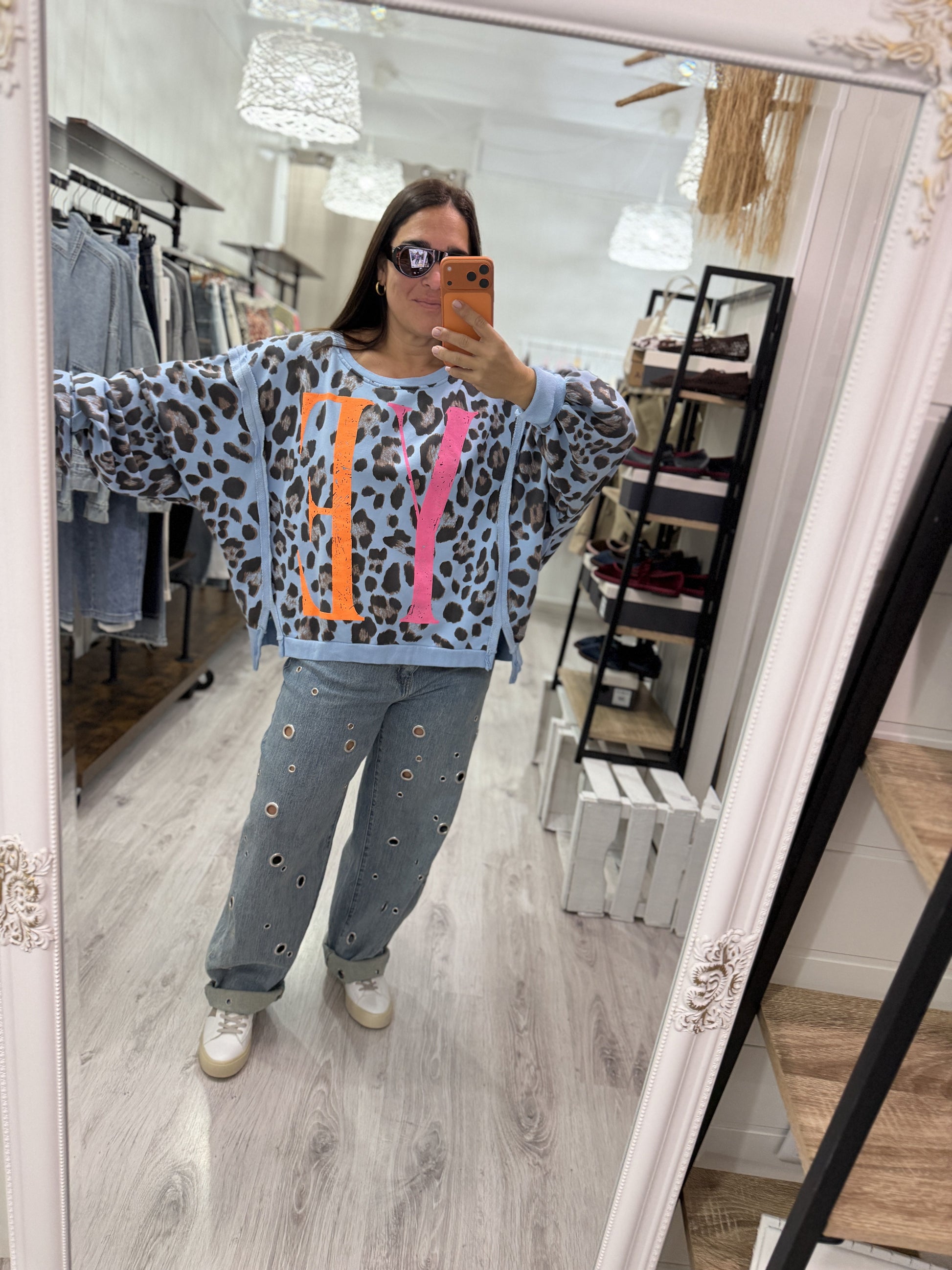 De corte muy oversize, cuello redondo, manga larga, más larga en la parte trasera, con letras en tonos flúor.