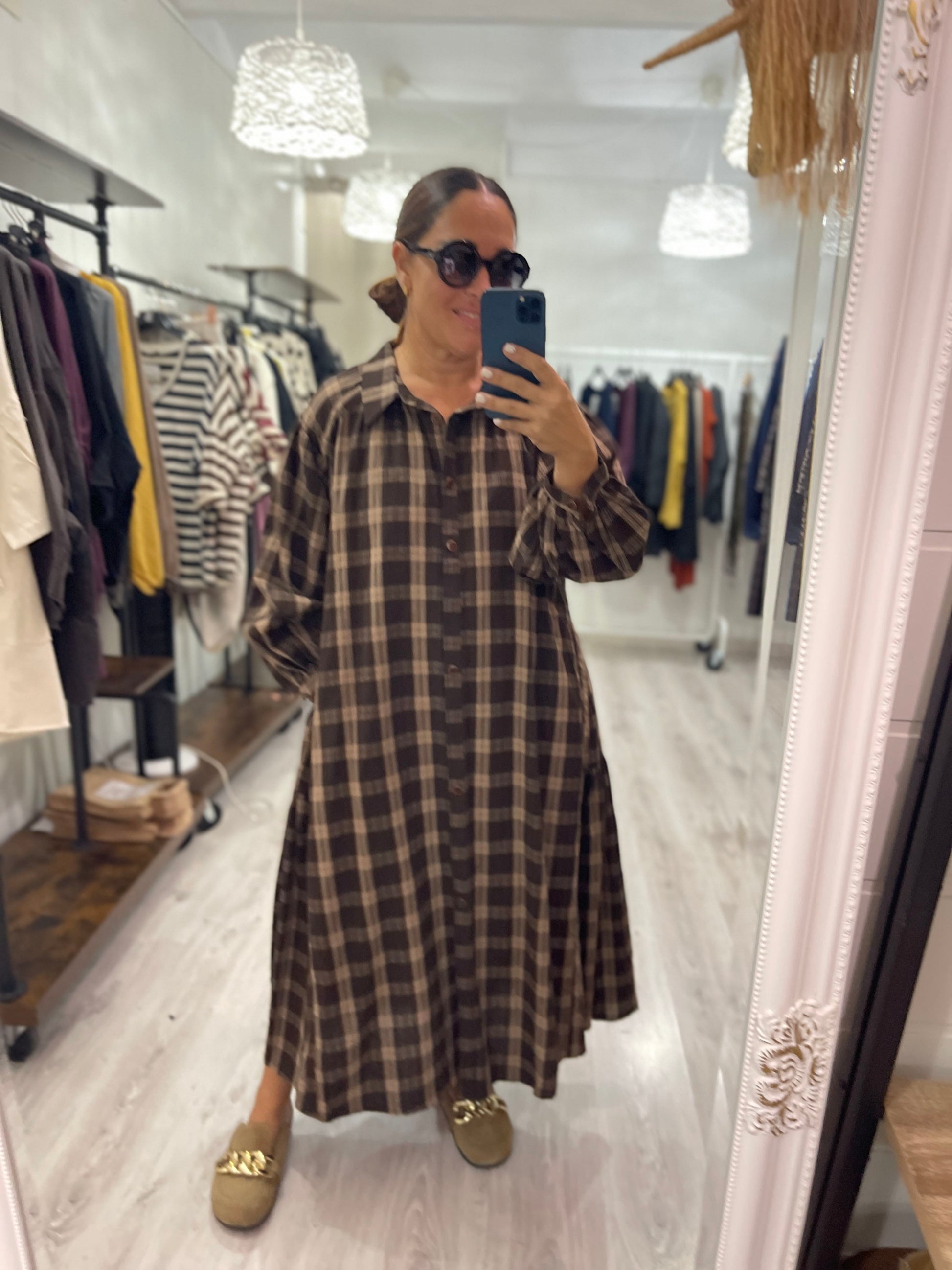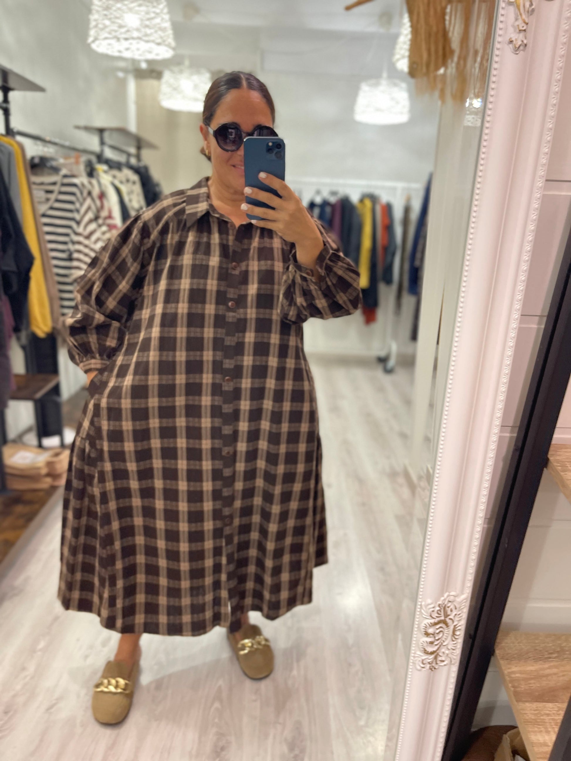 Cuello camisero, manga larga, abotonado al frente con botones, con bolsillos escondidos laterales, y corte ligeramente abombado en caderas.
